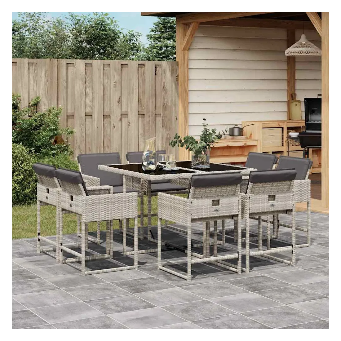 Cet ensemble de salle à manger de jardin est un excellent choix pour les repas en plein air ou pour vous détendre dans le jardin, l'arrière-cour ou le patio. Matériau durable : la résine tressée, également connue sous le nom de poly rotin, est un matériau synthétique solide et nécessitant peu d'entretien qui ressemble au rotin naturel. Il est léger, facile à nettoyer et couramment utilisé pour les meubles d'extérieur en raison de sa durabilité et de ses propriétés de résistance aux intempéries.Rangement compact : ces chaises sont dotées d'un dossier rabattable, ce qui permet de les ranger facilement sous la table. Une fois pliées, elles se rangent parfaitement sous la table, formant un cube peu encombrant.Expérience d'assise confortable : ce mobilier d'extérieur, doté de coussins épais, offre une expérience d'assise confortable.Housse amovible et lavable : ces coussins de siège sont dotés de housses amovibles pour un lavage et un entretien faciles. Les housses de coussin de chaise ont un rabat à l'arrière pour une fixation facile aux chaises.Dessus en verre : le dessus de la table de jardin est fabriqué en verre trempé solide et durable, ce qui le rend facile à nettoyer avec un chiffon humide et ajoute une touche d'élégance à votre espace extérieur. Bon à savoir :Pour que vos meubles d'extérieur restent beaux, nous vous recommandons de les protéger avec une housse imperméable.