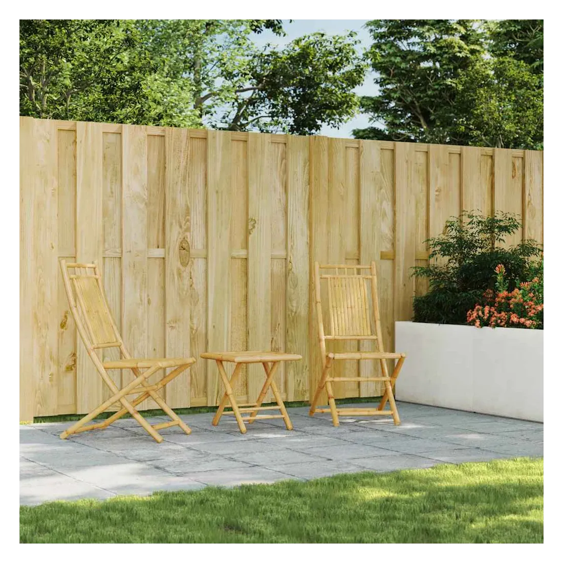 Savourez une tasse de café ou discutez avec votre famille et vos amis dans le jardin, l'arrière-cour ou sur le balcon avec cet ensemble de bistro ! Durable : en tant que matériau naturel, le bambou offre une bonne respirabilité et une faible odeur. Ces qualités rendent l’ensemble de bistro de jardin durable, résistant à l’eau et de longue durée.Design pliable : l'ensemble de bistro d'extérieur peut être facilement plié lorsqu'il n'est pas utilisé pour faciliter le rangement et le transport.Dessus stable : le dessus stable de la table de jardin est idéal pour placer votre boisson ou toute autre nécessité dont vous avez besoin à portée de main.Une expérience d'assise confortable : dotée d'un dossier, la chaise d'extérieur vous offre un confort optimal. Bon à savoir :Pour que vos meubles d'extérieur restent beaux, nous vous recommandons de les protéger avec une housse imperméable.