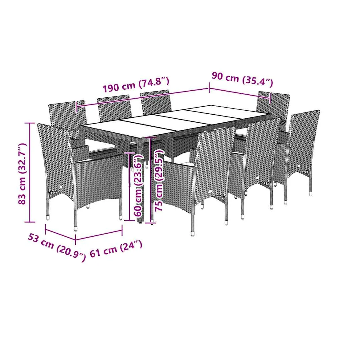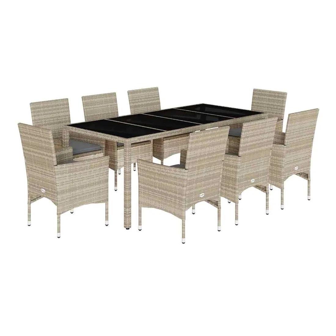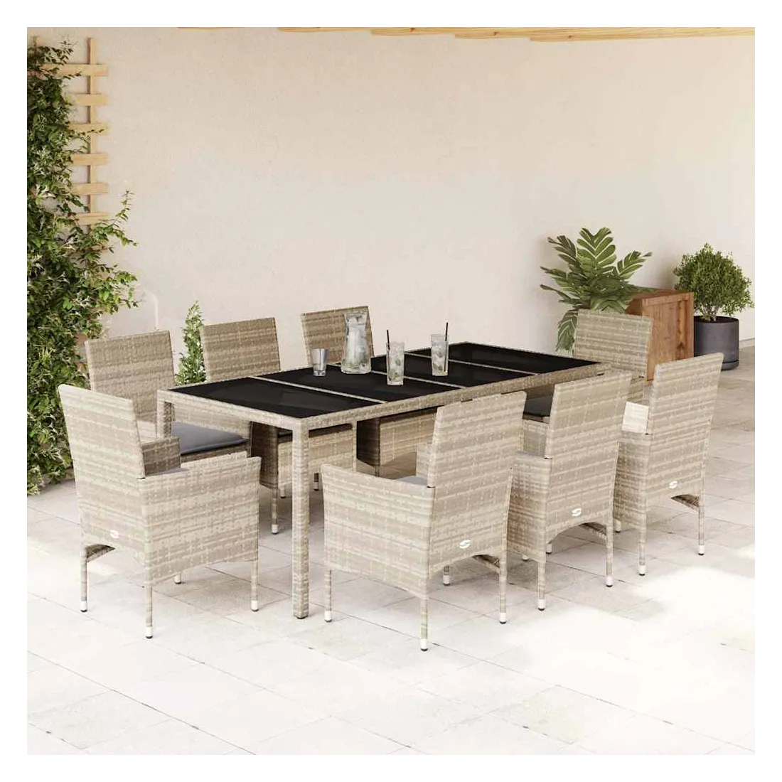Cet ensemble de salle à manger de jardin est un excellent choix pour les repas en plein air ou pour vous détendre dans le jardin, dans l'arrière-cour ou sur la terrasse. Matériau durable : la résine tressée, également connue sous le nom de poly rotin, est un matériau synthétique solide et nécessitant peu d'entretien qui ressemble au rotin naturel. Il est léger, facile à nettoyer et couramment utilisé pour les meubles d'extérieur en raison de sa durabilité et de ses propriétés de résistance aux intempéries.Expérience d'assise confortable : cet ensemble de meubles d'extérieur, doté de coussins épais, offre une expérience d'assise confortable.Housse amovible et lavable : ces coussins de siège sont dotés de housses amovibles pour un lavage et un entretien faciles.Dessus en verre : le dessus de la table d'extérieur est fabriqué en verre trempé solide et durable, ce qui le rend facile à nettoyer avec un chiffon humide et ajoute une touche d'élégance à votre espace extérieur. Bon à savoir :Pour que vos meubles d'extérieur restent beaux, nous vous recommandons de les protéger avec une housse imperméable.