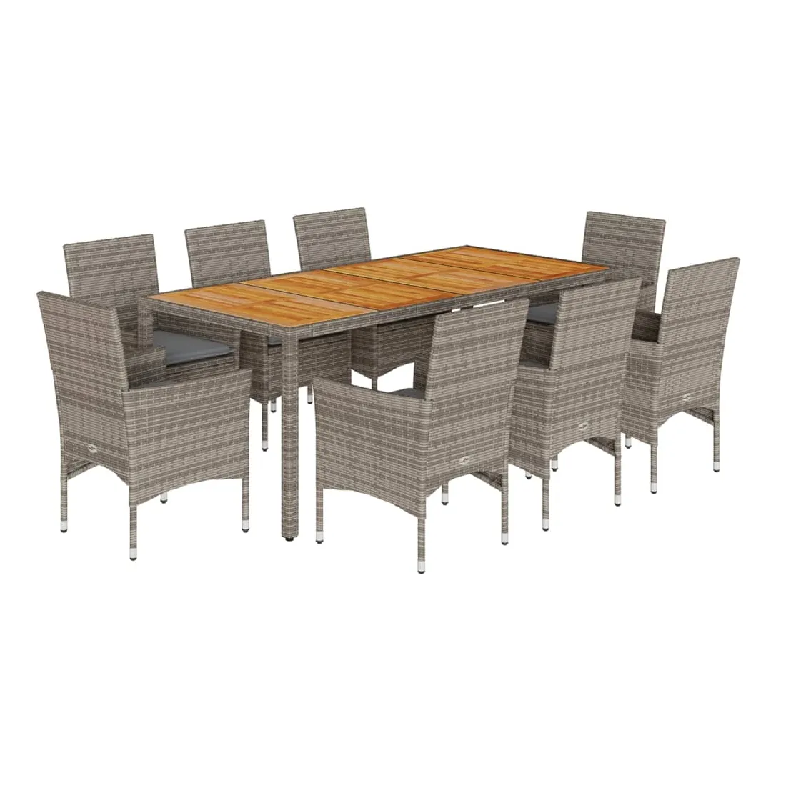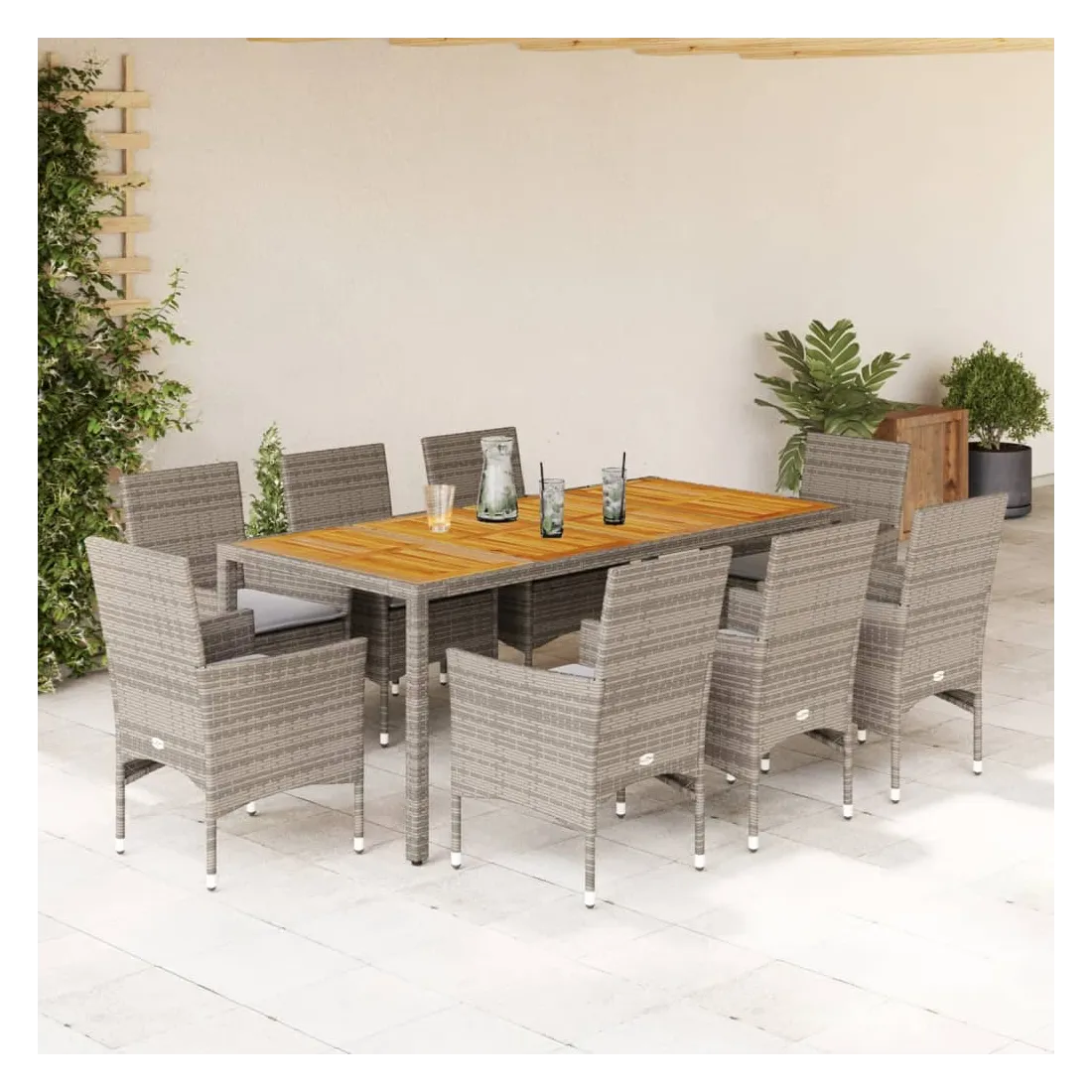 Cet ensemble de salle à manger de jardin est un excellent choix pour les repas en plein air ou pour vous détendre dans le jardin, dans l'arrière-cour ou sur la terrasse. Matériau durable : la résine tressée, également connue sous le nom de poly rotin, est un matériau synthétique solide et nécessitant peu d'entretien qui ressemble au rotin naturel. Il est léger, facile à nettoyer et couramment utilisé pour les meubles d'extérieur en raison de sa durabilité et de ses propriétés de résistance aux intempéries.Expérience d'assise confortable : cet ensemble de meubles d'extérieur, doté de coussins épais, offre une expérience d'assise confortable.Housse amovible et lavable : ces coussins de siège sont dotés de housses amovibles pour un lavage et un entretien faciles.Dessus stable et facile à nettoyer : cette table de jardin a un dessus en bois d'acacia robuste, durable et facile à nettoyer avec un chiffon humide. Bon à savoir :Pour que vos meubles d'extérieur restent beaux, nous vous recommandons de les protéger avec une housse imperméable.