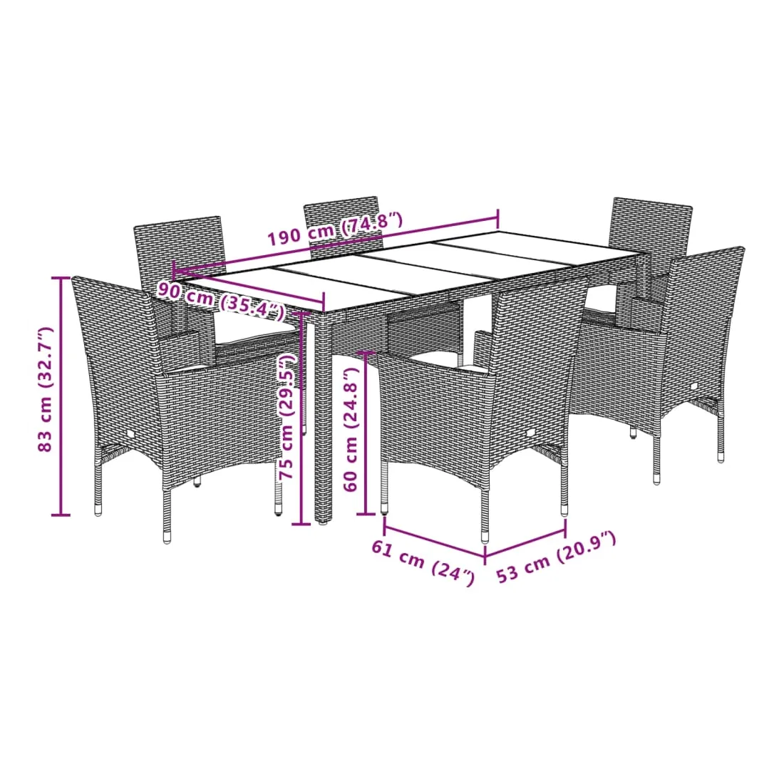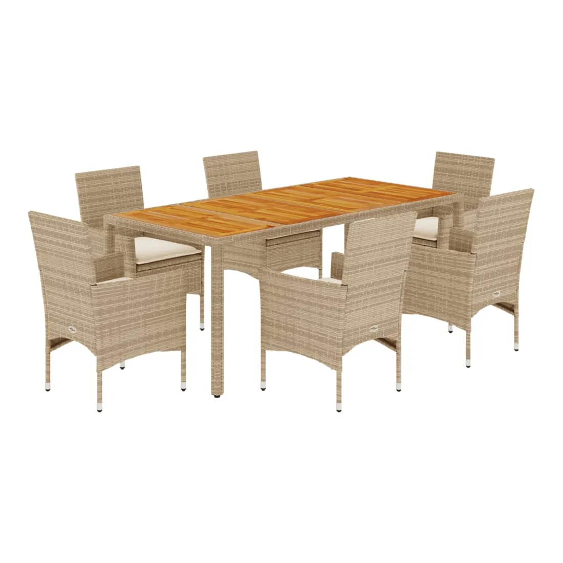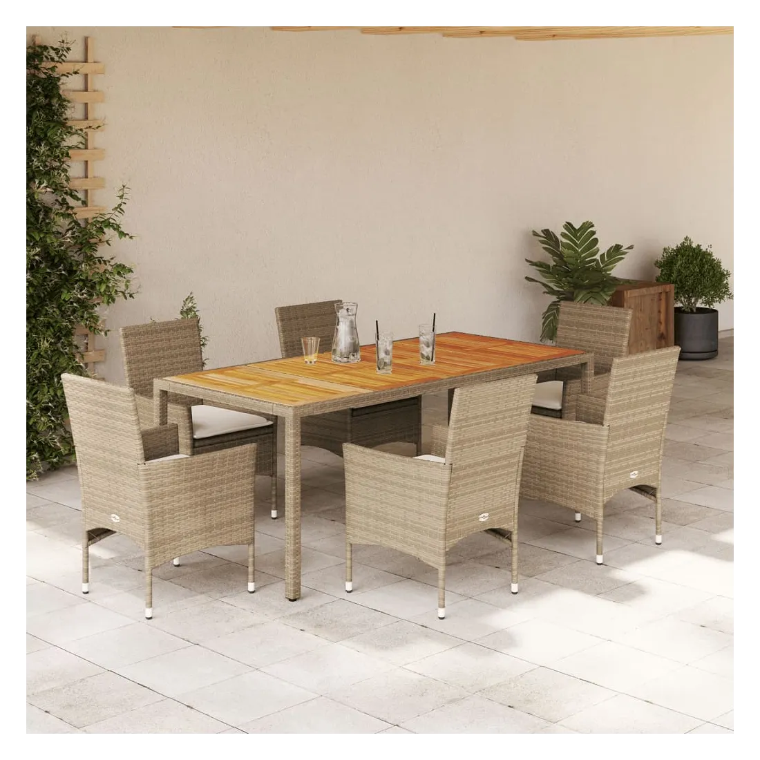 Cet ensemble de salle à manger de jardin est un excellent choix pour les repas en plein air ou pour vous détendre dans le jardin, dans l'arrière-cour ou sur la terrasse. Matériau durable : la résine tressée, également connue sous le nom de poly rotin, est un matériau synthétique solide et nécessitant peu d'entretien qui ressemble au rotin naturel. Il est léger, facile à nettoyer et couramment utilisé pour les meubles d'extérieur en raison de sa durabilité et de ses propriétés de résistance aux intempéries.Expérience d'assise confortable : cet ensemble de meubles d'extérieur, doté de coussins épais, offre une expérience d'assise confortable.Housse amovible et lavable : ces coussins de siège sont dotés de housses amovibles pour un lavage et un entretien faciles.Dessus stable et facile à nettoyer : cette table de jardin a un dessus en bois d'acacia robuste, durable et facile à nettoyer avec un chiffon humide. Bon à savoir :Pour que vos meubles d'extérieur restent beaux, nous vous recommandons de les protéger avec une housse imperméable.