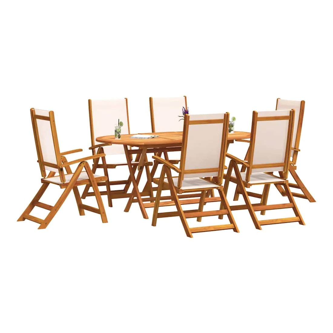 Profitez d'un bon repas en plein air avec votre famille et vos amis avec cet ensemble de salle à manger de jardin en bois ! Bois d'acacia massif : l'ensemble à manger d’extérieur est fabriqué en bois d'acacia massif. Le bois d'acacia massif est un beau matériau naturel. Le bois d'acacia est un bois dur tropical, dense, robuste et durable. Fonction réglable et pliable : la chaise de jardin peut être réglée en 5 positions, afin que vous puissiez toujours trouver la position d'assise la plus confortable. Elle peut également être repliée pour économiser de l'espace lorsqu'elle n'est pas utilisée. Design pratique : le dessus de table est doté d'un trou pour parasol, ce qui vous permet de fixer facilement un parasol pour créer un coin ombragé. Dessus de table robuste : cette table à manger de jardin vous offre un dessus de table solide. Vous pouvez placer vos collations, boissons et n'importe laquelle de vos décorations préférées. Surface facile à nettoyer : la surface à finition à l'huile rend cette table et ces chaises de jardin faciles à nettoyer avec un chiffon humide. Bon à savoir :Pour que vos meubles d'extérieur restent beaux, nous vous recommandons de les protéger avec une housse imperméable.