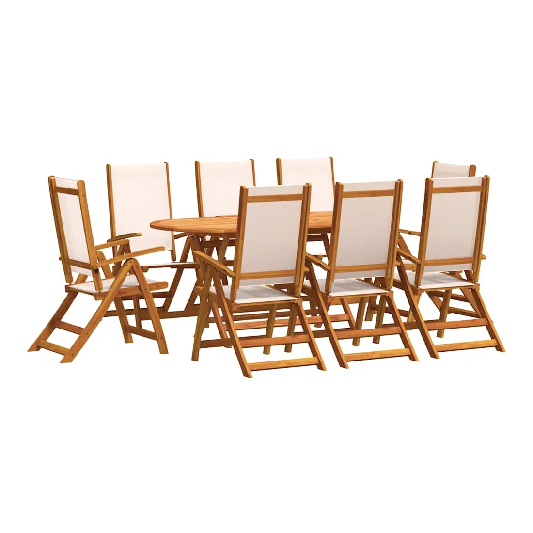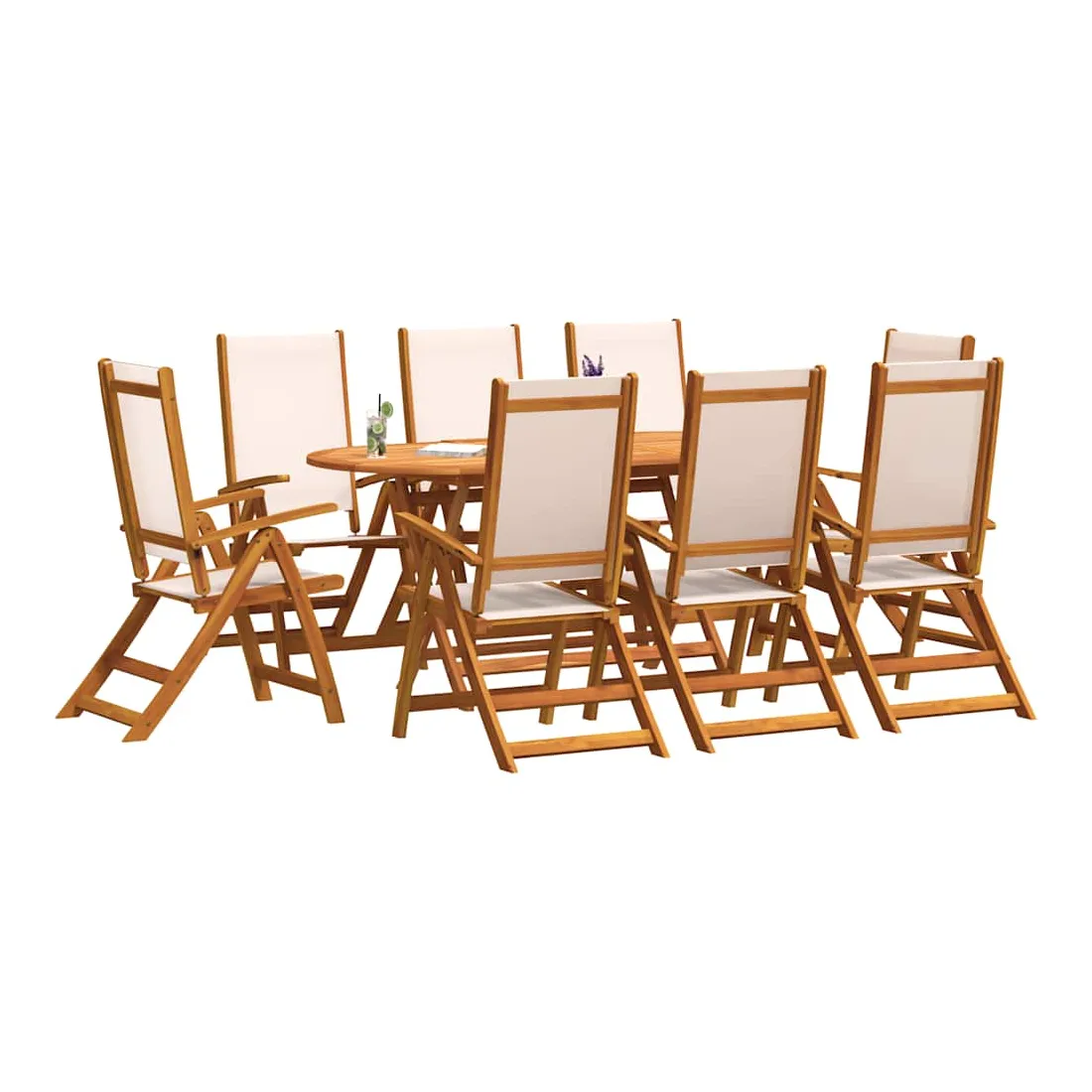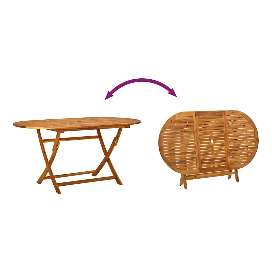 Profitez d'un bon repas en plein air avec votre famille et vos amis avec cet ensemble de salle à manger de jardin en bois ! Bois d'acacia massif : l'ensemble à manger d’extérieur est fabriqué en bois d'acacia massif. Le bois d'acacia massif est un beau matériau naturel. Le bois d'acacia est un bois dur tropical, dense, robuste et durable. Fonction réglable et pliable : la chaise de jardin peut être réglée en 5 positions, afin que vous puissiez toujours trouver la position d'assise la plus confortable. Elle peut également être repliée pour économiser de l'espace lorsqu'elle n'est pas utilisée. Design pratique : le dessus de table est doté d'un trou pour parasol, ce qui vous permet de fixer facilement un parasol pour créer un coin ombragé. Dessus de table robuste : cette table à manger de jardin vous offre un dessus de table solide. Vous pouvez placer vos collations, boissons et n'importe laquelle de vos décorations préférées. Surface facile à nettoyer : la surface à finition à l'huile rend cette table et ces chaises de jardin faciles à nettoyer avec un chiffon humide. Bon à savoir :Pour que vos meubles d'extérieur restent beaux, nous vous recommandons de les protéger avec une housse imperméable.