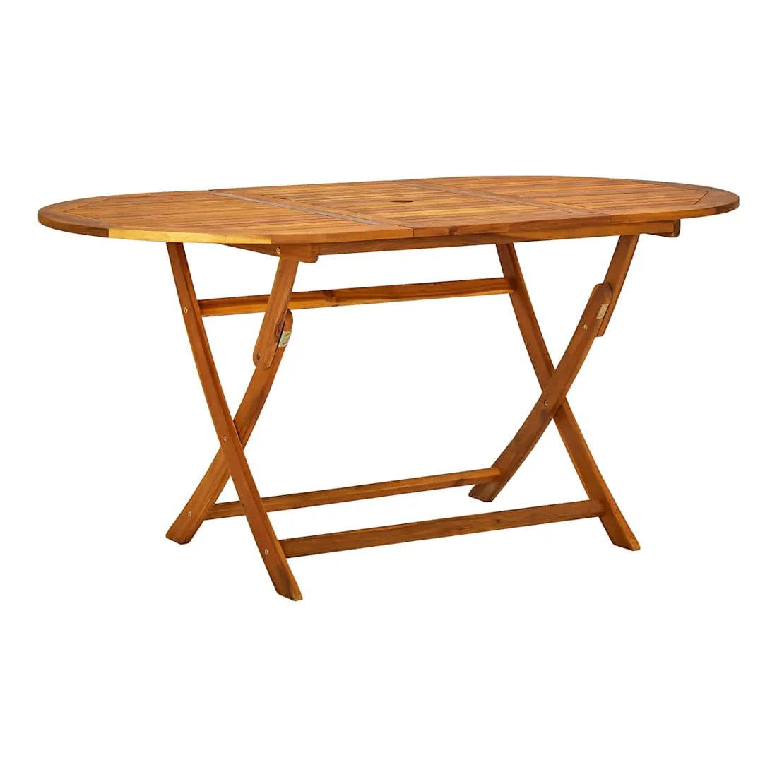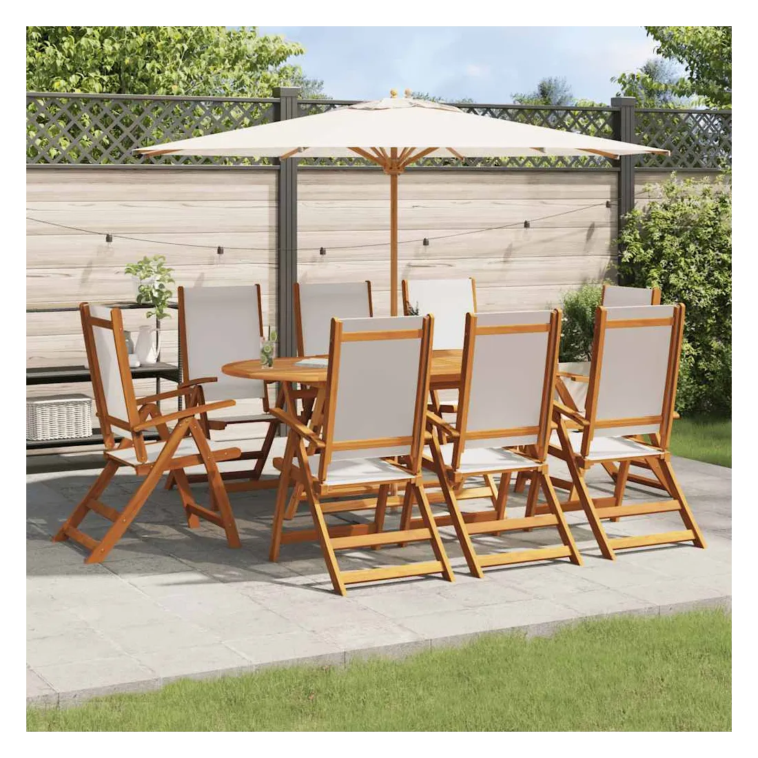Profitez d'un bon repas en plein air avec votre famille et vos amis avec cet ensemble de salle à manger de jardin en bois ! Bois d'acacia massif : l'ensemble à manger d’extérieur est fabriqué en bois d'acacia massif. Le bois d'acacia massif est un beau matériau naturel. Le bois d'acacia est un bois dur tropical, dense, robuste et durable. Fonction réglable et pliable : la chaise de jardin peut être réglée en 5 positions, afin que vous puissiez toujours trouver la position d'assise la plus confortable. Elle peut également être repliée pour économiser de l'espace lorsqu'elle n'est pas utilisée. Design pratique : le dessus de table est doté d'un trou pour parasol, ce qui vous permet de fixer facilement un parasol pour créer un coin ombragé. Dessus de table robuste : cette table à manger de jardin vous offre un dessus de table solide. Vous pouvez placer vos collations, boissons et n'importe laquelle de vos décorations préférées. Surface facile à nettoyer : la surface à finition à l'huile rend cette table et ces chaises de jardin faciles à nettoyer avec un chiffon humide. Bon à savoir :Pour que vos meubles d'extérieur restent beaux, nous vous recommandons de les protéger avec une housse imperméable.