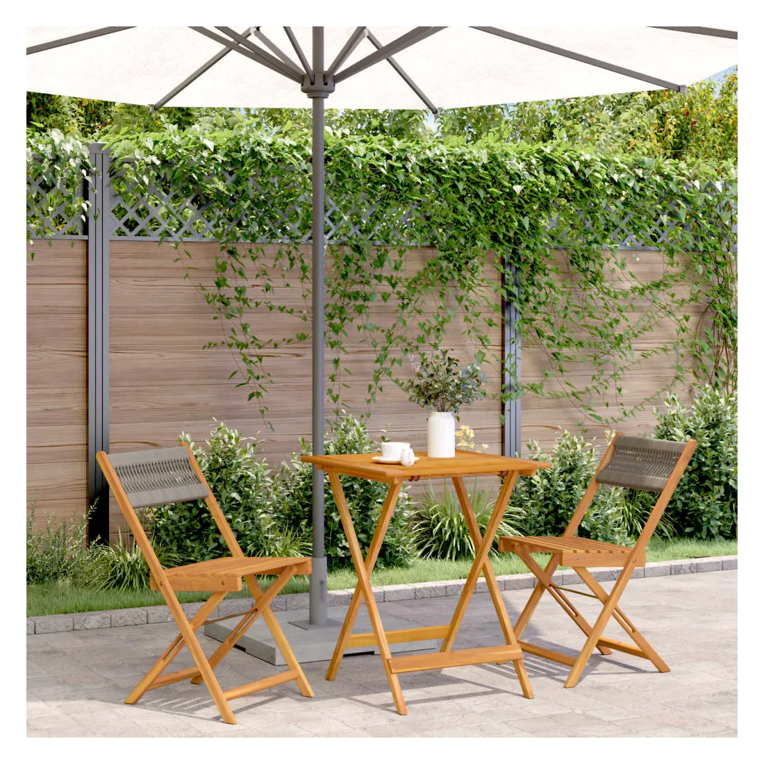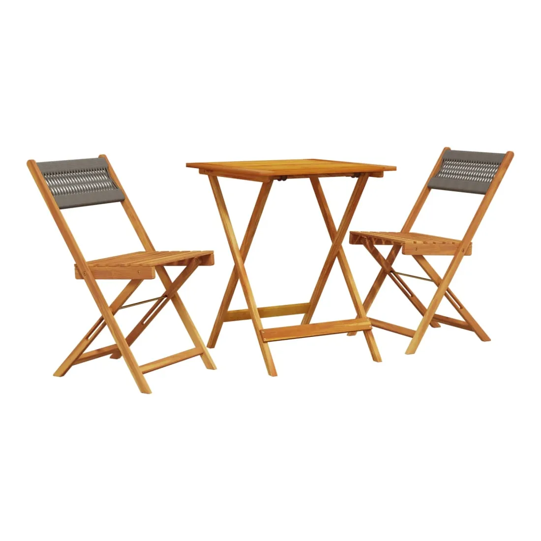 Savourez une tasse de café ou discutez avec votre famille et vos amis dans le jardin, l'arrière-cour ou sur le balcon avec cet ensemble de bistro ! Robuste et stable : le bois d'acacia massif est connu pour sa solidité et sa durabilité. Ses couleurs variées et ses grains uniques lui confèrent un aspect attrayant. Sa stabilité et sa résistance aux intempéries en font un matériau idéal pour la fabrication de meubles d'intérieur et d'extérieur.Conception pratique : la chaise d'extérieur ne comporte pas d'accoudoir, mais uniquement un dossier, ce qui vous permet d'être plus libre de vos mouvements tout en bénéficiant d'un grand confort.Dessus de table robuste : la table d'extérieur offre un excellent support pour accueillir vos boissons, collations, corbeilles de fruits et vos décorations préférées.Design pliable : la table et les chaises de salle à manger d'extérieur peuvent être facilement repliées lorsqu'elles ne sont pas utilisées pour faciliter le rangement et le transport. Bon à savoir :Pour que vos meubles d'extérieur restent beaux, nous vous recommandons de les protéger avec une housse imperméable.