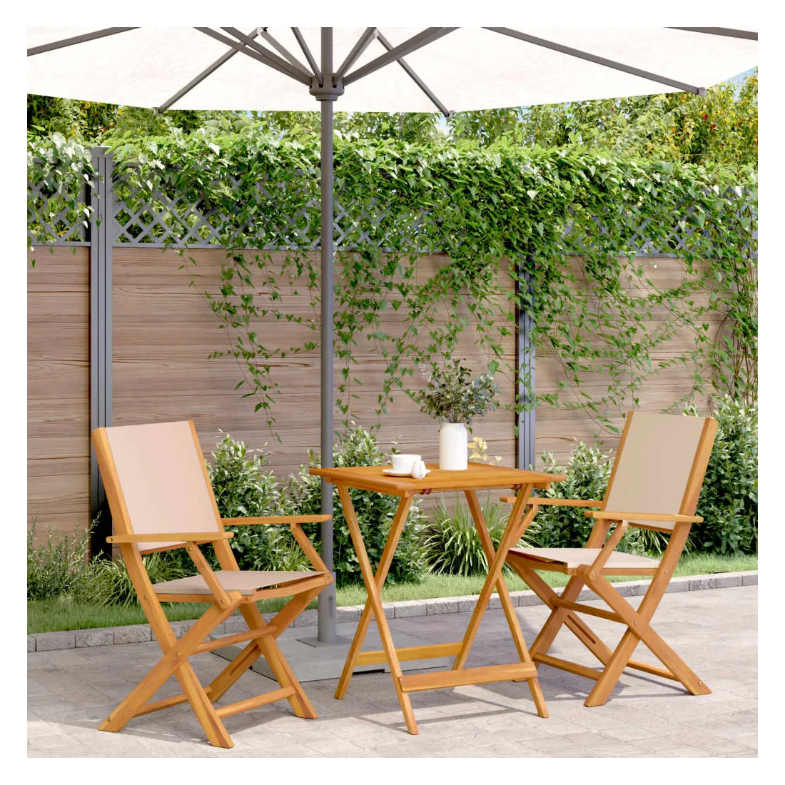 Savourez une tasse de café ou discutez avec votre famille et vos amis dans le jardin, l'arrière-cour ou sur le balcon avec cet ensemble de bistro ! Robuste et stable : le bois d'acacia massif est connu pour sa solidité et sa durabilité. Ses couleurs variées et ses grains uniques lui confèrent un aspect attrayant. Sa stabilité et sa résistance aux intempéries en font un matériau idéal pour la fabrication de meubles d'intérieur et d'extérieur.Conception pratique : la main courante en bois, pratique et plate, vous permet de poser vos mains dessus tout en profitant d'un moment en plein air.Dessus de table robuste : la table d'extérieur offre un excellent support pour accueillir vos boissons, collations, corbeilles de fruits et vos décorations préférées.Design pliable : la table et les chaises de salle à manger d'extérieur peuvent être facilement repliées lorsqu'elles ne sont pas utilisées pour faciliter le rangement et le transport. Bon à savoir :Pour que vos meubles d'extérieur restent beaux, nous vous recommandons de les protéger avec une housse imperméable.