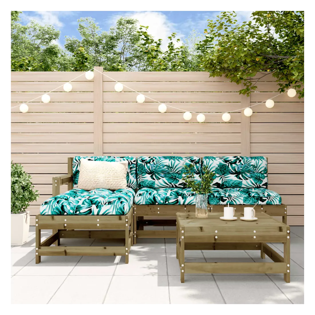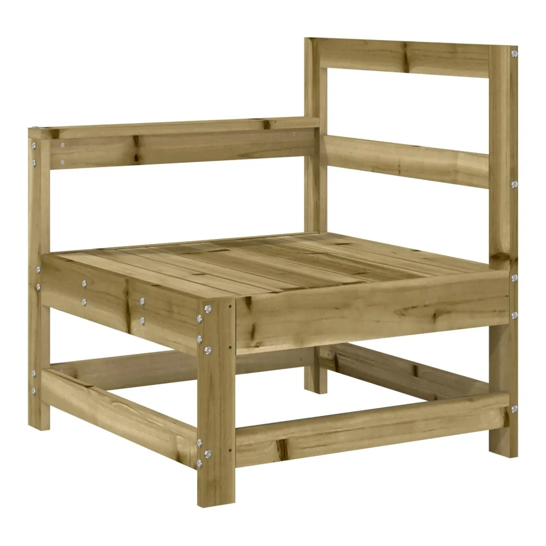 Ce salon de jardin en bois, qui se démarque par son design à lattes, sera un excellent supplément à votre jardin, patio ou terrasse pour profiter d'un moment agréable avec votre famille ou vos amis. Bois imprégné : le bois de pin massif est un matériau naturel magnifique. Le bois de pin a un grain droit et les nœuds lui confèrent un aspect rustique caractéristique. L'imprégnation est un processus de conservation réalisé à l'aide d'autoclaves. Le traitement sous pression augmente la résistance à la pourriture et aux intempéries.Cadre robuste et stable : les cadres en bois rendent l'ensemble de salon robuste et stable pour une utilisation quotidienne à l'extérieur.Design modulaire : le canapé est flexible et facile à déplacer. Vous pouvez le combiner avec d'autres segments modulaires de la boutique en ligne pour créer vos propres configurations de salon de jardin ! Bon à savoir :Pour que vos meubles d'extérieur restent beaux, nous vous recommandons de les protéger avec une housse imperméable.Les coussins ne sont pas inclus dans la livraison.