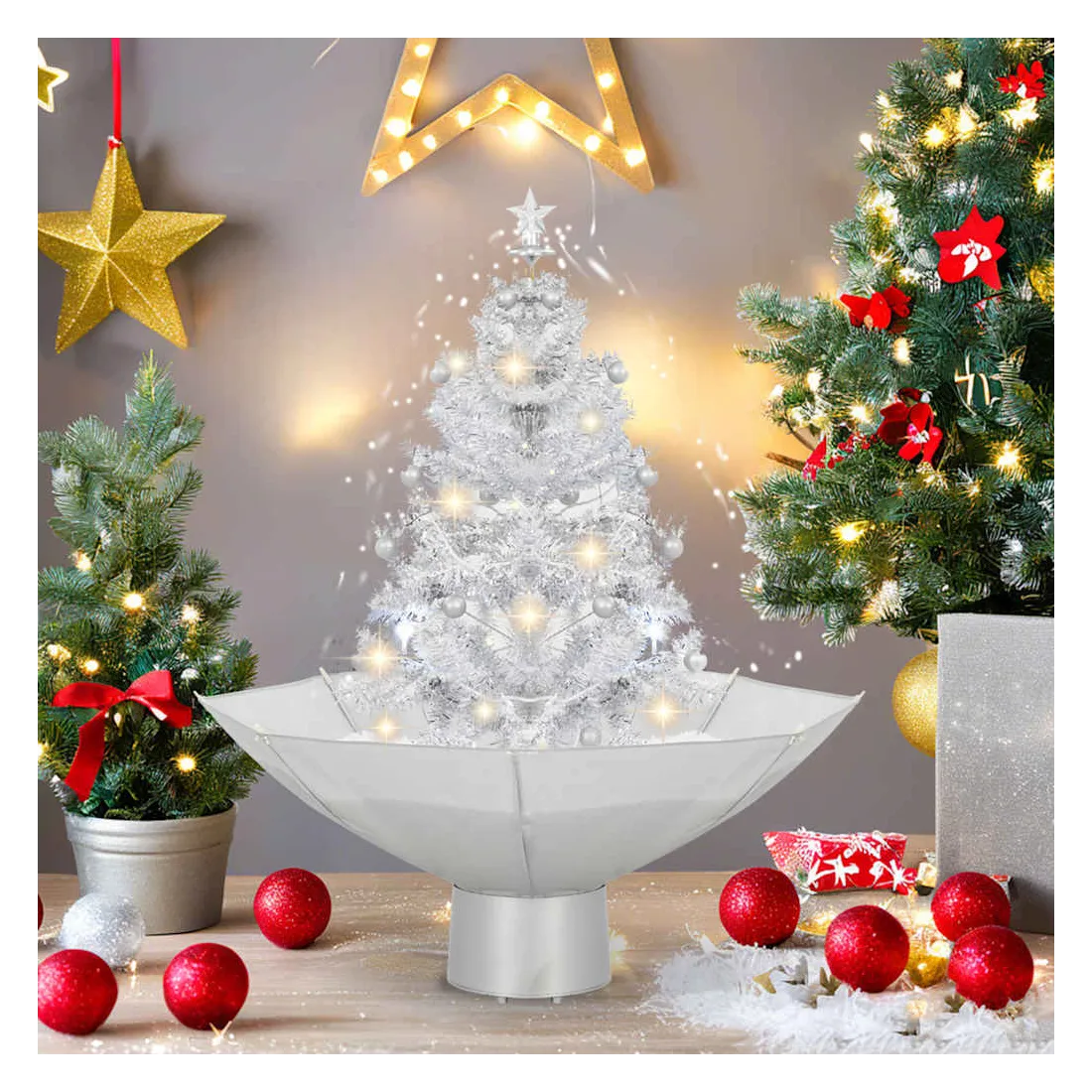 - Matériau : PVC (arbre) + polyester (parapluie) + plastique (décorations)