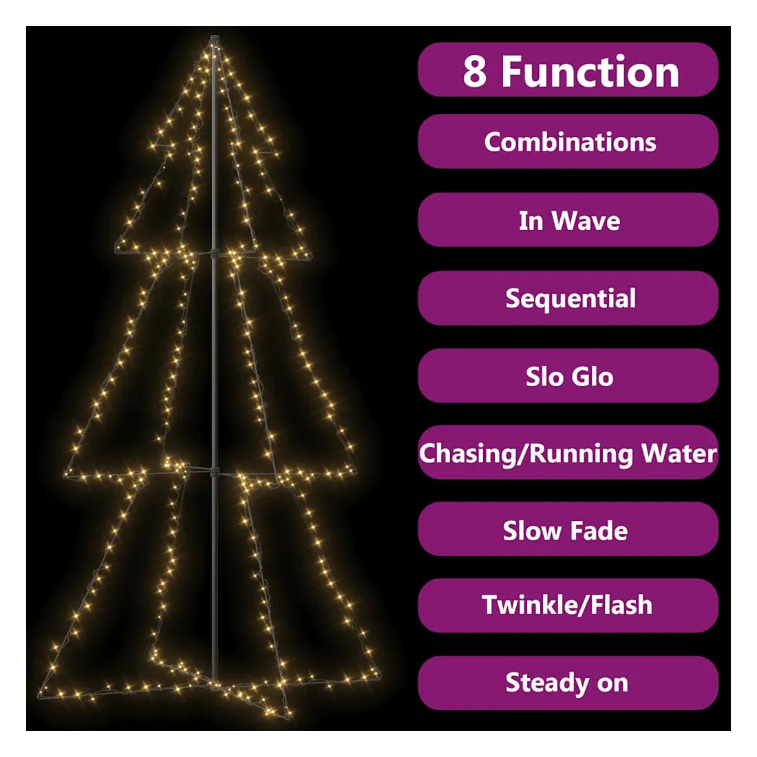 vidaXLCet arbre de Noël est spécialement conçu pour décorer votre arbre de Noël et créera l'atmosphère idéale pour votre Noël. Les lumières sont constituées de 300 LED haute puissance très efficaces en énergie et émettant une lumière brillante. Conçues avec 8 effets lumineux différents : une combinaison de tous les effets, l'éclairage lent, le scintillement/flash, la vague, la poursuite/le ruissellement de l'eau, le séquentiel, l'allumage permanent et le fondu lent, il s'illumine magnifiquement et crée une ambiance de vacances magique. Il attirera tous les regards, surtout le soir, et sert également de source confortable de lumière ambiante. L’arbre de Noël sous forme de cône autoportant peut être facilement et solidement fixé au sol avec le matériel de montage fourni. Remarque : l’USB inclus n’est pas étanche, donc cette partie doit éviter l’eau, mais grâce au câble de 5 m, l'arbre peut être utilisé à l'extérieur car le câble et le produit sont étanches. Ce produit est doté d'un connecteur USB, mais la source d'alimentation certifiée de USB 5V n'est pas incluse.
