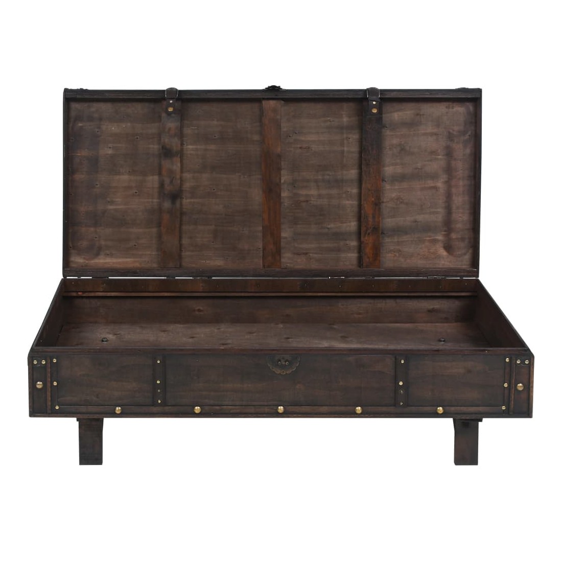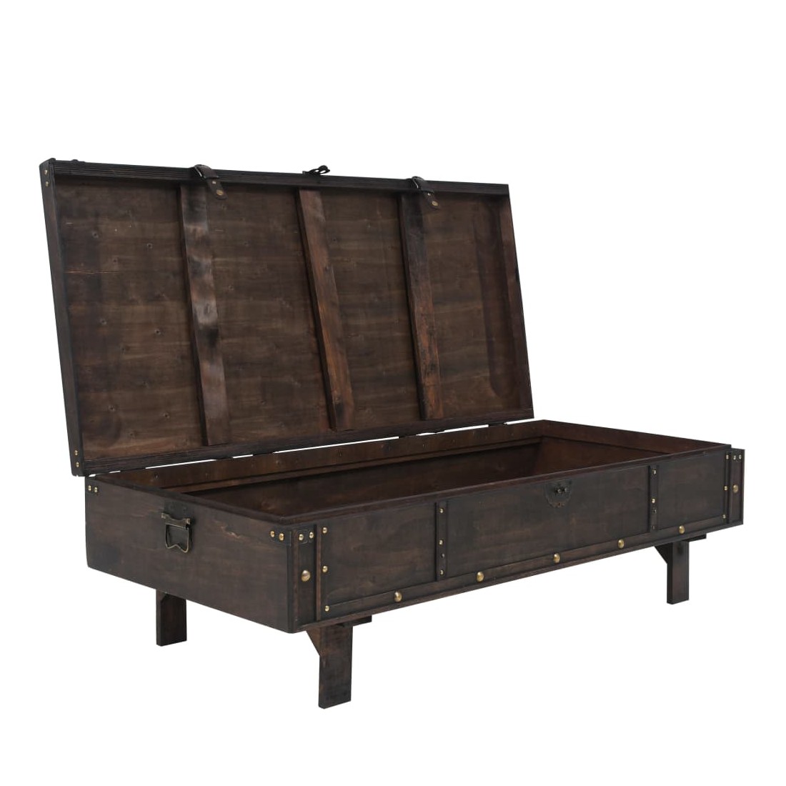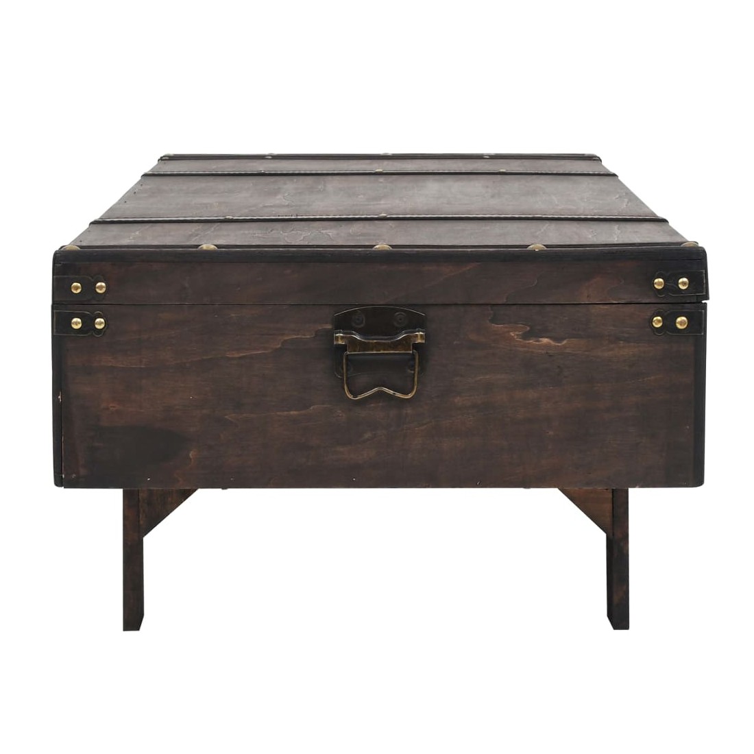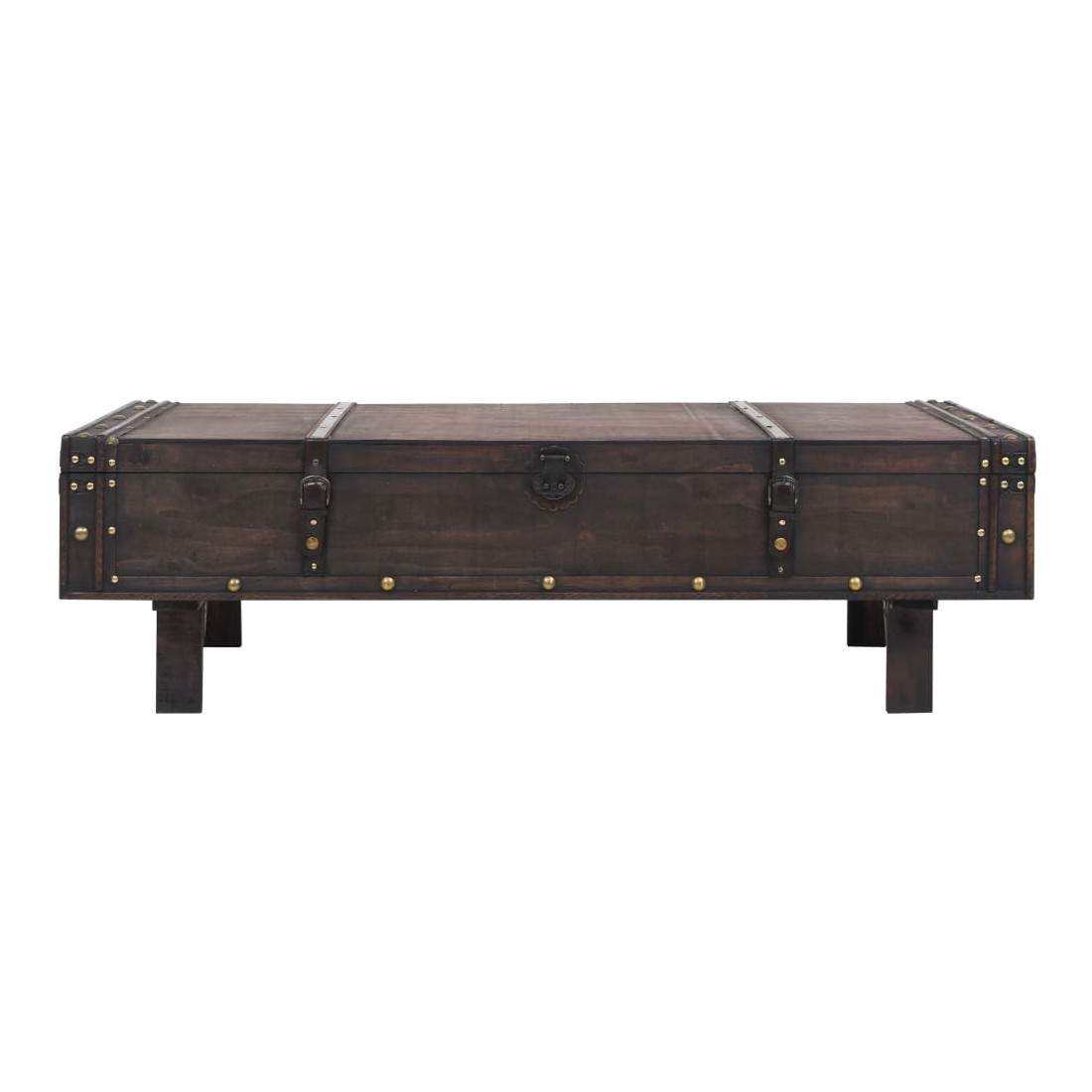 Notre table basse en bois de style antique sera un supplément pratique et décoratif à votre maison ! Elle peut également servir de coffre de rangement ou de banc. Cette table basse est fabriquée en contreplaqué avec une coloration d'aspect antique et décorée de lanières de cuir artificiel et d'éléments en métal, ce qui donne à la table son charme vintage. La table basse en bois a un grand compartiment de rangement intérieur pour les vêtements, les livres, les magazines et tout ce que vous aimeriez garder à portée de main mais hors de vue. Grâce à l'aspect vintage du loquet et des poignées, la table basse est facile à fermer et à déplacer. L'assemblage est facile.