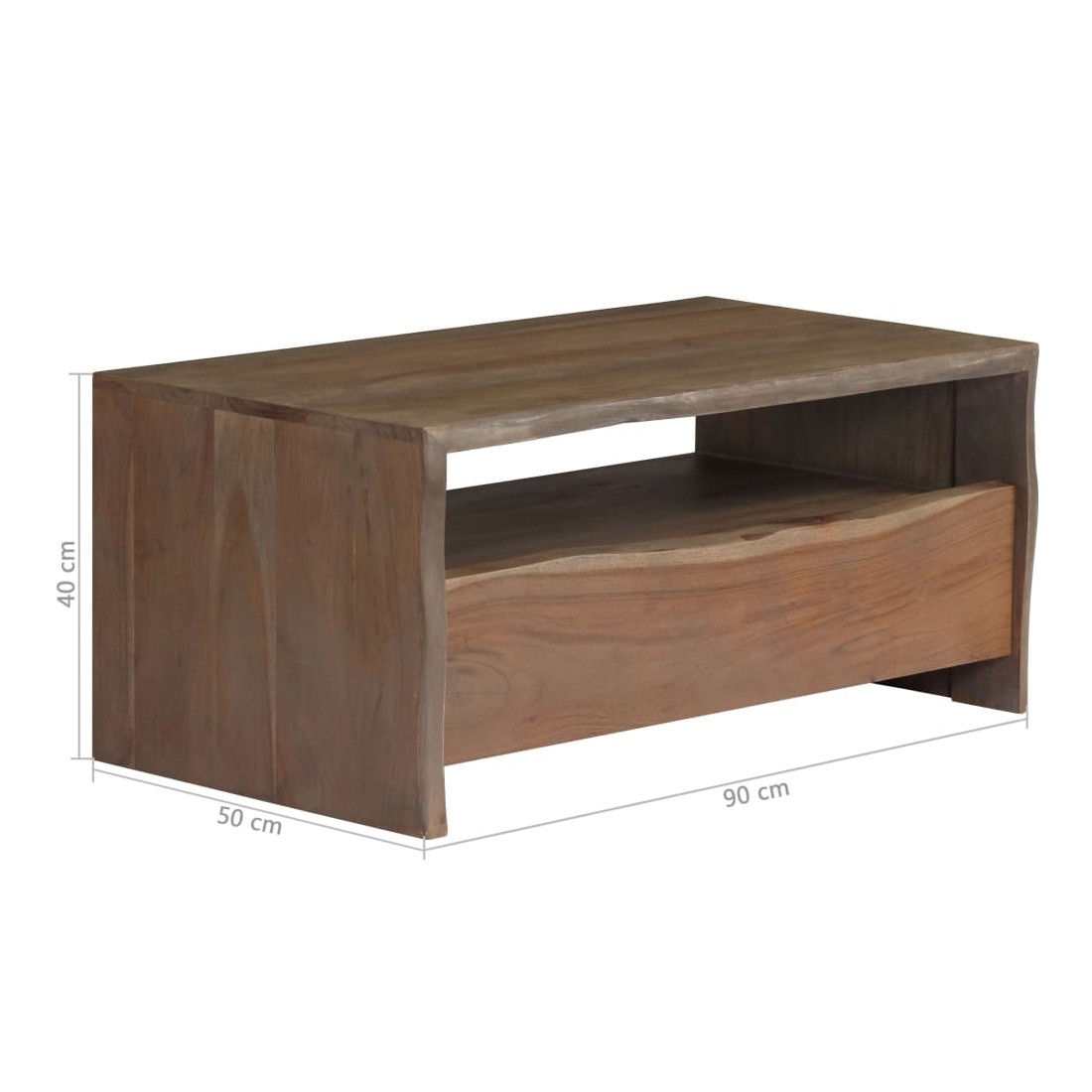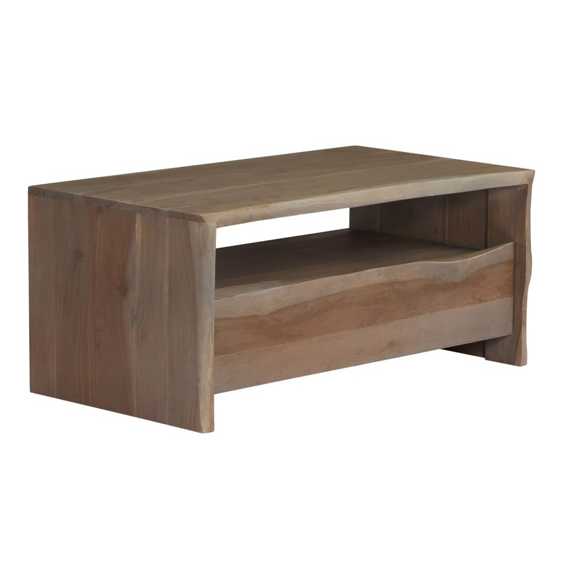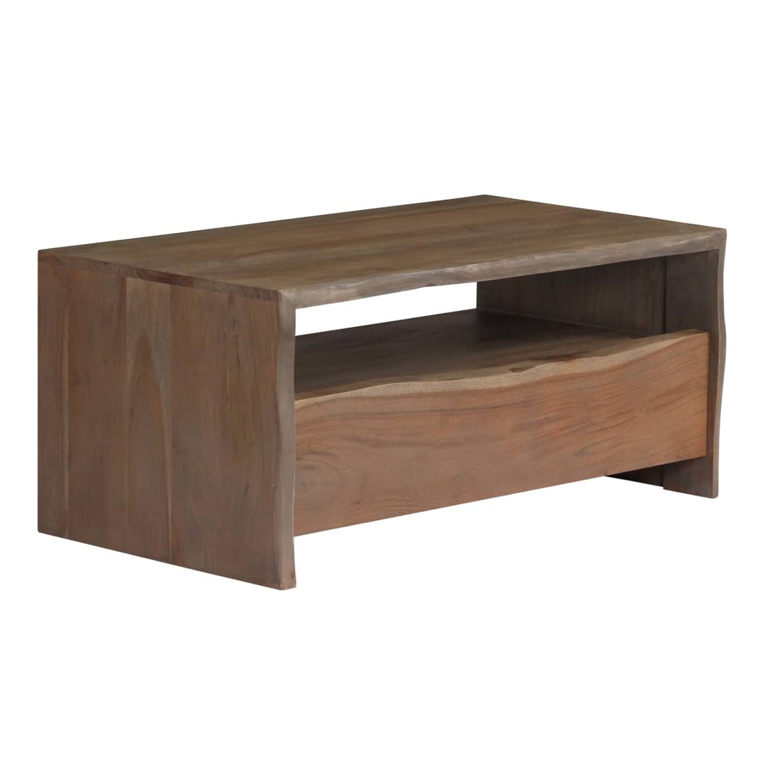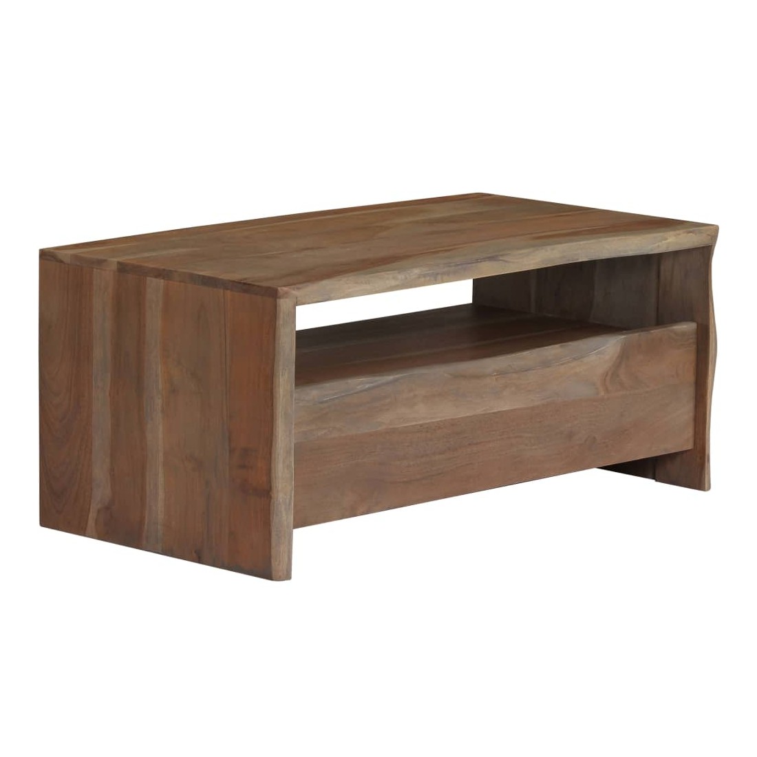 Cette table basse en bois dégage un charme rustique et sera un excellent supplément à votre intérieur. La table basse est faite de bois d'acacia massif qui a reçu une belle finition par polissage, peinture et laquage, pour lui donner un aspect raffiné. Cette table est entièrement faite à la main et les magnifiques grains de bois rendent chaque meuble unique et légèrement différent des autres. Le bord assorti du bois qui suit la forme naturelle de l'arbre augmente la beauté de la table. Cette table d'appoint a une surface solide et stable, sur laquelle vous pouvez placer vos boissons, aliments, paniers de fruits ou objets décoratifs. Elle est dotée d'un compartiment et d'un tiroir qui offrent suffisamment d'espace pour garder vos magazines, livres, télécommandes et autres petits objets