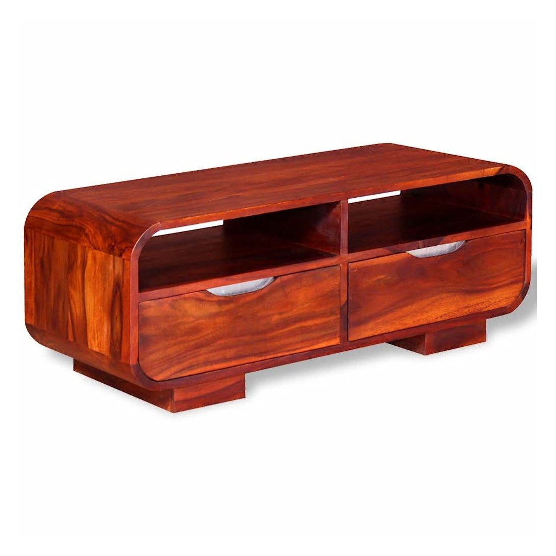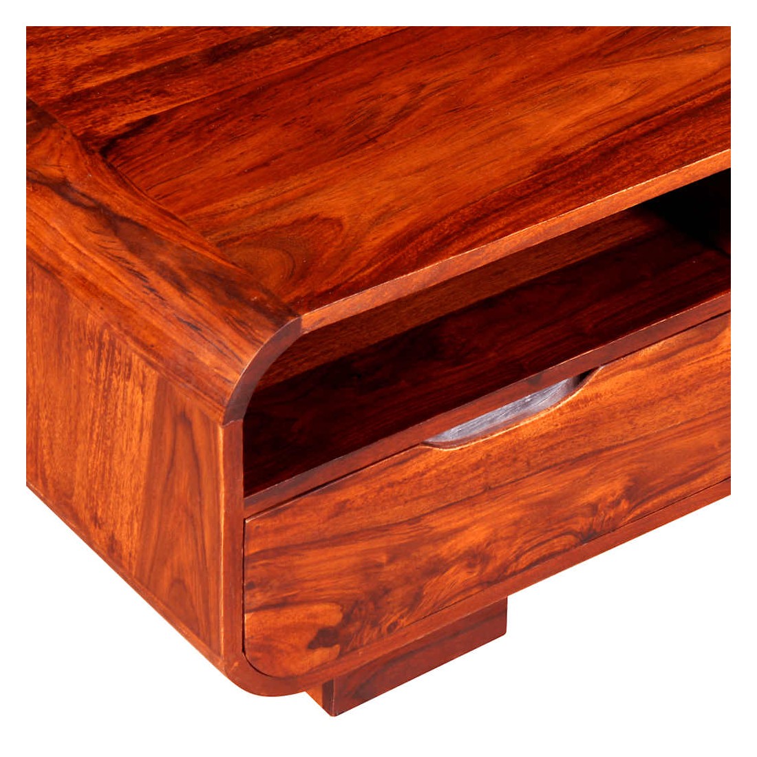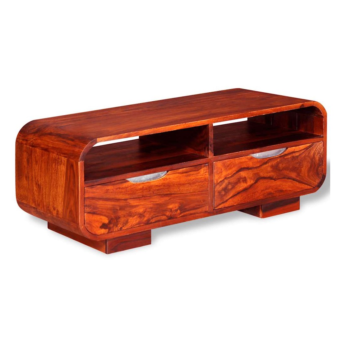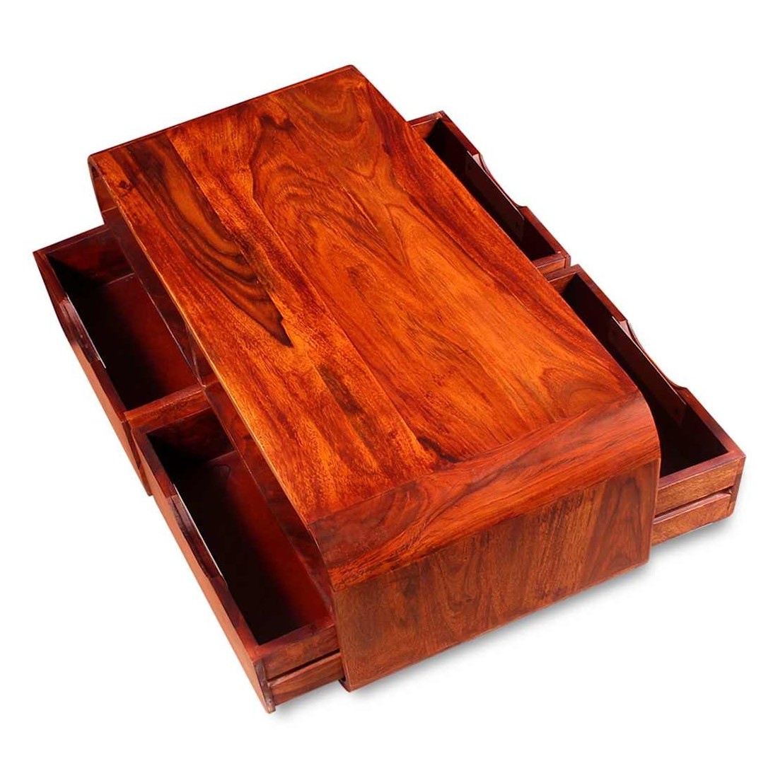 Cette table basse en bois massif est à la fois élégante et pratique. Le design élégant fera de cette table basse un point central de toute pièce. Le dessus de table solide offre une surface stable et sécurisée sur laquelle vous pouvez placer vos boissons, un panier de fruits, un vase ou autres articles décoratifs. Elle a deux compartiments ouverts et quatre tiroirs pour ranger des bibelots, des journaux, des magazines et d'autres articles utiles. Cette table basse est fabriquée à la main en bois massif. Le bois est un bois dur tropical qui est bien connu pour ses grains riches et aussi connu sous le nom de palissandre ou de bois de rose. L'artisanat et les beaux grains de bois rendent chaque meuble unique et légèrement différent de l'autre. L'assemblage est facile. Remarque importante
