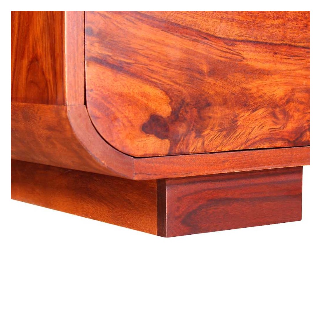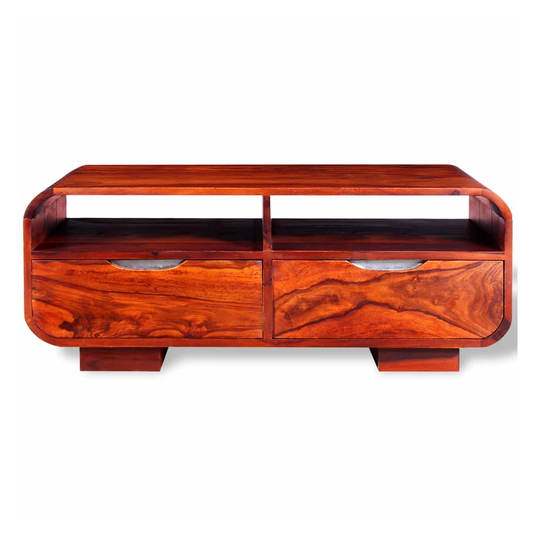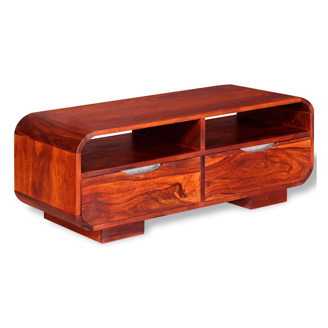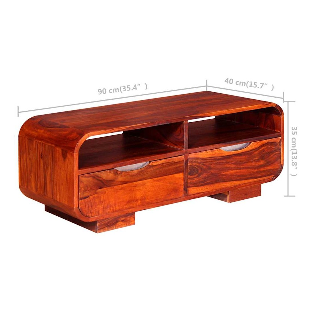 Cette table basse en bois massif est à la fois élégante et pratique. Le design élégant fera de cette table basse un point central de toute pièce. Le dessus de table solide offre une surface stable et sécurisée sur laquelle vous pouvez placer vos boissons, un panier de fruits, un vase ou autres articles décoratifs. Elle a deux compartiments ouverts et quatre tiroirs pour ranger des bibelots, des journaux, des magazines et d'autres articles utiles. Cette table basse est fabriquée à la main en bois massif. Le bois est un bois dur tropical qui est bien connu pour ses grains riches et aussi connu sous le nom de palissandre ou de bois de rose. L'artisanat et les beaux grains de bois rendent chaque meuble unique et légèrement différent de l'autre. L'assemblage est facile. Remarque importante