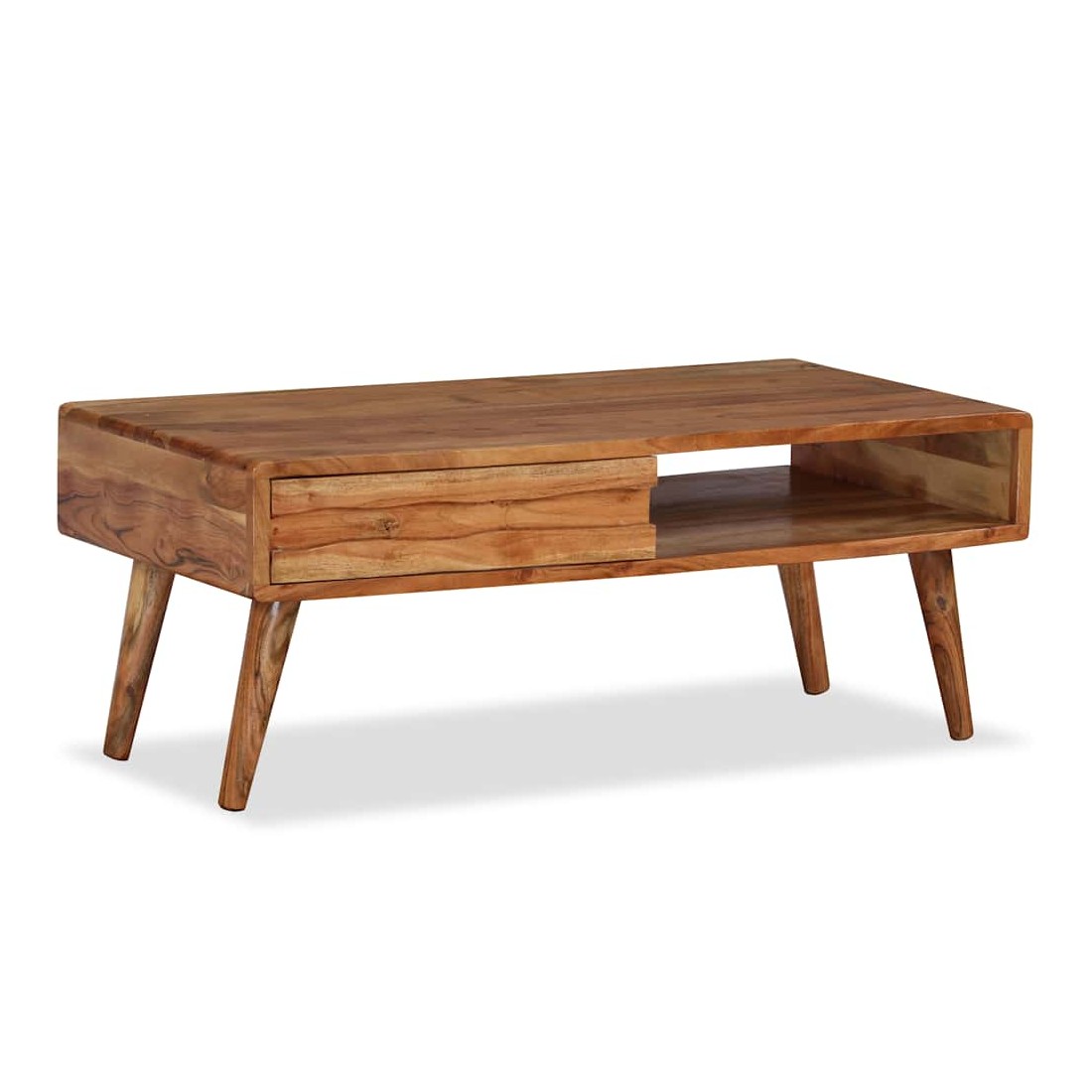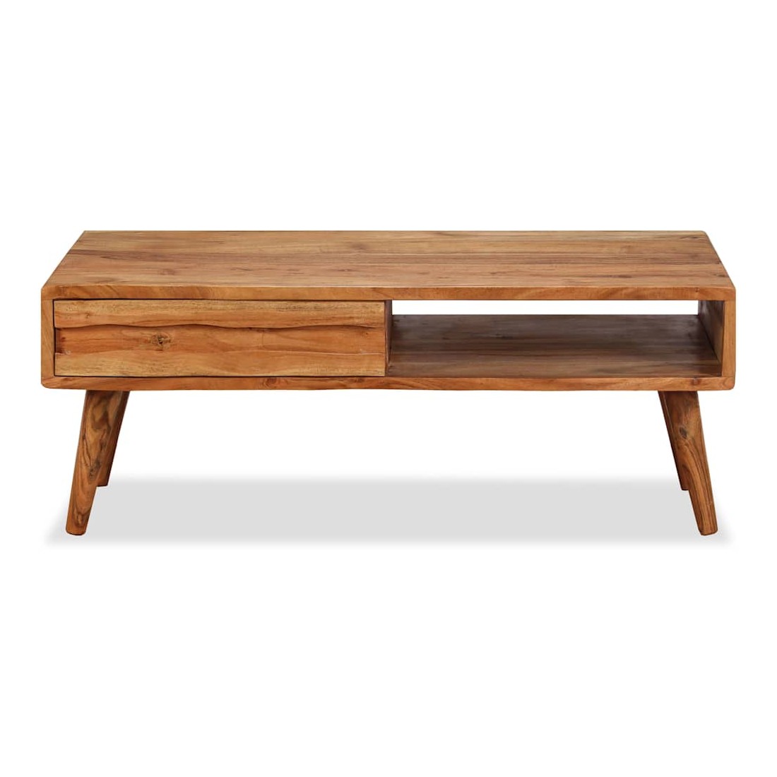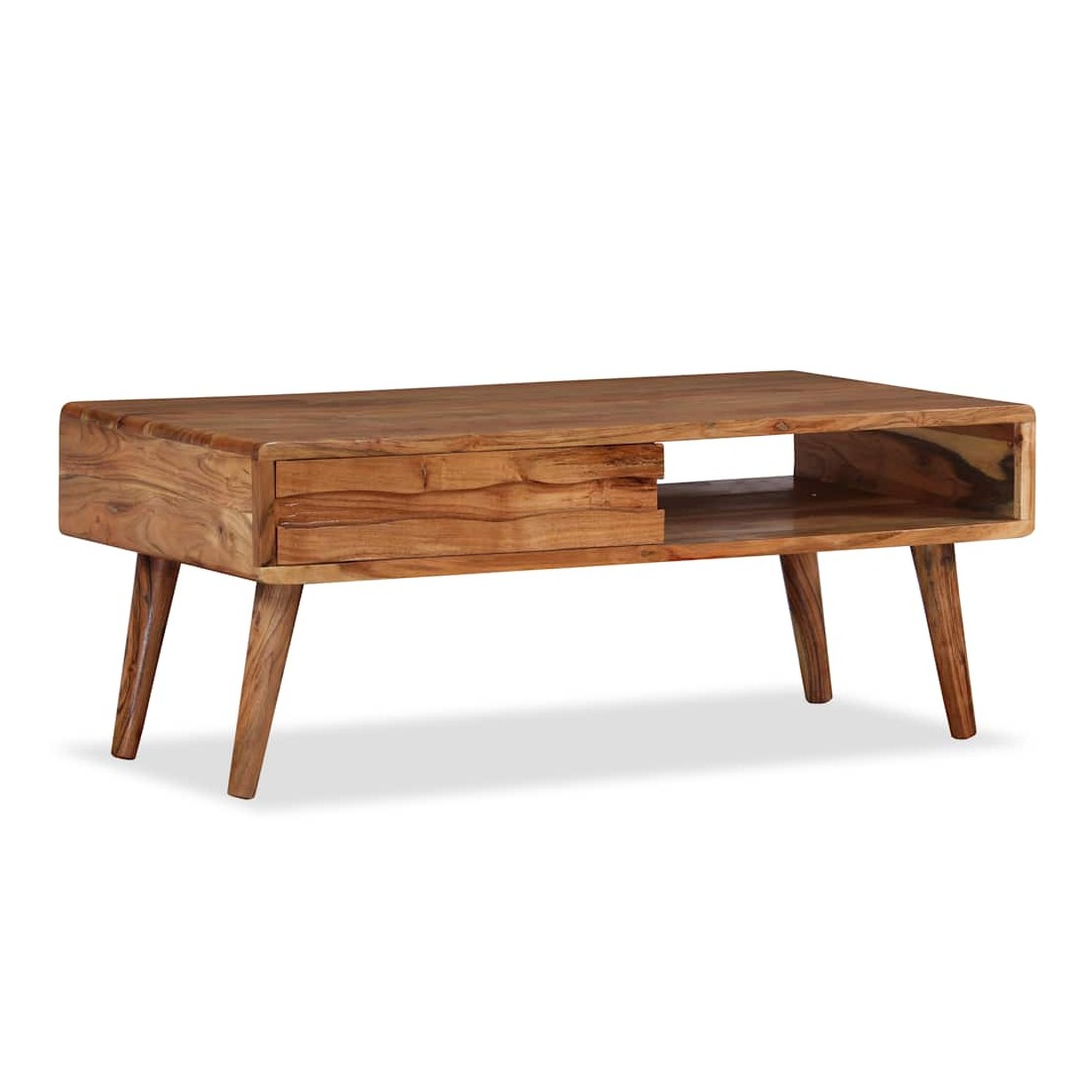 Cette table basse en bois dégage un charme rustique et sera un excellent supplément à votre intérieur. La table basse est faite de bois d'acacia solide qui a reçu une belle finition par polissage, peinture et laquage, pour lui donner un aspect raffiné. Cette table est entièrement faite à la main et les beaux grains de bois rendent chaque meuble unique et légèrement différent les uns des autres. Cette table d'appoint a une surface solide et stable sur laquelle vous pouvez placer vos boissons, aliments, paniers de fruits ou objets décoratifs. Cette table basse comporte un tiroir sculpté et un compartiment, qui offrent amplement d'espace pour garder vos magazines, livres, télécommande et autres petits objets à portée de main. L'assemblage est facile. Remarque importante : les couleurs var