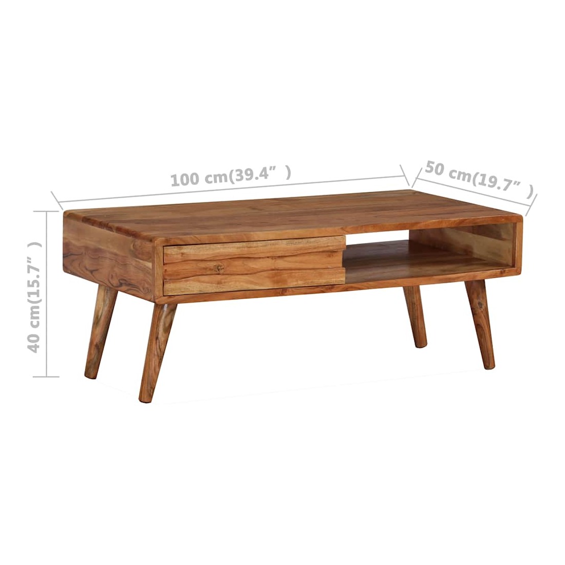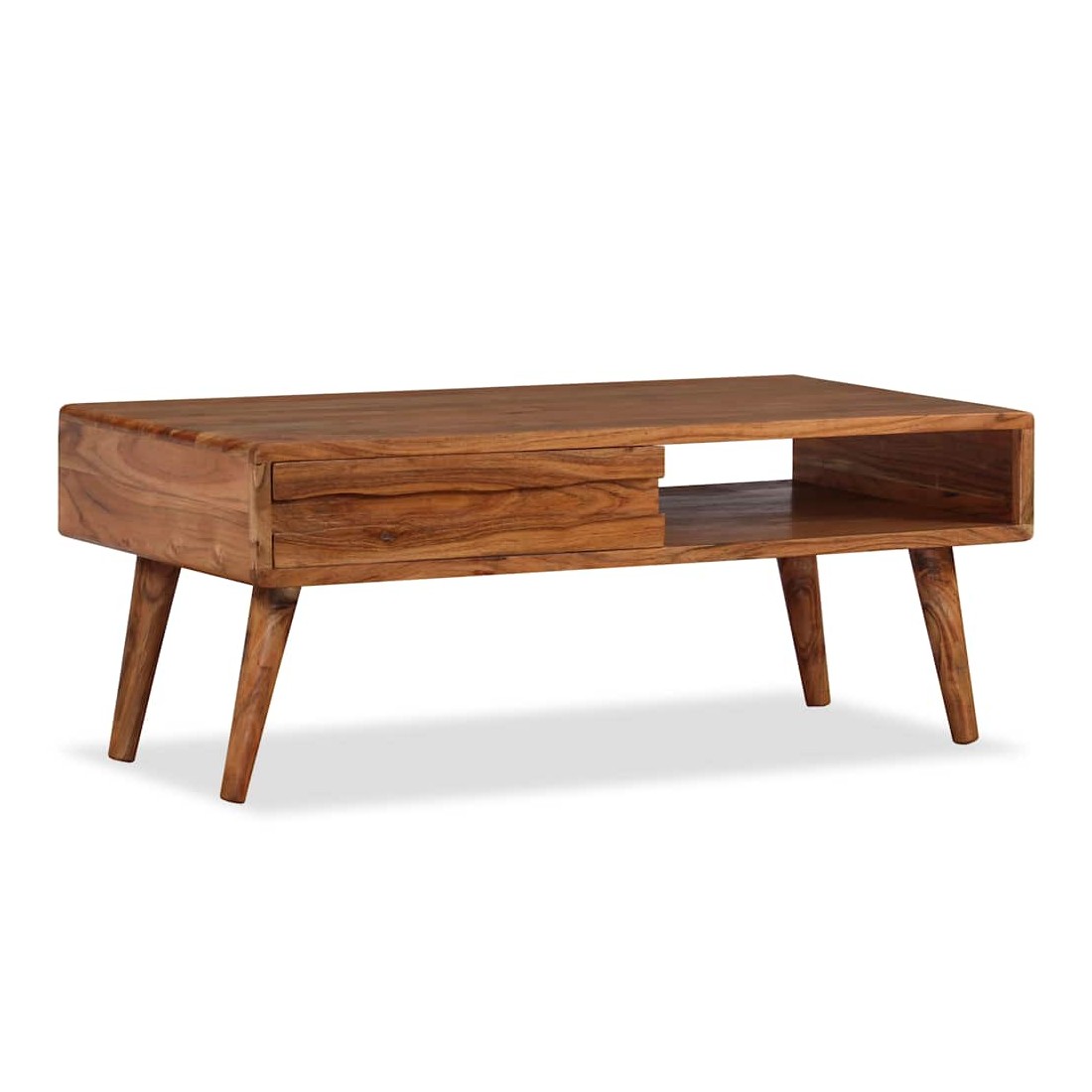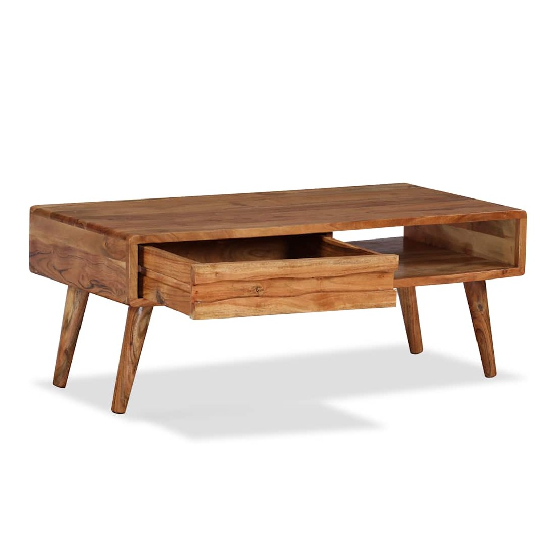 Cette table basse en bois dégage un charme rustique et sera un excellent supplément à votre intérieur. La table basse est faite de bois d'acacia solide qui a reçu une belle finition par polissage, peinture et laquage, pour lui donner un aspect raffiné. Cette table est entièrement faite à la main et les beaux grains de bois rendent chaque meuble unique et légèrement différent les uns des autres. Cette table d'appoint a une surface solide et stable sur laquelle vous pouvez placer vos boissons, aliments, paniers de fruits ou objets décoratifs. Cette table basse comporte un tiroir sculpté et un compartiment, qui offrent amplement d'espace pour garder vos magazines, livres, télécommande et autres petits objets à portée de main. L'assemblage est facile. Remarque importante : les couleurs var