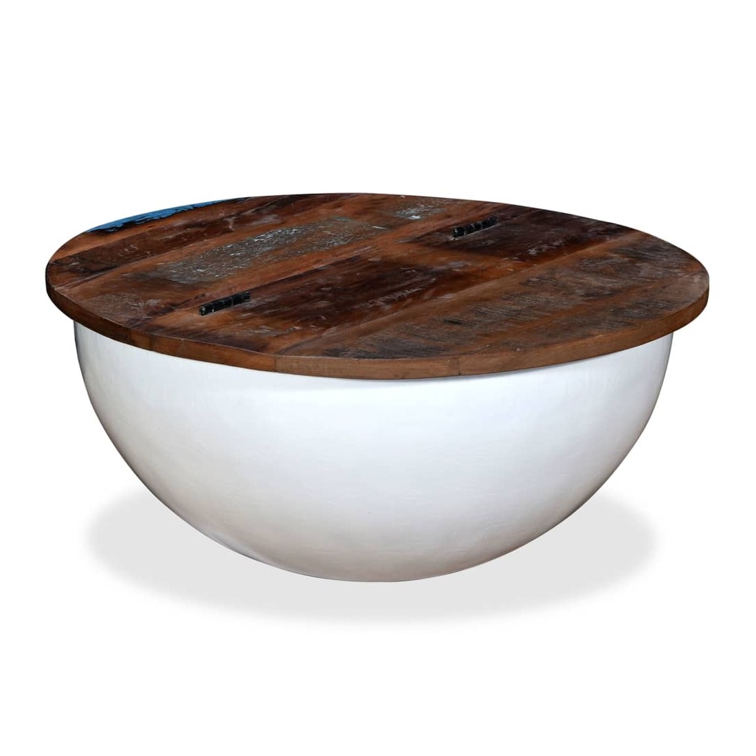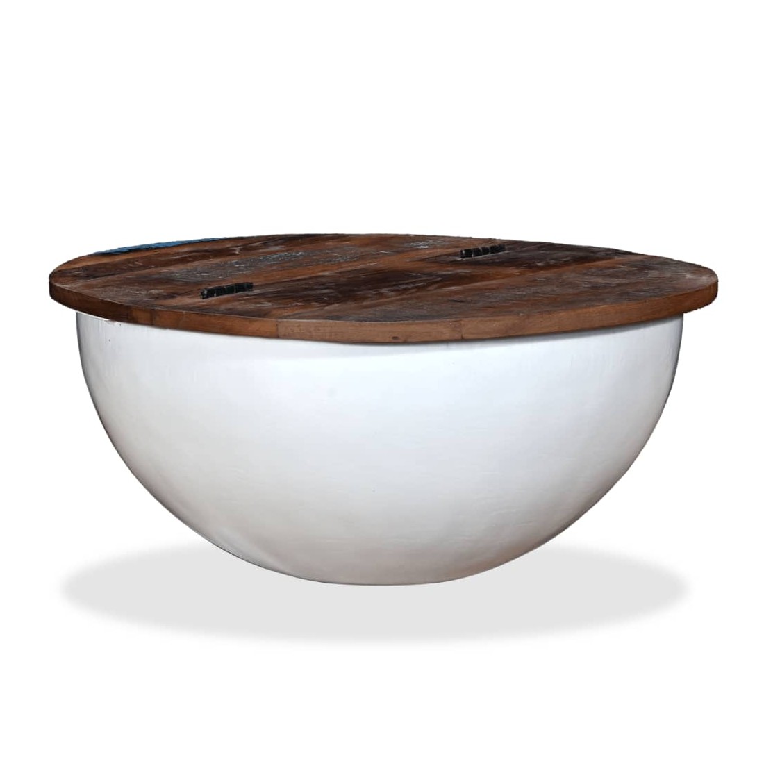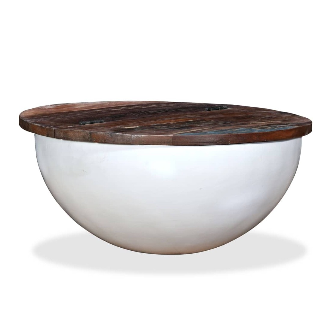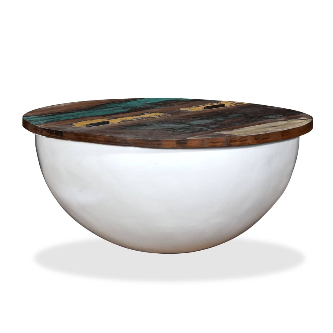 Cette table basse unique en bois a un design industriel et sera un supplément intemporel au décor de votre maison. La base en acier unique en forme de bol donne à la table sa touche industrielle. Cette table basse est dotée d'un dessus de table en bois massif, idéal pour poser des verres, des vases, des fruits ou des bibelots, tandis que le compartiment de rangement dissimulé sous le dessus de table offre un espace supplémentaire pour éviter l'encombrement. Le dessus de table est en bois de récupération massif, ce qui signifie que chaque table est unique et légèrement différente l'une de l'autre, et présente les caractéristiques de divers bois comme le teck, l'acacia, le bois de manguier, etc. Le bois de récupération est solide, stable, durable et beau. La table basse a subi un processus élaboré de polissage, de peinture et de laquage. Détendez-vous et divertissez votre famille et vos amis autour de cette table basse unique ! Remarque : les tables basses sont déjà assemblées ; aucun assemblage n'est requis. Les couleurs des dessus de table peuvent varier d'une pièce à l'autre, ce qui rend chacune de nos tables basses unique. La livraison est aléatoire, ce qui garantit l'exclusivité et l'individualité de votre produit.