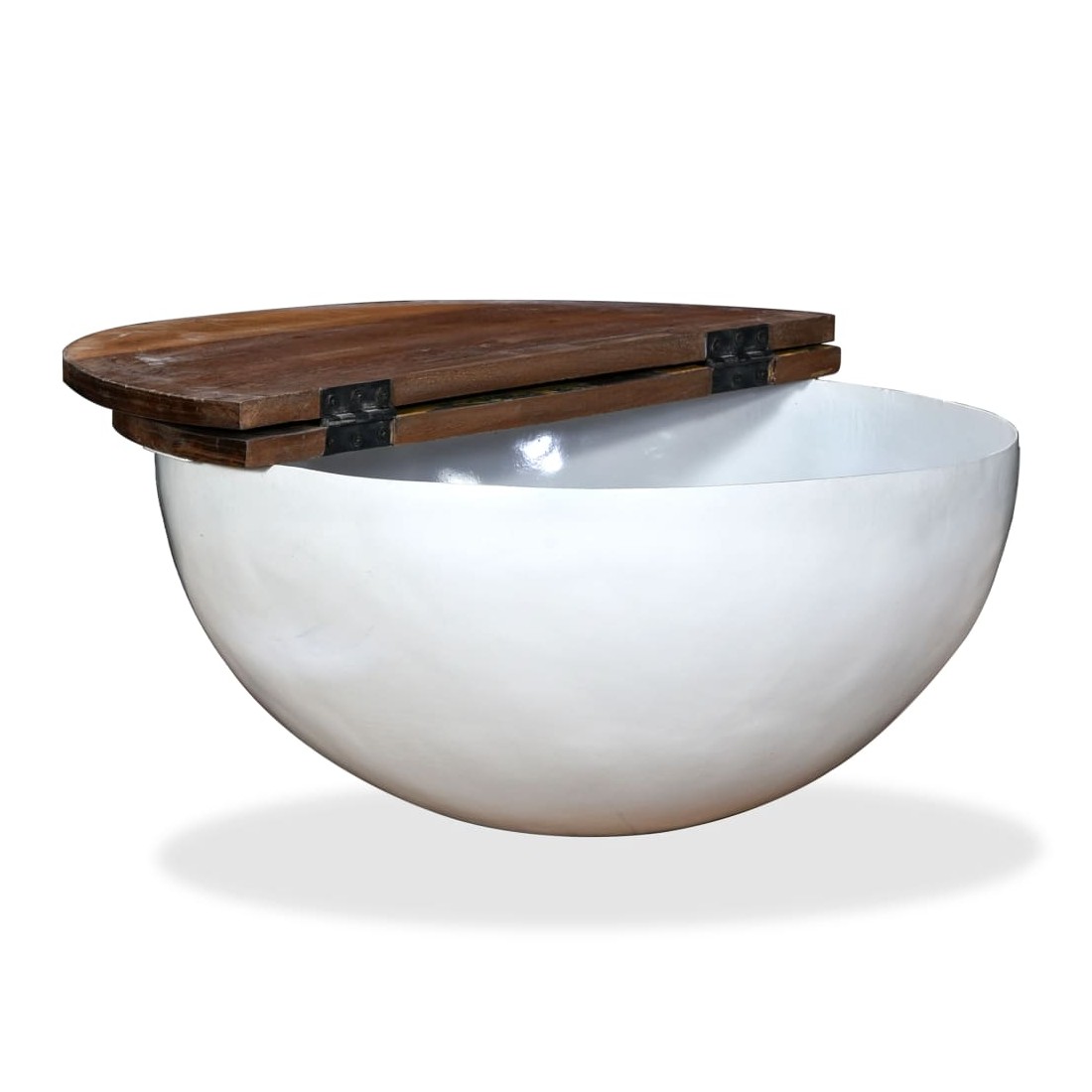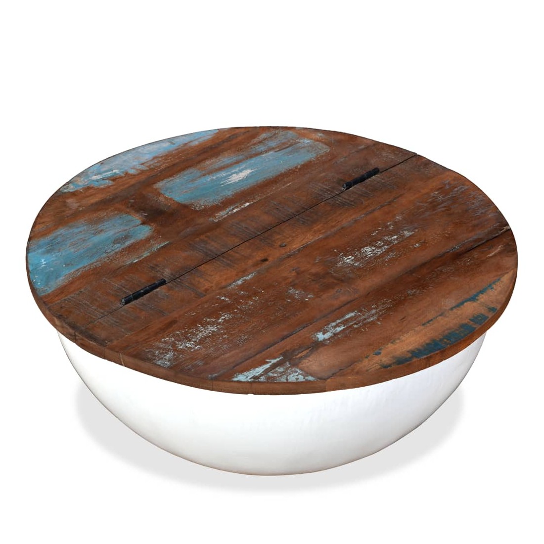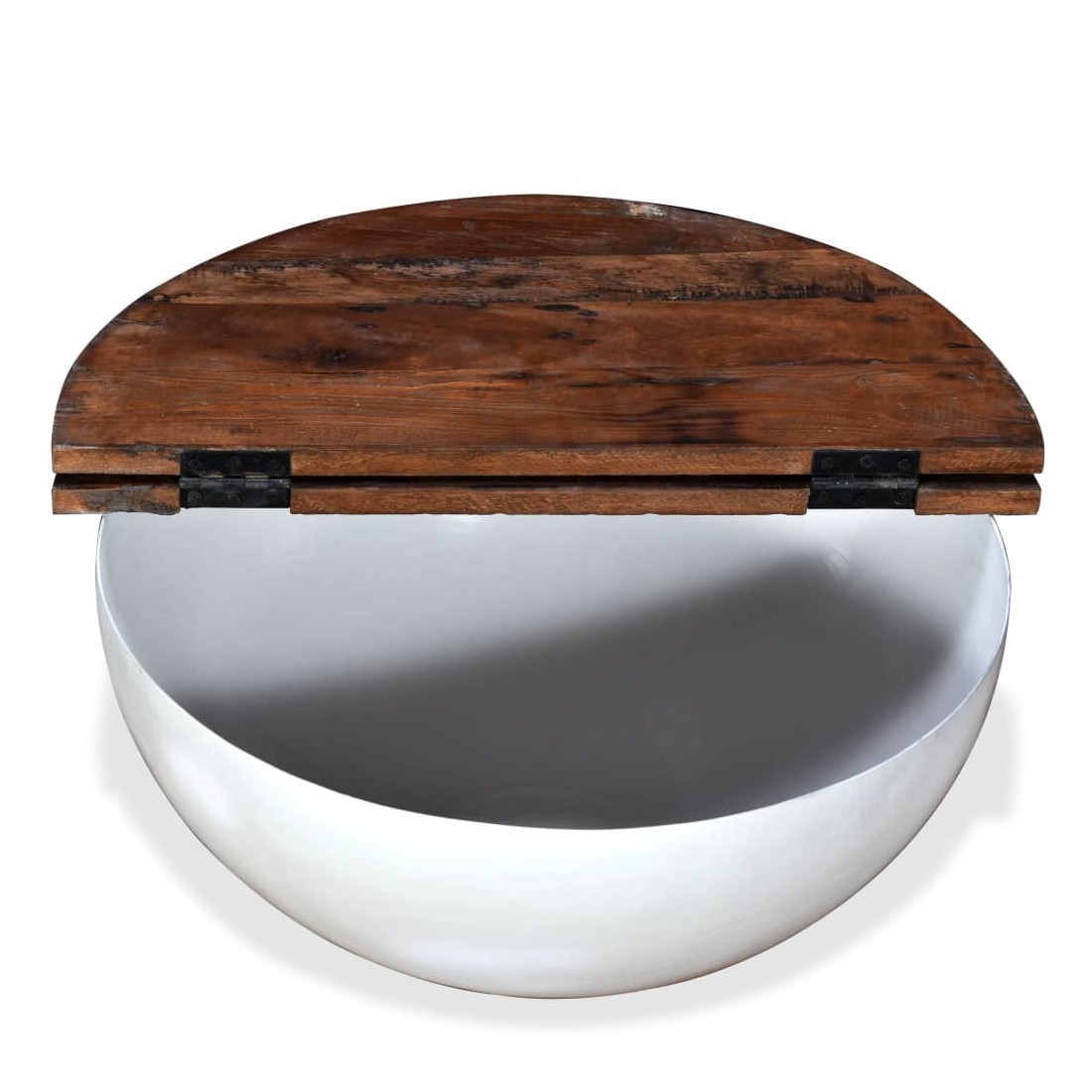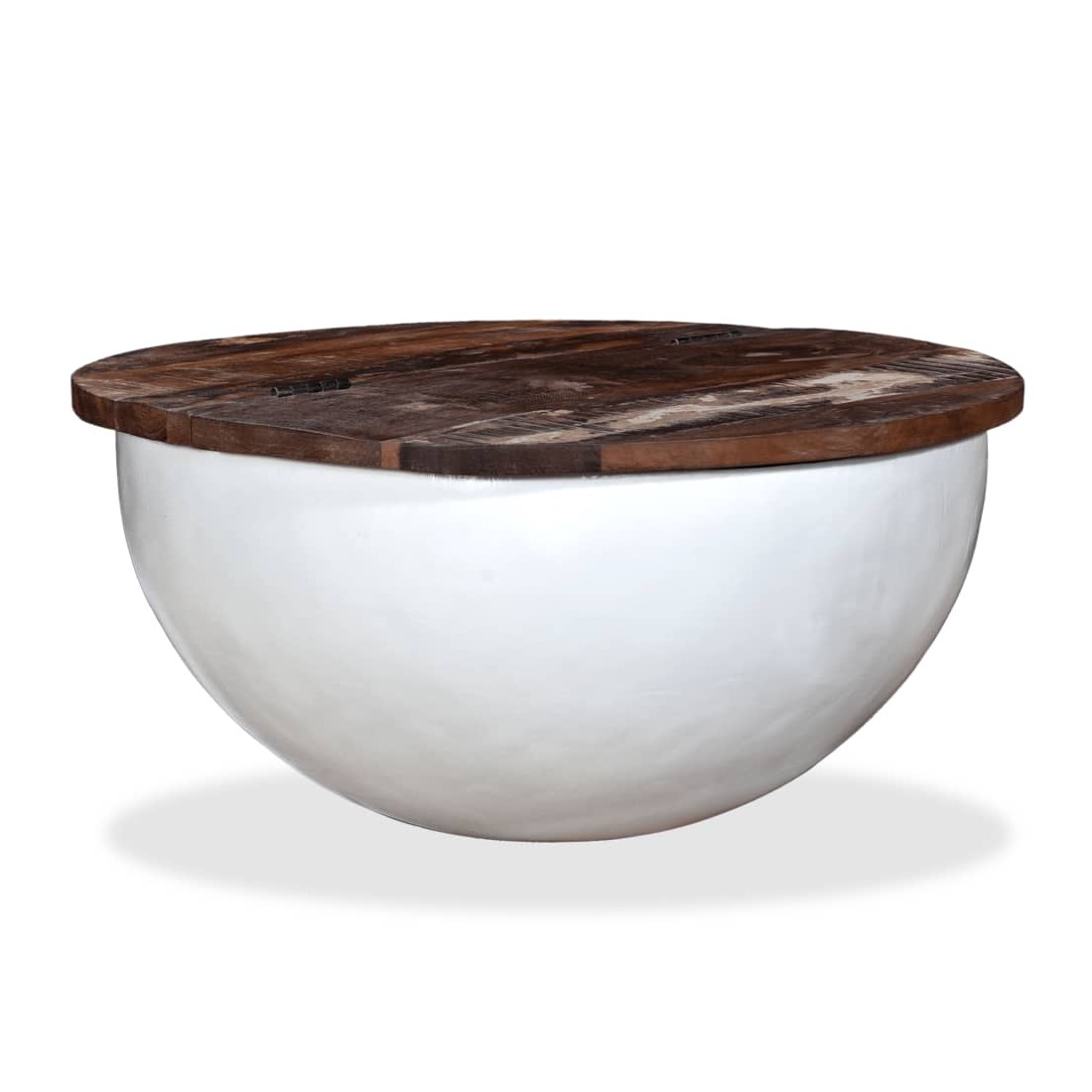 Cette table basse unique en bois a un design industriel et sera un supplément intemporel au décor de votre maison. La base en acier unique en forme de bol donne à la table sa touche industrielle. Cette table basse est dotée d'un dessus de table en bois massif, idéal pour poser des verres, des vases, des fruits ou des bibelots, tandis que le compartiment de rangement dissimulé sous le dessus de table offre un espace supplémentaire pour éviter l'encombrement. Le dessus de table est en bois de récupération massif, ce qui signifie que chaque table est unique et légèrement différente l'une de l'autre, et présente les caractéristiques de divers bois comme le teck, l'acacia, le bois de manguier, etc. Le bois de récupération est solide, stable, durable et beau. La table basse a subi un processus élaboré de polissage, de peinture et de laquage. Détendez-vous et divertissez votre famille et vos amis autour de cette table basse unique ! Remarque : les tables basses sont déjà assemblées ; aucun assemblage n'est requis. Les couleurs des dessus de table peuvent varier d'une pièce à l'autre, ce qui rend chacune de nos tables basses unique. La livraison est aléatoire, ce qui garantit l'exclusivité et l'individualité de votre produit.