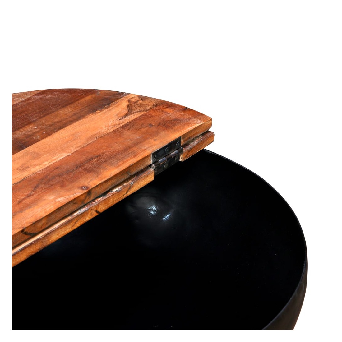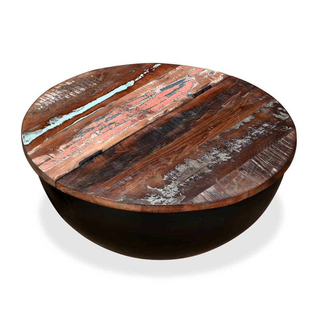 Cette table basse unique en bois a un design industriel et sera un supplément intemporel au décor de votre maison. La base en acier unique en forme de bol donne à la table sa touche industrielle. Cette table basse est dotée d'un dessus de table en bois massif, idéal pour poser des verres, des vases, des fruits ou des bibelots, tandis que le compartiment de rangement dissimulé sous le dessus de table offre un espace supplémentaire pour éviter l'encombrement. Le dessus de table est en bois de récupération massif, ce qui signifie que chaque table est unique et légèrement différente l'une de l'autre, et présente les caractéristiques de divers bois comme le teck, l'acacia, le bois de manguier, etc. Le bois de récupération est solide, stable, durable et beau. La table basse a subi un process