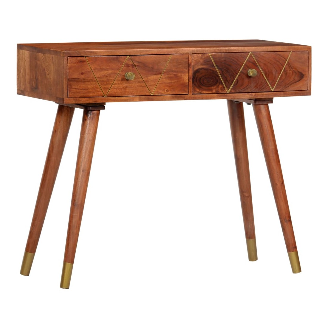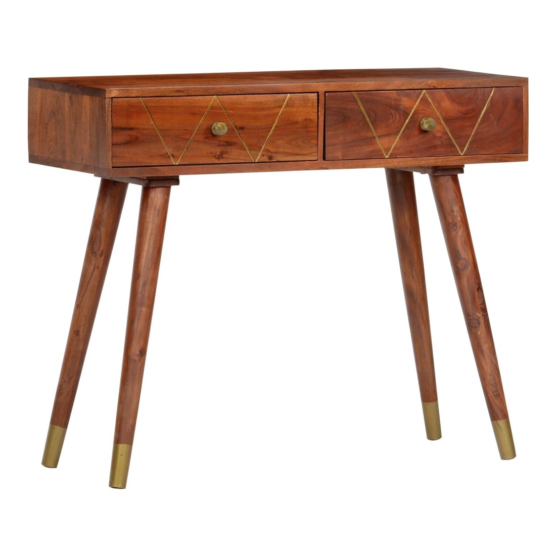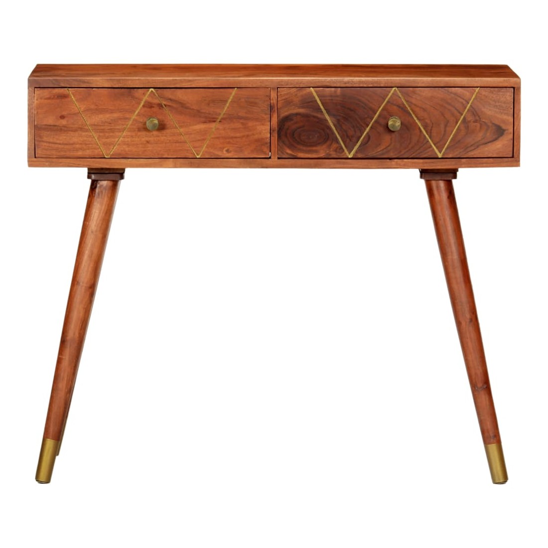 Cette table console, au style rustique avec un design sculpté sur chaque tiroir, sera un excellent supplément à votre salon, salle à manger, couloir, etc. La table est en bois d'acacia massif qui a reçu une belle finition par polissage, peinture et laquage pour fournir un look raffiné. La table est entièrement faite à la main, et les beaux grains de bois rendent chaque meuble unique et légèrement différent l'un de l'autre. Le dessus de table robuste est idéal pour afficher des objets décoratifs, des cadres photo ou des plantes en pot. Deux tiroirs coulissants peuvent être utilisés pour ranger de petits objets comme des clés, des blocs-notes, des stylos et d'autres bibelots. Elle peut également être utilisée comme bureau, table d'appoint, armoire latérale, etc. Elle est facile à nettoyer et à entretenir avec un chiffon humide. Cette table console est facile à assembler. Remarque importante : les couleurs varient d'une pièce à l'autre, rendant chacune de nos tables console unique. La livraison est aléatoire, ce qui garantit l'exclusivité et l'individualité de votre produit.