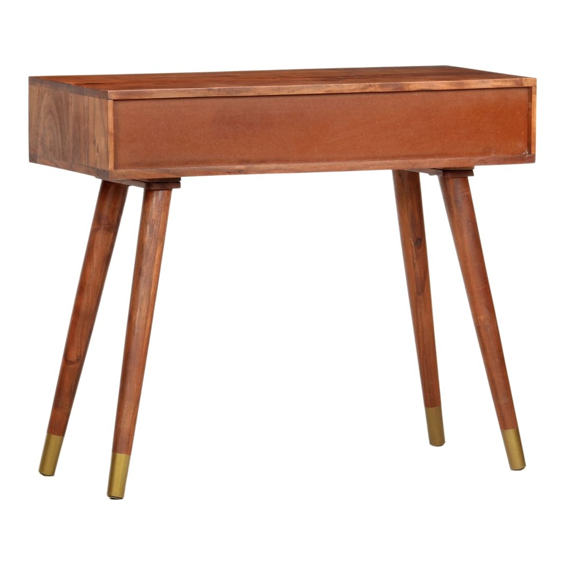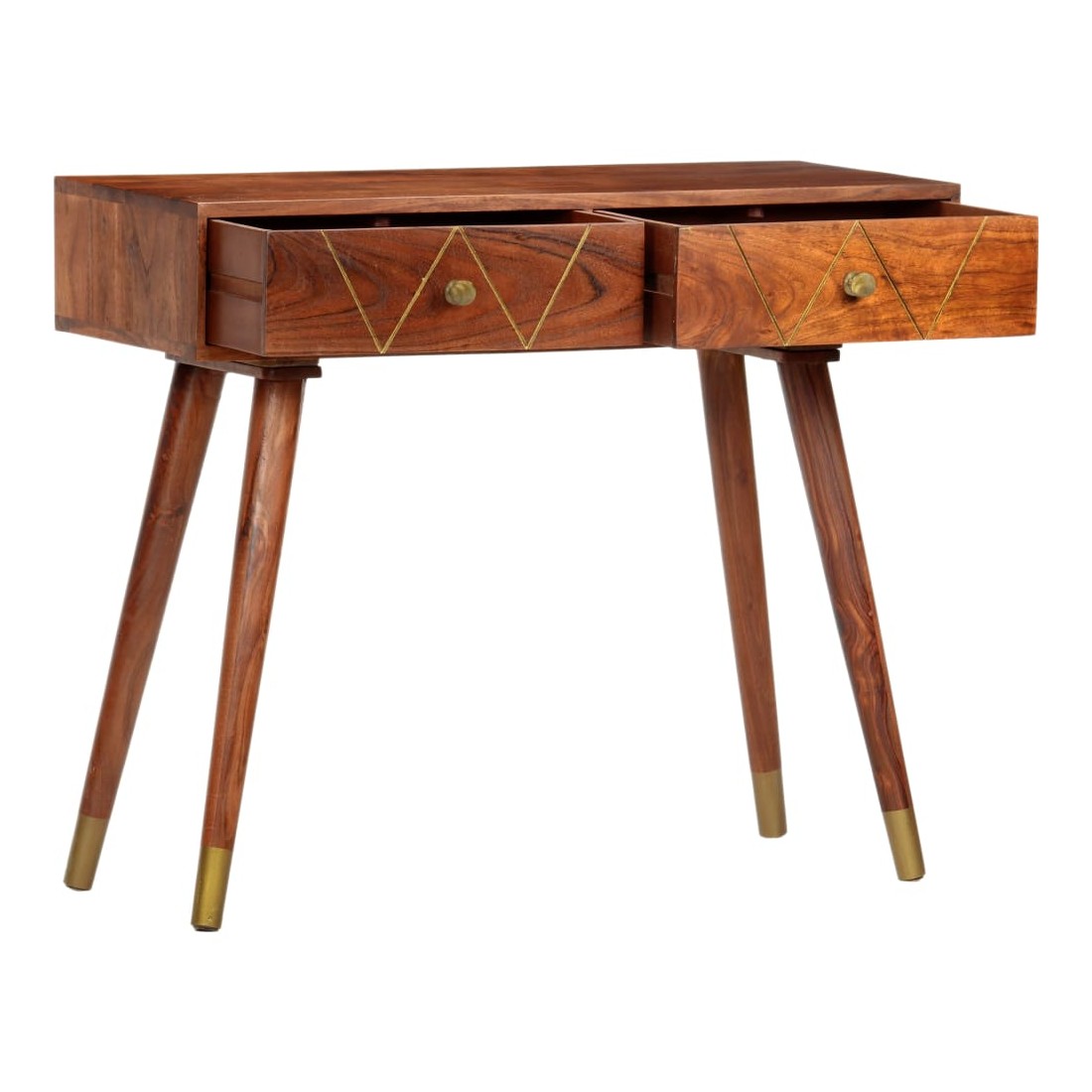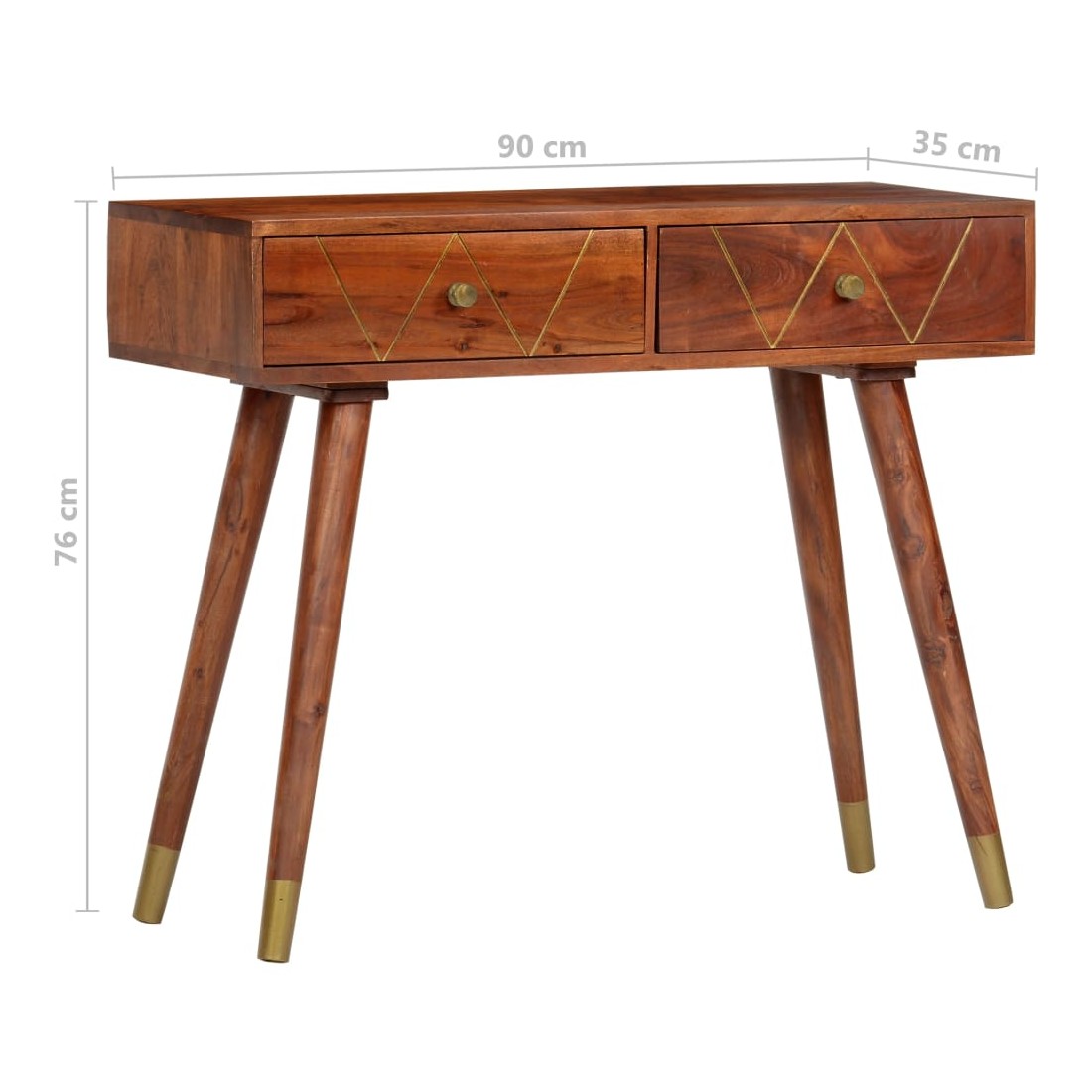 Cette table console, au style rustique avec un design sculpté sur chaque tiroir, sera un excellent supplément à votre salon, salle à manger, couloir, etc. La table est en bois d'acacia massif qui a reçu une belle finition par polissage, peinture et laquage pour fournir un look raffiné. La table est entièrement faite à la main, et les beaux grains de bois rendent chaque meuble unique et légèrement différent l'un de l'autre. Le dessus de table robuste est idéal pour afficher des objets décoratifs, des cadres photo ou des plantes en pot. Deux tiroirs coulissants peuvent être utilisés pour ranger de petits objets comme des clés, des blocs-notes, des stylos et d'autres bibelots. Elle peut également être utilisée comme bureau, table d'appoint, armoire latérale, etc. Elle est facile à nettoyer et à entretenir avec un chiffon humide. Cette table console est facile à assembler. Remarque importante : les couleurs varient d'une pièce à l'autre, rendant chacune de nos tables console unique. La livraison est aléatoire, ce qui garantit l'exclusivité et l'individualité de votre produit.