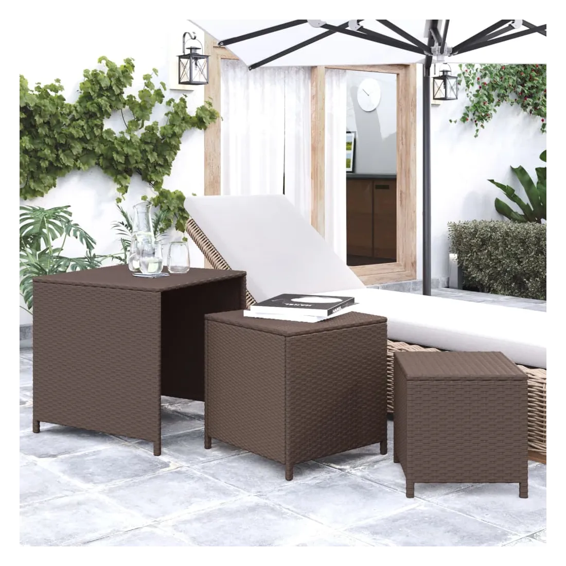 vidaXLCes tables gigognes de différentes tailles sont simples mais fonctionnelles, ce qui en fait un point central dans n'importe quel espace. Matériau durable : la résine tressée, également connue sous le nom de rotin poly, résiste aux intempéries et est facile à nettoyer. Elle reste belle à l'extérieur pendant une longue période. Elle est plus économique que d'autres matériaux, tout en offrant une excellente qualité, une commodité et un aspect esthétique.Cadre robuste : les cadres en acier enduit de poudre de ces tables basses gigognes offrent robustesse et stabilité.Design d'imbrication : grâce à la différence de taille, ces tables d'appoint gigognes peuvent non seulement répondre à vos multiples besoins, mais offrent également un espace supplémentaire et un rangement facile lorsque les plus petites tables sont cachées sous la plus grande.Dessus de table stable : le dessus de table robuste de l'ensemble de tables gigognes est idéal pour reposer vos boissons ou tout autre nécessaire dont vous avez besoin à portée de main. Bon à savoir :Pour faciliter au maximum le montage, chaque produit est livré avec des instructions. Remarque :Pour que vos meubles d'extérieur restent beaux, nous vous recommandons de les protéger avec une housse imperméable.
