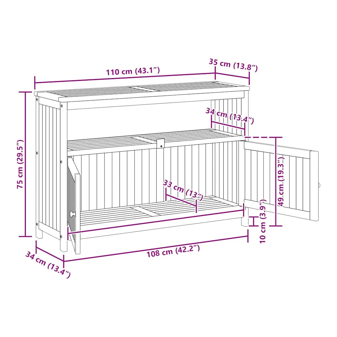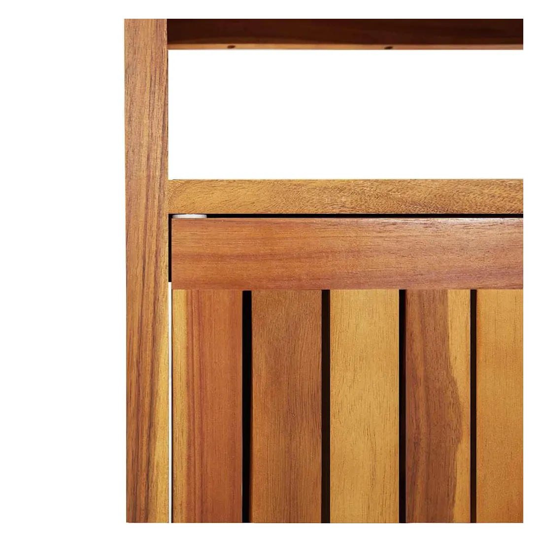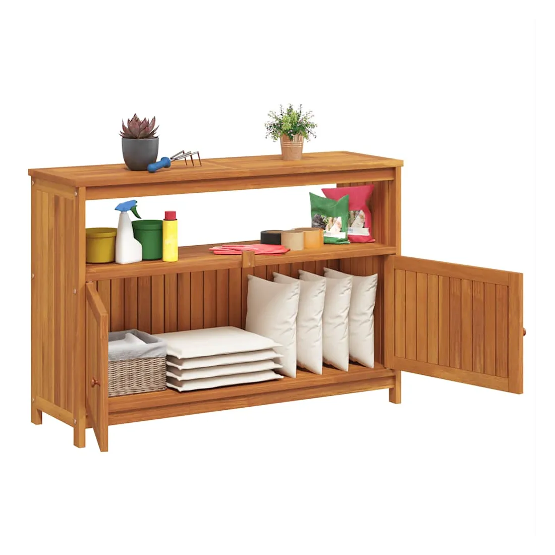Cette table console de jardin en bois est conçue pour ajouter un style rustique unique à votre espace intérieur et extérieur. Matériau durable : le bois d'acacia massif est un matériau naturel magnifique. Le bois d'acacia un bois dur tropical, qui est dense, robuste et durable.Cadre stable : le cadre en bois de la table console assure robustesse et stabilité.Grand espace de rangement : la table d'extérieur est dotée d'une étagère et d'un compartiment avec des portes, offrant un grand espace de rangement pour garder vos différents articles essentiels quotidiens bien organisés et facilement accessibles.Portes pratiques : protégez vos objets essentiels de la poussière en les cachant derrière les portes de la table de jardin. Attention :Pour éviter qu'il ne soit renversé, ce produit doit être utilisé avec le dispositif de fixation au mur fourni. Bon à savoir :Pour que vos meubles d'extérieur restent beaux, nous vous recommandons de les protéger avec une housse imperméable.