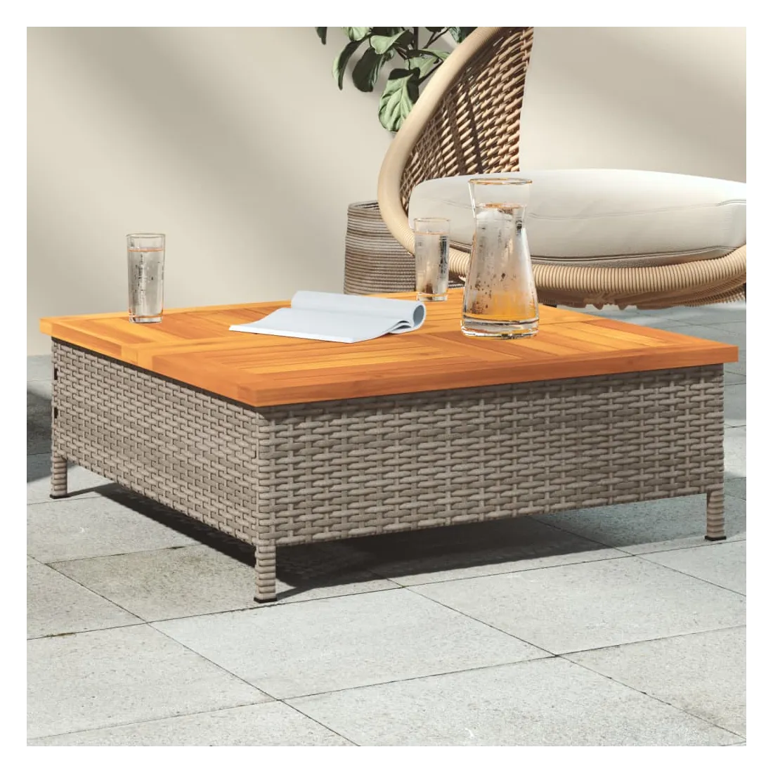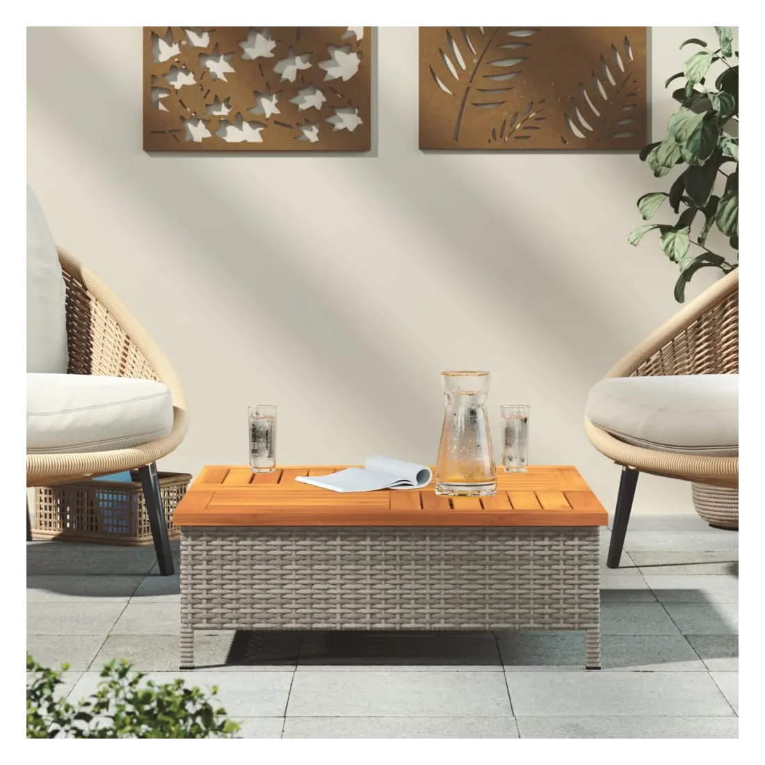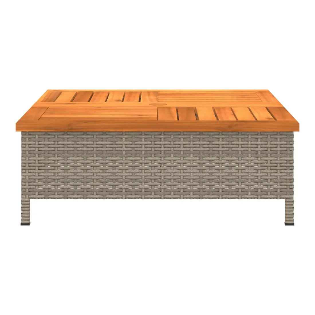 Rassemblez-vous autour de cette table de jardin pour savourer une tasse de café ou discuter avec votre famille et vos amis dans le jardin, dans la cour ou sur la terrasse ! Matériau durable : la résine tressée, également connue sous le nom de poly rotin, est un matériau synthétique solide et nécessitant peu d'entretien qui ressemble au rotin naturel. Il est léger, facile à nettoyer et couramment utilisé pour les meubles d'extérieur en raison de sa durabilité et de ses propriétés de résistance aux intempéries.Trou pour parasol pratique : le dessus de table est doté d'un trou pour parasol, ce qui vous permet de fixer facilement un parasol pour créer un coin ombragé.Dessus stable et facile à nettoyer : cette table de jardin a un dessus en bois d'acacia robuste, durable et facile à nettoyer avec un chiffon humide.Cadre robuste et stable : le cadre en acier enduit de poudre assure la solidité et la stabilité du meuble de jardin pour une utilisation quotidienne à l'extérieur. Bon à savoir :Pour que vos meubles d'extérieur restent beaux, nous vous recommandons de les protéger avec une housse imperméable.
