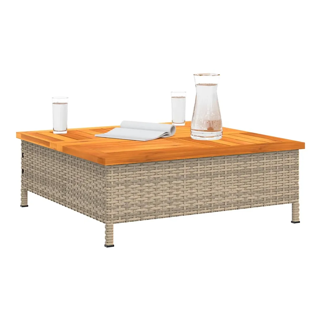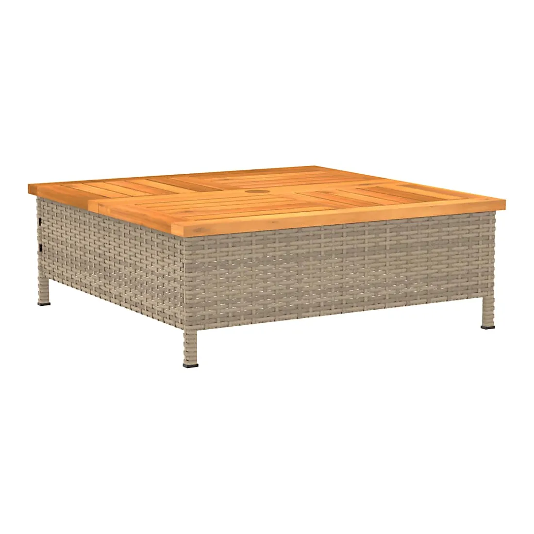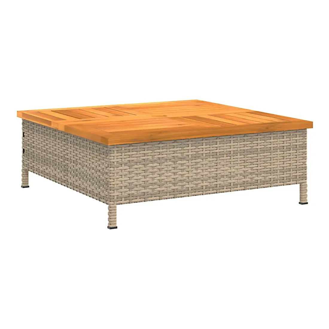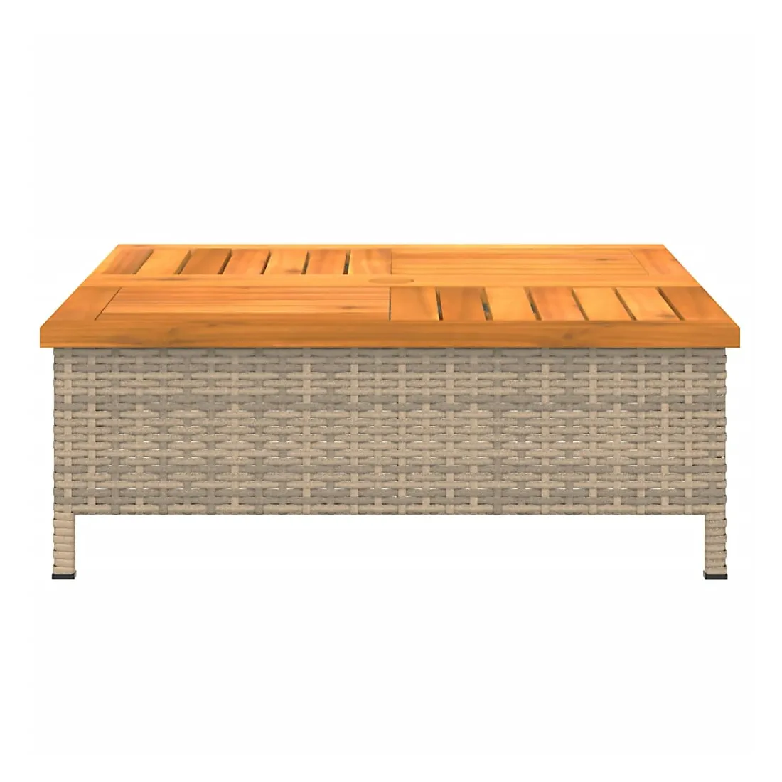 Rassemblez-vous autour de cette table de jardin pour savourer une tasse de café ou discuter avec votre famille et vos amis dans le jardin, dans la cour ou sur la terrasse ! Matériau durable : la résine tressée, également connue sous le nom de poly rotin, est un matériau synthétique solide et nécessitant peu d'entretien qui ressemble au rotin naturel. Il est léger, facile à nettoyer et couramment utilisé pour les meubles d'extérieur en raison de sa durabilité et de ses propriétés de résistance aux intempéries.Trou pour parasol pratique : le dessus de table est doté d'un trou pour parasol, ce qui vous permet de fixer facilement un parasol pour créer un coin ombragé.Dessus stable et facile à nettoyer : cette table de jardin a un dessus en bois d'acacia robuste, durable et facile à nettoyer avec un chiffon humide.Cadre robuste et stable : le cadre en acier enduit de poudre assure la solidité et la stabilité du meuble de jardin pour une utilisation quotidienne à l'extérieur. Bon à savoir :Pour que vos meubles d'extérieur restent beaux, nous vous recommandons de les protéger avec une housse imperméable.