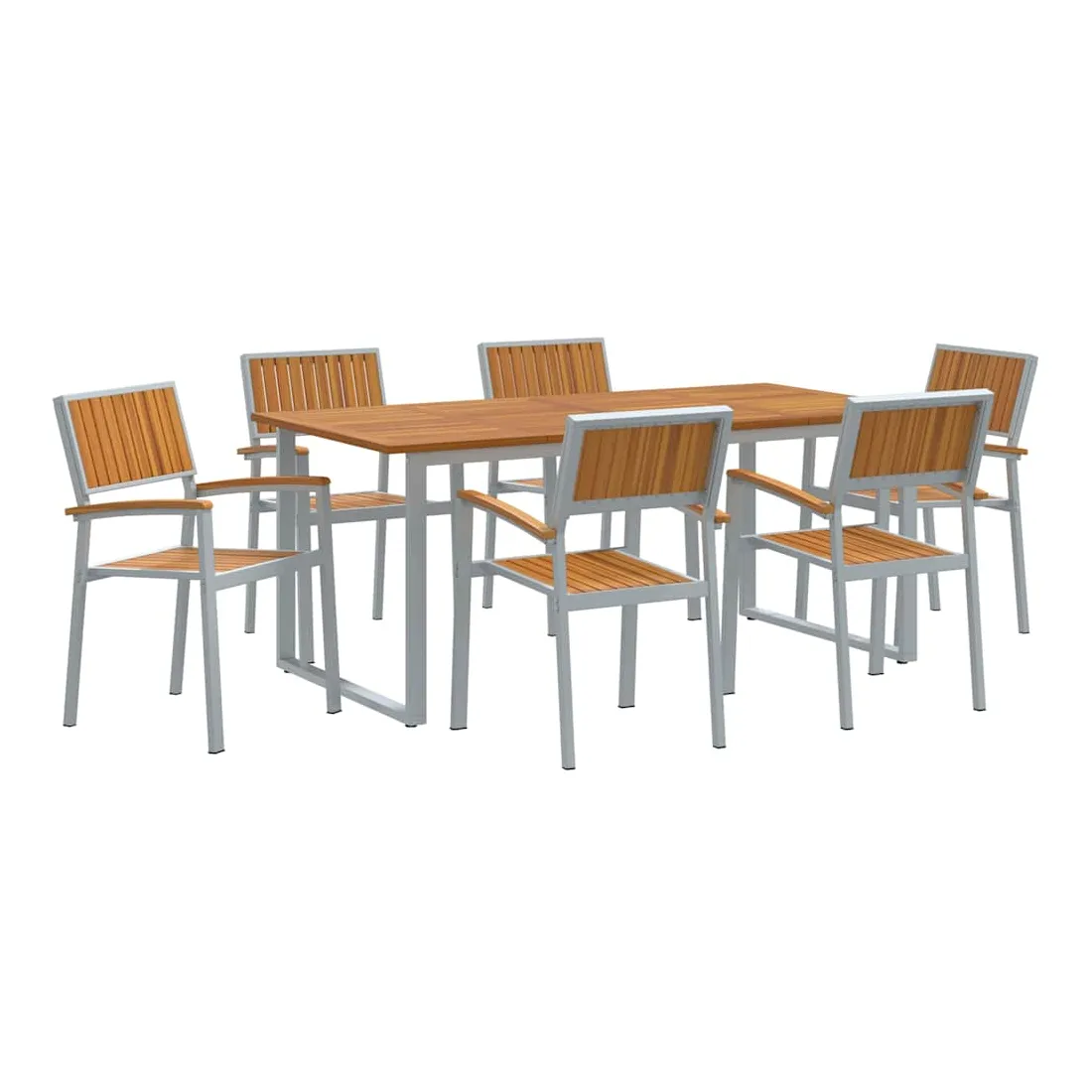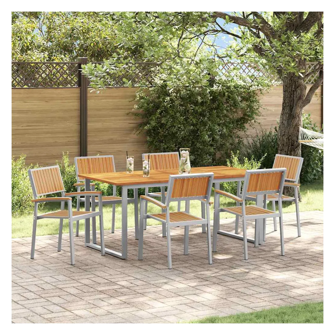 Cet ensemble moderne de salle à manger de jardin est fait pour les espaces extérieurs actuels, offrant une solution à la fois stylée et pratique pour vos repas en plein air. Avec ses lignes épurées et sa simplicité, il se fond facilement dans presque tous les cadres extérieurs, vous permettant de profiter de bons repas et de moments entre amis. La finition en bois d'acacia et la forme géométrique ajoutent un côté naturel et chic qui embellit votre ambiance extérieure. Matériaux de qualité : Cet ensemble est fait de bois d'acacia massif, connu pour sa belle texture et son côté naturel. Le cadre en acier robuste assure une résistance aux intempéries, garantissant durabilité et allure sous le soleil comme sous la pluie, idéal pour les repas en extérieur toute l'année. Composants inclus : Comprend des accoudoirs et dossiers en bois d'acacia solide, plus une grande table rectangulaire. Le bois d'acacia apporte confort et longévité, parfait pour partager des repas en famille et des soirées en extérieur. Style et fonction : Le design moderne avec ses lignes épurées et peu de fioritures donne une impression accueillante mais discrète. Il s'adapte aisément à différents styles de déco, apportant une touche moderne à vos jardins ou terrasses. Utilisations recommandées : Idéal pour jardins et terrasses, cet ensemble est parfait pour toutes vos activités extérieures, des petits rassemblements aux grandes fêtes. Sa taille généreuse permet d’accueillir plusieurs invités avec de bons plats. Entretien facile : Pour garder votre ensemble au top, un petit coup de chiffon sec pour la poussière suffit. Sa résistance à l'usure permet un entretien simple et un plaisir qui dure.