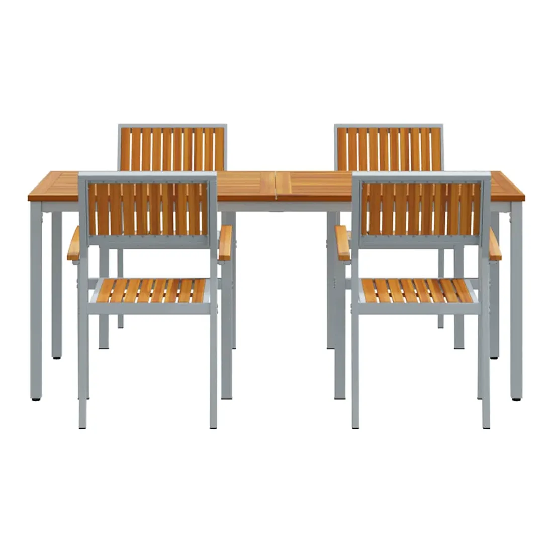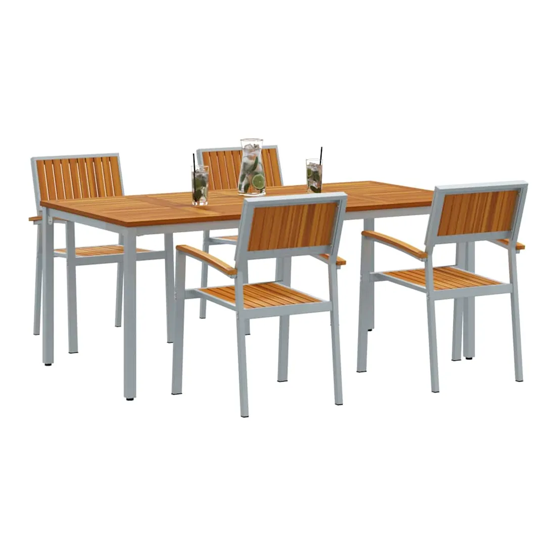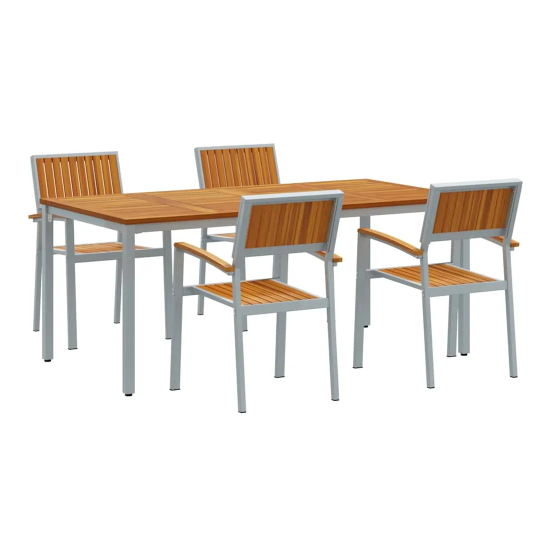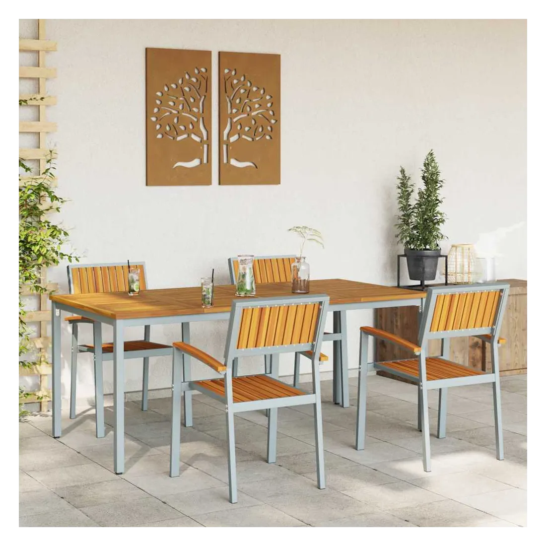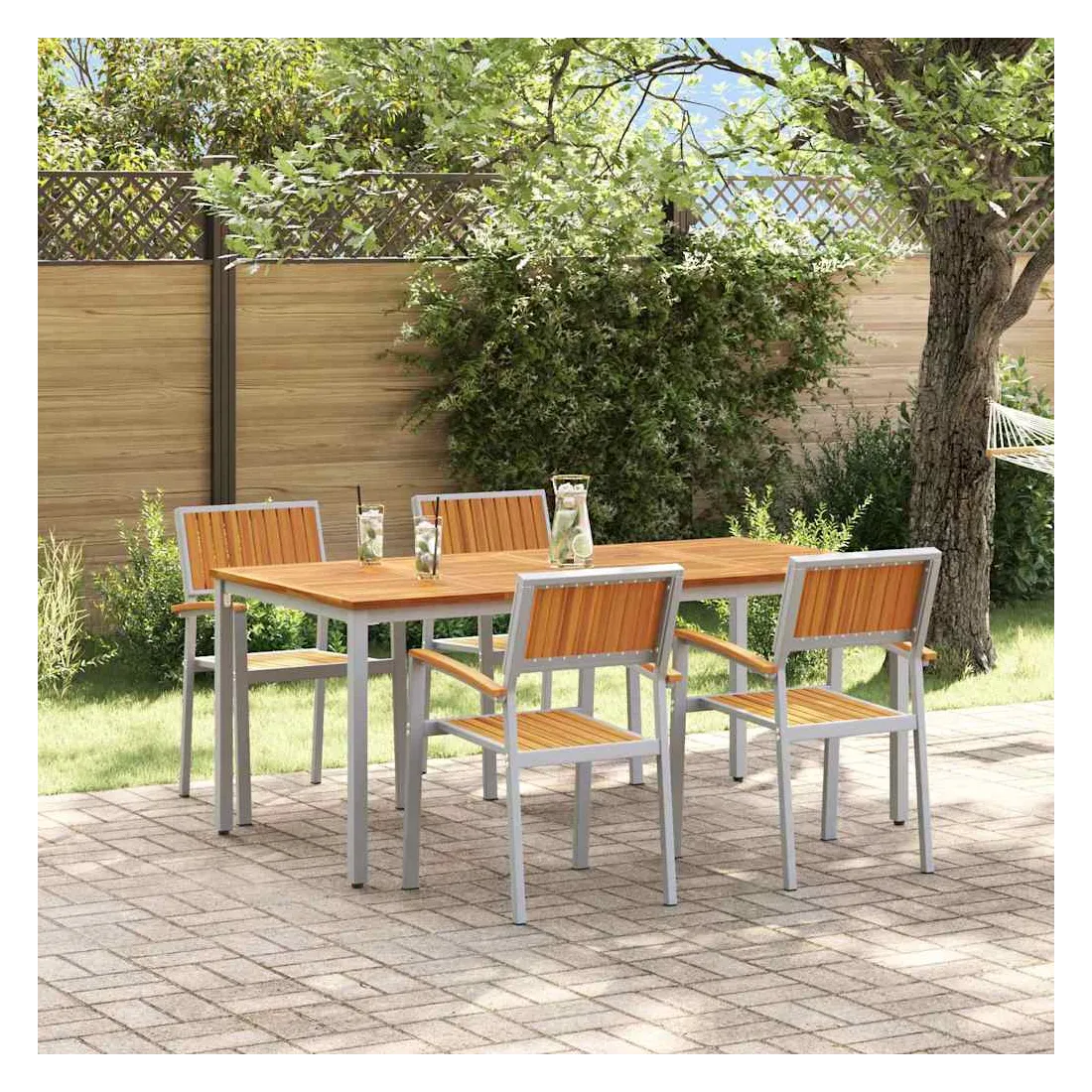 Cet ensemble de salle à manger de jardin est à la fois élégant et pratique, il redéfinit ce que signifie être à l'aise et joli dehors. Avec un style moderne, il affiche sa simplicité et sa fonctionnalité grâce à des lignes épurées qui s'intègrent parfaitement à tout jardin ou terrasse. Fabriqué en bois d'acacia massif et en acier, chaque pièce est conçue pour offrir un charme qui s'accorde avec tous les styles, modernes ou classiques. Que ce soit pour un BBQ d'été, un repas tranquille ou des invités, cet ensemble de salle à manger élève vos moments en plein air sans effort. Matériaux durables: Fabriqué en bois d'acacia massif de qualité, avec une belle teinte brune, ça résiste aux intempéries et à l'usure, parfait pour l'extérieur. Les éléments en acier apportent force et stabilité, assurant que cet ensemble tienne le coup au quotidien tout en restant chic. Accoudoirs et dossier stylés: Chaise avec dossier et accoudoirs en bois d'acacia massif, confort et visuel au rendez-vous. La belle finition rehausse l'apparence, rendant l'assise accueillante et relaxante. Design moderne: Ce look moderne avec des lignes épurées et un style minimaliste apporte une touche élégante à votre extérieur. Son design simple s'associe facilement à différents styles de déco, que ce soit décontracté ou plus chic. Utilisation pratique: Pensé pour être super fonctionnel, cet ensemble de salle à manger se place parfaitement dans les jardins ou sur les terrasses, alliant style et praticité. Sa construction robuste est idéale pour des brunchs tranquilles, des repas en famille ou des soirées entre amis, rendant votre espace extérieur agréable. Entretien facile: Pratique à entretenir, il suffit de passer un coup de chiffon sec pour le garder en bon état. Son entretien minimal garantit qu'il reste beau, vous offrant une belle expérience de repas en extérieur, année après année.