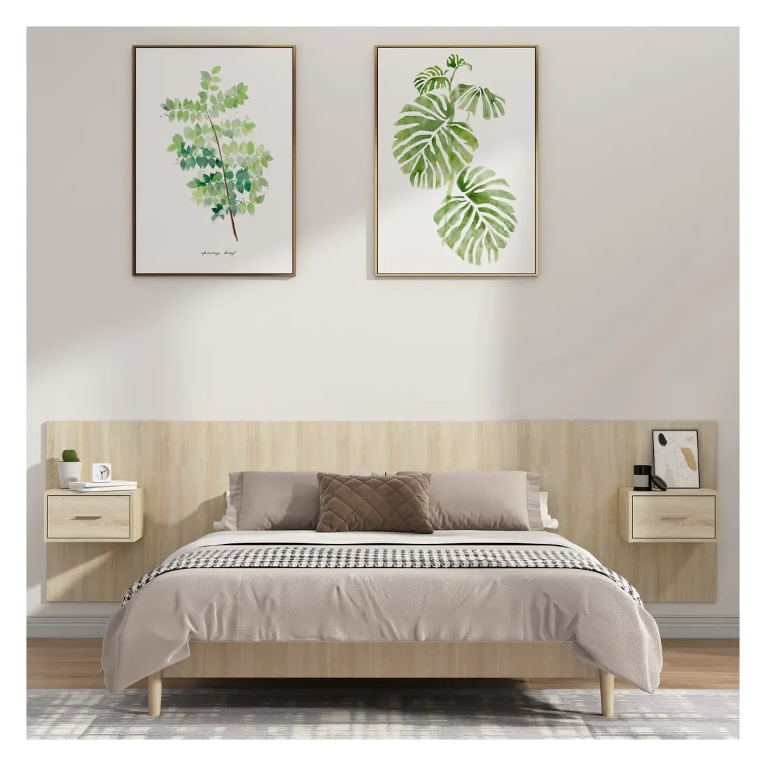 La tête de lit robuste avec armoires, au design classique, donne à votre cadre de lit un aspect complet et convient à toute chambre à coucher. Matériau robuste : le bois d'ingénierie est d'une qualité exceptionnelle avec une surface lisse et présente également résistance, stabilité et résistance à l'humidité.Design mural : les tables de chevet flottantes et la tête de lit peuvent être fixées au mur. De cette façon, vous pouvez maximiser votre espace au sol et garder la zone propre.Espace de rangement : l'unité de chevet dispose d'un espace de rangement spacieux qui vous permet de garder vos affaires organisées. ATTENTION :Les vis et les chevilles pour l'intérieur du mur ne sont pas incluses. Recherchez et utilisez des vis et des chevilles adaptées à vos murs. Si vous n'êtes pas sûr, demandez conseil à un professionnel. Lisez et suivez attentivement chaque étape des instructions.