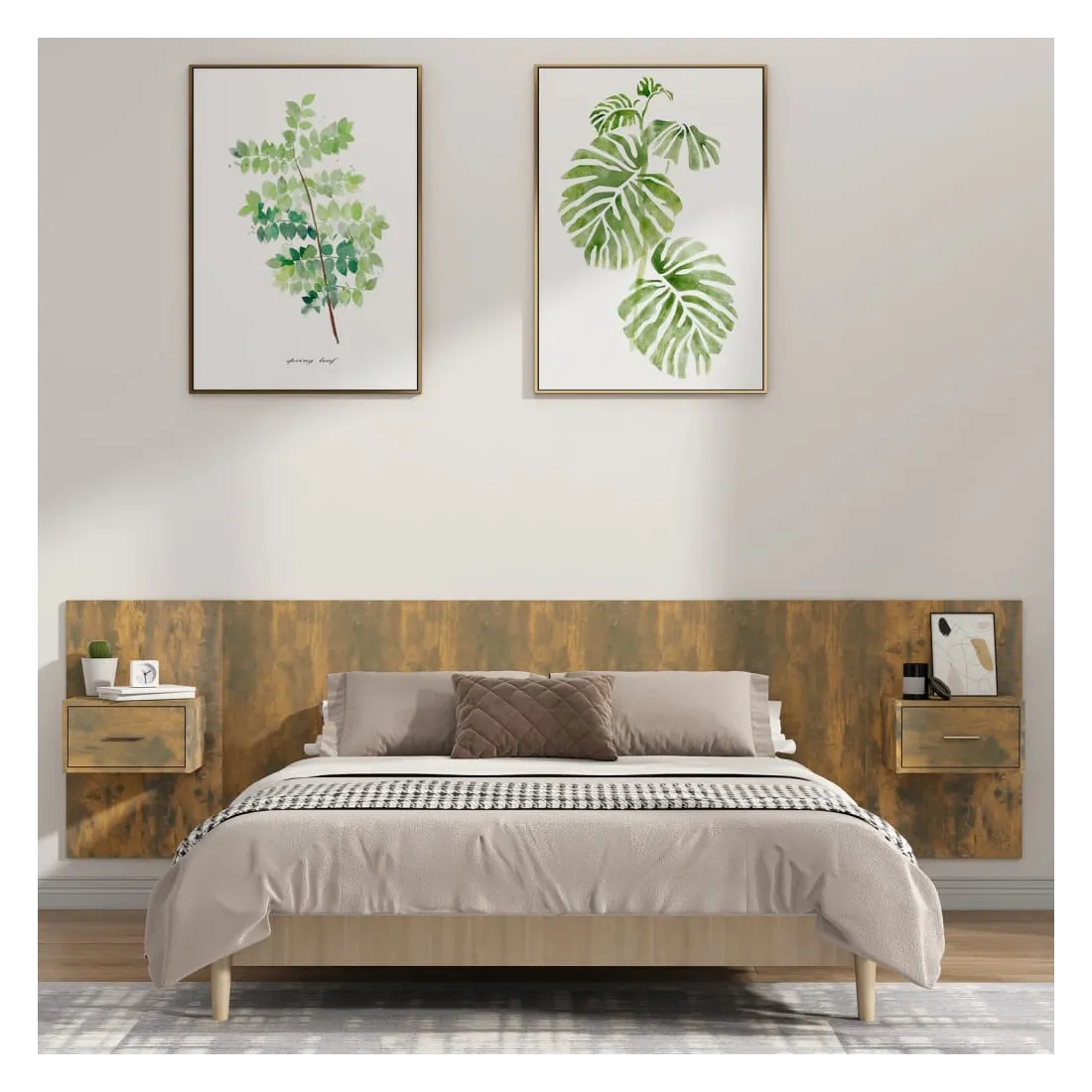 La tête de lit robuste avec armoires, au design classique, donne à votre cadre de lit un aspect complet et convient à toute chambre à coucher. Matériau robuste : le bois d'ingénierie est d'une qualité exceptionnelle avec une surface lisse et présente également résistance, stabilité et résistance à l'humidité. Design mural : les tables de chevet flottantes et la tête de lit peuvent être fixées au mur. De cette façon, vous pouvez maximiser votre espace au sol et garder la zone propre. Espace de rangement : l'unité de chevet dispose d'un espace de rangement spacieux qui vous permet de garder vos affaires organisées. ATTENTION : Les vis et les chevilles pour l'intérieur du mur ne sont pas incluses. Recherchez et utilisez des vis et des chevilles adaptées à vos murs. Si vous n'êtes pas sûr,