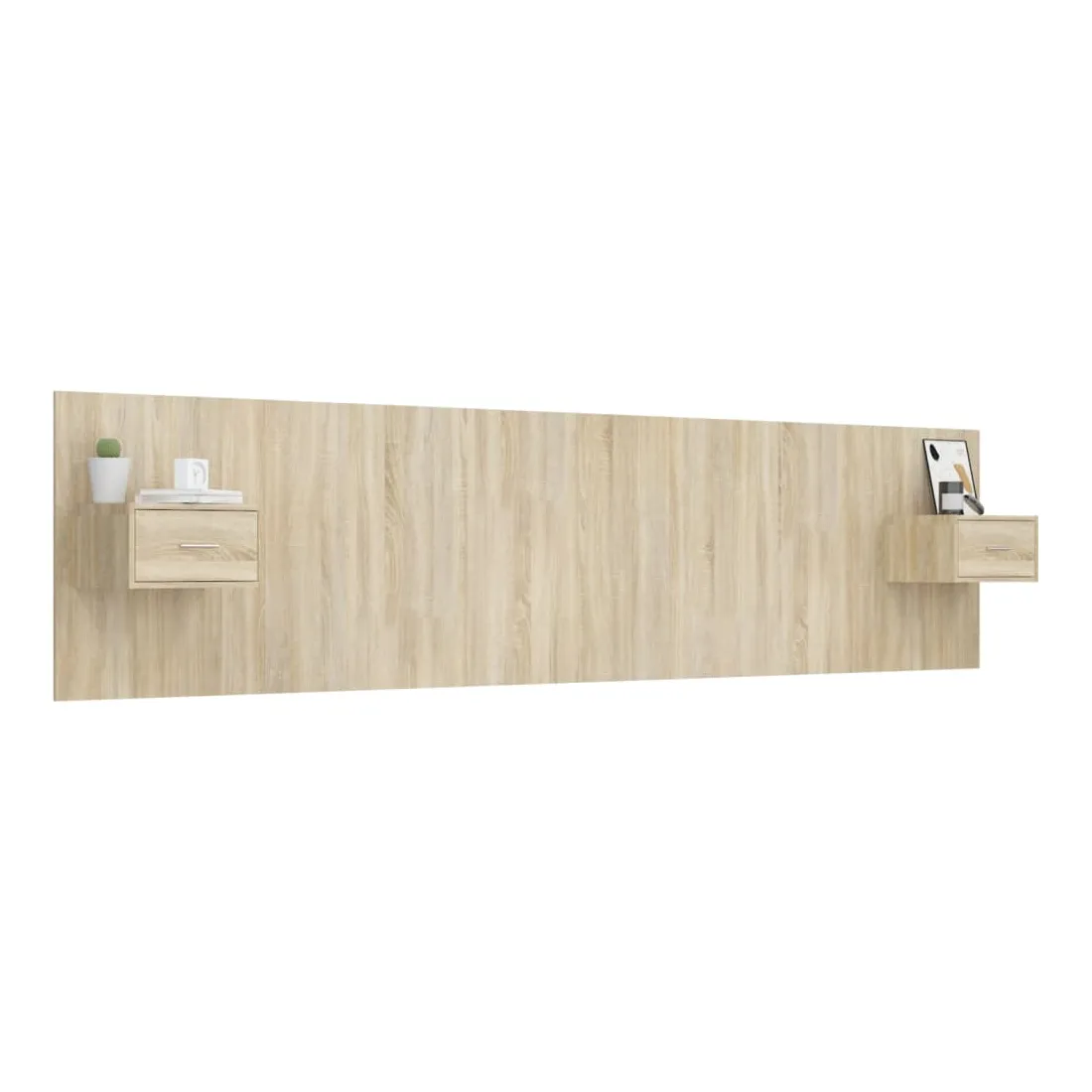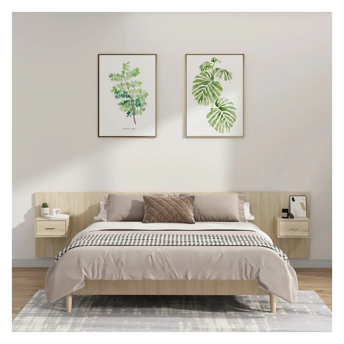 La tête de lit robuste avec armoires, au design classique, donne à votre cadre de lit un aspect complet et convient à toute chambre à coucher. Matériau robuste : le bois d'ingénierie est d'une qualité exceptionnelle avec une surface lisse et présente également résistance, stabilité et résistance à l'humidité.Design mural : les tables de chevet flottantes et la tête de lit peuvent être fixées au mur. De cette façon, vous pouvez maximiser votre espace au sol et garder la zone propre.Espace de rangement : l'unité de chevet dispose d'un espace de rangement spacieux qui vous permet de garder vos affaires organisées. ATTENTION :Les vis et les chevilles pour l'intérieur du mur ne sont pas incluses. Recherchez et utilisez des vis et des chevilles adaptées à vos murs. Si vous n'êtes pas sûr, demandez conseil à un professionnel. Lisez et suivez attentivement chaque étape des instructions.