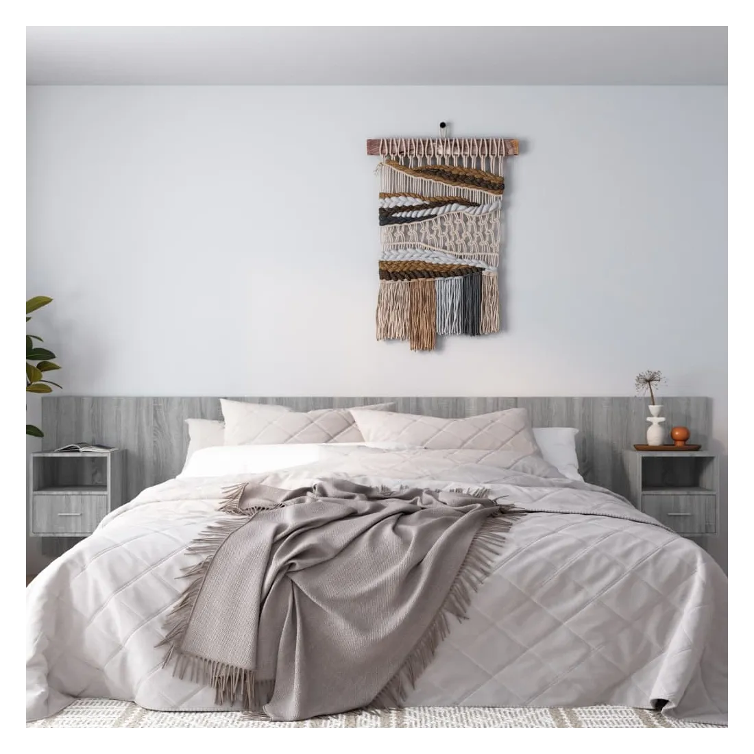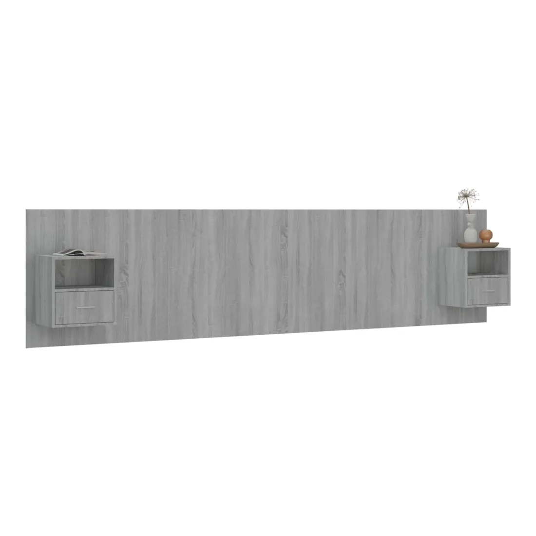 La tête de lit robuste avec armoires, au design classique, donne à votre cadre de lit un aspect complet et convient à toute chambre à coucher. Matériau robuste : le bois d'ingénierie est d'une qualité exceptionnelle avec une surface lisse et présente également résistance, stabilité et résistance à l'humidité.Design mural : les tables de chevet flottantes et la tête de lit peuvent être fixées au mur. De cette façon, vous pouvez maximiser votre espace au sol et garder la zone propre.Espace de rangement : l'unité de chevet dispose d'un espace de rangement spacieux qui vous permet de garder vos affaires organisées. ATTENTION :Les vis et les chevilles pour l'intérieur du mur ne sont pas incluses. Recherchez et utilisez des vis et des chevilles adaptées à vos murs. Si vous n'êtes pas sûr, demandez conseil à un professionnel. Lisez et suivez attentivement chaque étape des instructions.