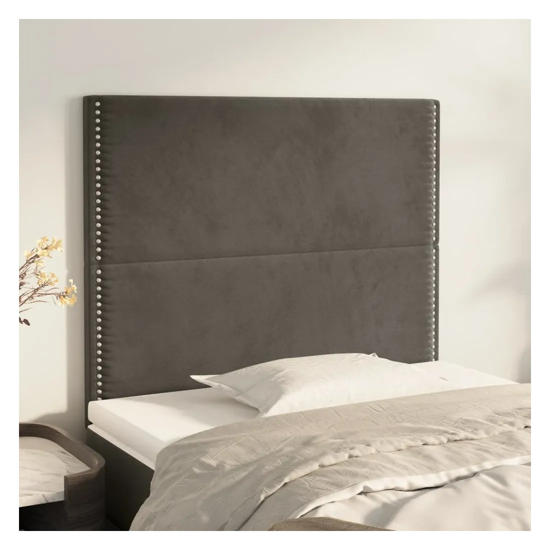 Cette tête de lit classique au design élégant complète parfaitement votre cadre de lit et s'adapte à toutes les chambres. Velours doux : Le velours est un tissu doux et luxueux qui se distingue par ses fibres denses et régulières. Il offre un toucher doux et agréable.Pieds robustes et stables : Les pieds en bois garantissent robustesse et stabilité.Hauteur réglable : La tête de lit est réglable en hauteur selon vos préférences.Excellent soutien : La tête de lit offre un excellent soutien dorsal lorsque vous êtes assis dans votre lit pour lire ou regarder la télévision.Design élégant : Les rivets sur les bords rehaussent la beauté classique de cette tête de lit rembourrée. Remarque :La livraison comprend uniquement la tête de lit. Le cadre de lit et le matelas ne sont pas inclus. Vous pouvez consulter notre boutique pour les cadres et matelas assortis.Chaque produit est livré avec un manuel de montage dans la boîte pour un assemblage facile.