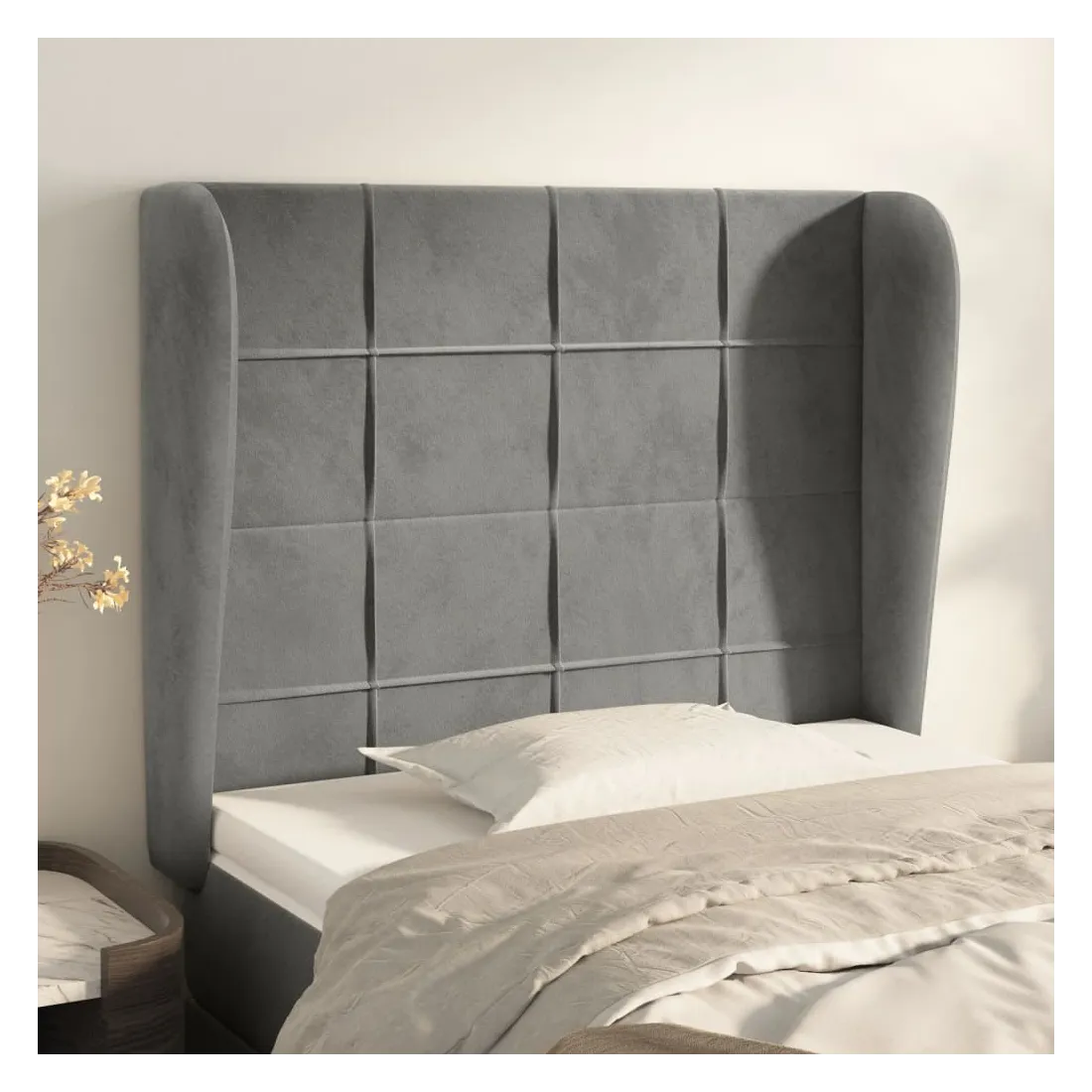 Cette tête de lit avec oreilles classique au design élégant donne à votre cadre de lit un aspect complet et convient à toute chambre à coucher. Velours doux : le velours est un tissu doux et luxueux qui se reconnaît à son tas dense de fibres uniformément coupées qui ont une touche lisse. Le tissu en velours présente un toucher doux distinctif, ce qui le rend confortable au toucher.Des pieds robustes et stables : les pieds en bois assurent la robustesse et la stabilité.Hauteur réglable : la tête de lit est réglable en hauteur selon vos préférences.Excellent soutien : la tête de lit vous offre un excellent soutien du dos lorsque vous êtes assis dans votre lit pour lire ou regarder la télévision. Remarque :La livraison comprend uniquement la tête de lit. Le cadre de lit et le matelas ne sont pas inclus. Vous pouvez consulter notre boutique pour les cadres et matelas assortis.Chaque produit est livré avec un manuel de montage dans la boîte pour un montage facile.