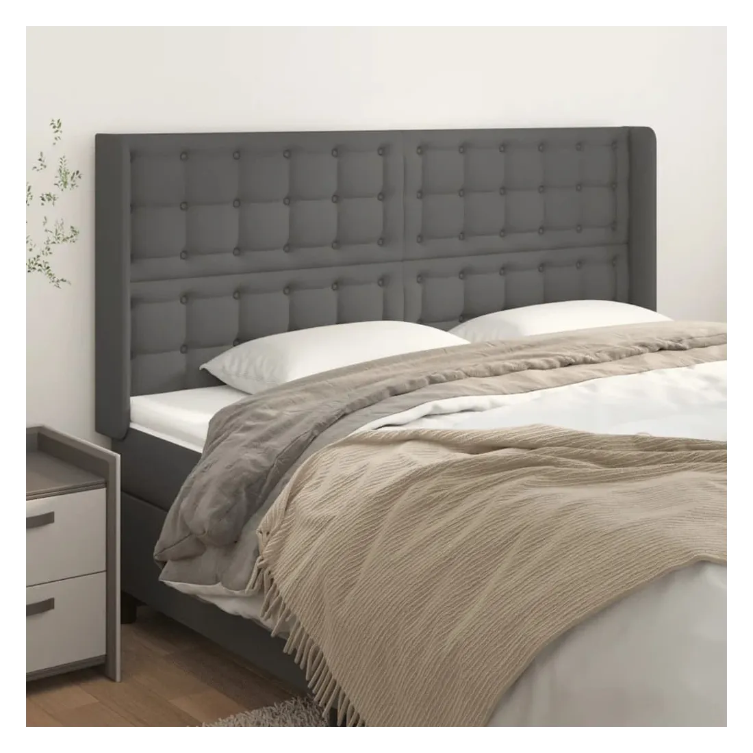 Cette tête de lit avec oreilles classique au design élégant donne à votre cadre de lit un aspect complet et convient à toute chambre à coucher. Similicuir durable : le similicuir de qualité supérieure est un matériau très durable. Il est résistant aux taches, ce qui le rend facile à nettoyer avec un chiffon humide. La surface lisse donne également un aspect luxueux et la beauté du cuir véritable.Pieds robustes et stables : les pieds en bois assurent la robustesse et la stabilité.Hauteur réglable : la tête de lit est réglable en hauteur selon vos préférences.Excellent soutien : la tête de lit vous offre un excellent soutien du dos lorsque vous êtes assis dans votre lit pour lire ou regarder la télévision. Remarque :La livraison comprend uniquement la tête de lit. Le cadre de lit et le matelas ne sont pas inclus. Vous pouvez consulter notre boutique pour les cadres et matelas assortis.Chaque produit est livré avec un manuel de montage dans la boîte pour un montage facile.