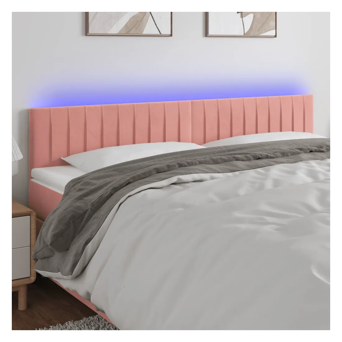 Cette tête de lit à LED classique, au design élégant, donne à votre cadre de lit une touche de modernité étonnante et convient parfaitement à toute chambre à coucher. Velours doux : le velours est un tissu doux et luxueux qui se reconnaît à son tas dense de fibres uniformément coupées qui ont une touche lisse. Le tissu en velours présente un toucher doux distinctif, ce qui le rend confortable au toucher.LED colorée : apportez de l'éclairage dans l'obscurité avec des lumières LED colorées !Hauteur réglable : la tête de lit est réglable en hauteur selon vos préférences.Excellent soutien : la tête de lit vous offre un excellent soutien du dos lorsque vous êtes assis dans votre lit pour lire ou regarder la télévision.Bande à LED découpable : cette bande à LED flexible peut être ajustée en longueur. Le symbole des ciseaux indique où la bande peut être coupée en toute sécurité sans l'endommager. Remarque :Seule la partie avec un symbole de ciseaux peut être coupée et seule la partie avec l'USB continuera à fonctionner comme avant.Chaque produit est livré avec un manuel de montage dans la boîte pour un montage facile.Ce produit est doté d'un connecteur USB, mais la source d'alimentation certifiée de USB 5V n'est pas incluse.