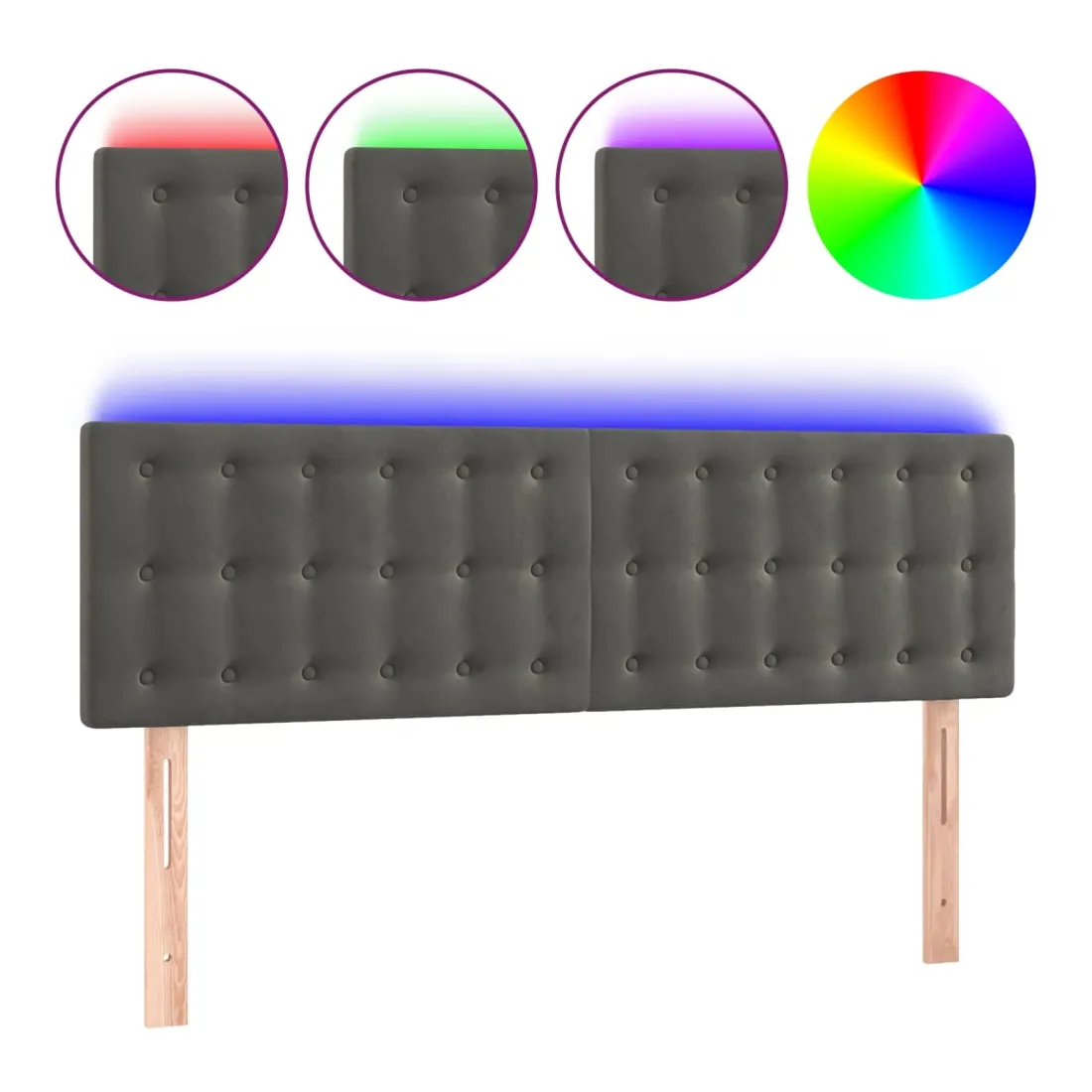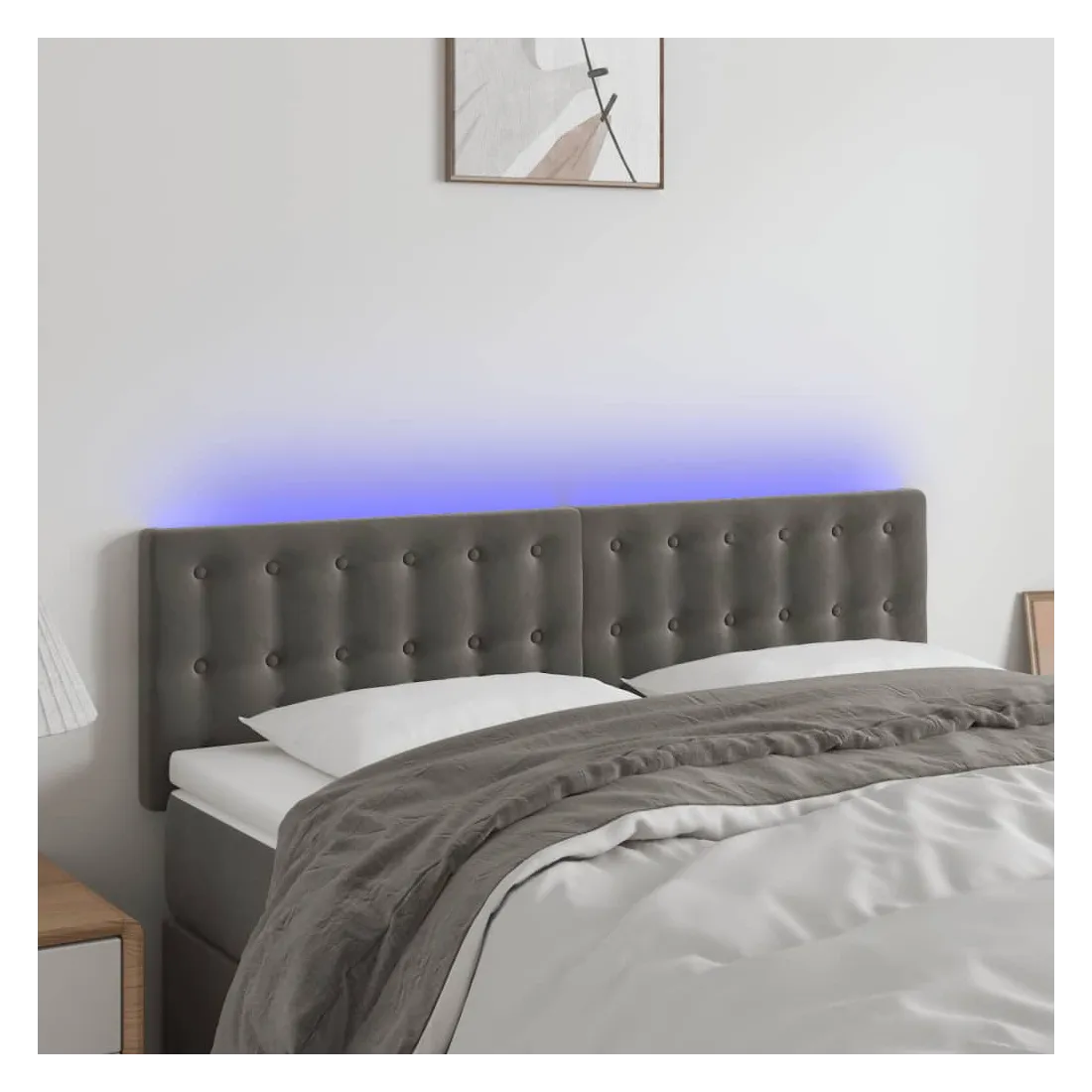 Cette tête de lit à LED classique, au design élégant, donne à votre cadre de lit une touche de modernité étonnante et convient parfaitement à toute chambre à coucher. Velours doux : le velours est un tissu doux et luxueux qui se reconnaît à son tas dense de fibres uniformément coupées qui ont une touche lisse. Le tissu en velours présente un toucher doux distinctif, ce qui le rend confortable au toucher.LED colorée : apportez de l'éclairage dans l'obscurité avec des lumières LED colorées !Hauteur réglable : la tête de lit est réglable en hauteur selon vos préférences.Excellent soutien : la tête de lit vous offre un excellent soutien du dos lorsque vous êtes assis dans votre lit pour lire ou regarder la télévision.Bande à LED découpable : cette bande à LED flexible peut être ajustée en longueur. Le symbole des ciseaux indique où la bande peut être coupée en toute sécurité sans l'endommager. Remarque :Seule la partie avec un symbole de ciseaux peut être coupée et seule la partie avec l'USB continuera à fonctionner comme avant.Chaque produit est livré avec un manuel de montage dans la boîte pour un montage facile.Ce produit est doté d'un connecteur USB, mais la source d'alimentation certifiée de USB 5V n'est pas incluse.