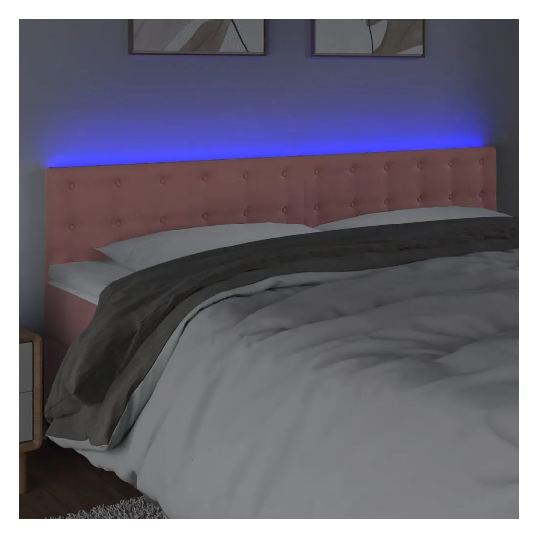 Cette tête de lit à LED classique, au design élégant, donne à votre cadre de lit une touche de modernité étonnante et convient parfaitement à toute chambre à coucher. Velours doux : le velours est un tissu doux et luxueux qui se reconnaît à son tas dense de fibres uniformément coupées qui ont une touche lisse. Le tissu en velours présente un toucher doux distinctif, ce qui le rend confortable au toucher.LED colorée : apportez de l'éclairage dans l'obscurité avec des lumières LED colorées !Hauteur réglable : la tête de lit est réglable en hauteur selon vos préférences.Excellent soutien : la tête de lit vous offre un excellent soutien du dos lorsque vous êtes assis dans votre lit pour lire ou regarder la télévision.Bande à LED découpable : cette bande à LED flexible peut être ajustée en longueur. Le symbole des ciseaux indique où la bande peut être coupée en toute sécurité sans l'endommager. Remarque :Seule la partie avec un symbole de ciseaux peut être coupée et seule la partie avec l'USB continuera à fonctionner comme avant.Chaque produit est livré avec un manuel de montage dans la boîte pour un montage facile.Ce produit est doté d'un connecteur USB, mais la source d'alimentation certifiée de USB 5V n'est pas incluse.
