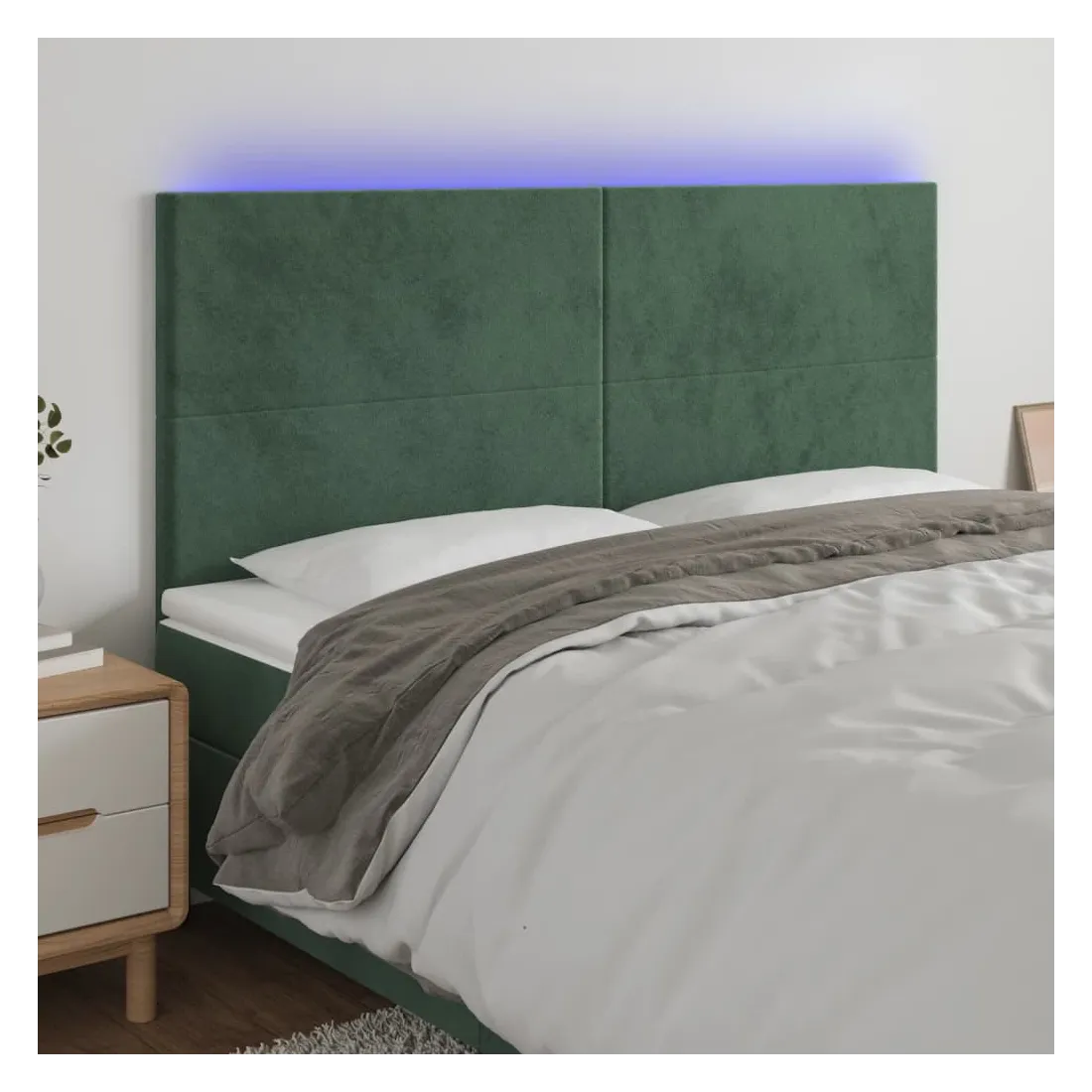 Cette tête de lit à LED classique, au design élégant, donne à votre cadre de lit une touche de modernité étonnante et convient parfaitement à toute chambre à coucher. Velours doux : le velours est un tissu doux et luxueux qui se reconnaît à son tas dense de fibres uniformément coupées qui ont une touche lisse. Le tissu en velours présente un toucher doux distinctif, ce qui le rend confortable au toucher.LED colorée : apportez de l'éclairage dans l'obscurité avec des lumières LED colorées !Hauteur réglable : la tête de lit est réglable en hauteur selon vos préférences.Excellent soutien : la tête de lit vous offre un excellent soutien du dos lorsque vous êtes assis dans votre lit pour lire ou regarder la télévision.Bande à LED découpable : cette bande à LED flexible peut être ajustée en longueur. Le symbole des ciseaux indique où la bande peut être coupée en toute sécurité sans l'endommager. Remarque :Seule la partie avec un symbole de ciseaux peut être coupée et seule la partie avec l'USB continuera à fonctionner comme avant.Chaque produit est livré avec un manuel de montage dans la boîte pour un montage facile.Ce produit est doté d'un connecteur USB, mais la source d'alimentation certifiée de USB 5V n'est pas incluse.