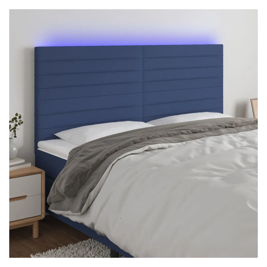 Cette tête de lit à LED classique, au design élégant, donne à votre cadre de lit une touche de modernité étonnante et convient parfaitement à toute chambre à coucher. Tissu durable : le tissu présente un aspect simple et épuré, et il est respirant et durable. LED colorée : apportez de l'éclairage dans l'obscurité avec des lumières LED colorées ! Hauteur réglable : la tête de lit est réglable en hauteur selon vos préférences. Excellent soutien : la tête de lit vous offre un excellent soutien du dos lorsque vous êtes assis dans votre lit pour lire ou regarder la télévision. Bande à LED découpable : cette bande à LED flexible peut être ajustée en longueur. Le symbole des ciseaux indique où la bande peut être coupée en toute sécurité sans l'endommager. Remarque : Seule la partie avec un sy