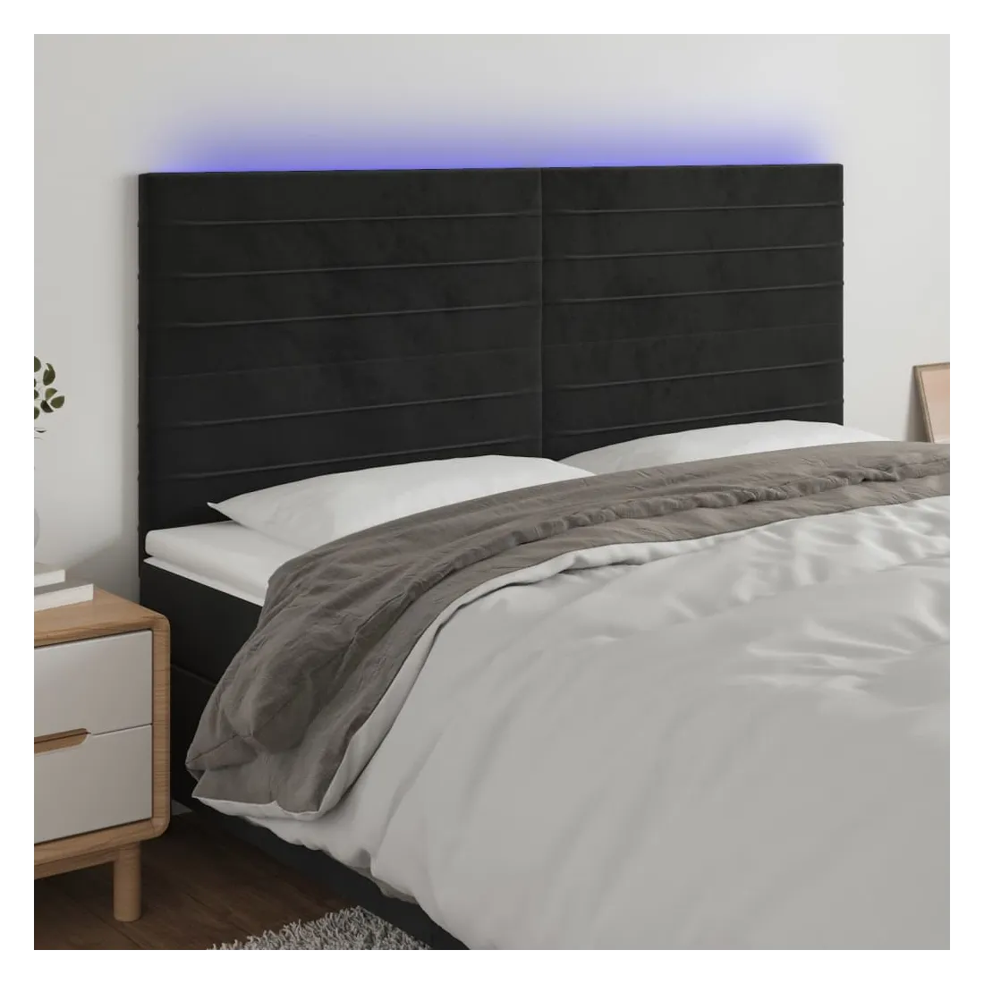 Cette tête de lit à LED classique, au design élégant, donne à votre cadre de lit une touche de modernité étonnante et convient parfaitement à toute chambre à coucher. Velours doux : le velours est un tissu doux et luxueux qui se reconnaît à son tas dense de fibres uniformément coupées qui ont une touche lisse. Le tissu en velours présente un toucher doux distinctif, ce qui le rend confortable au toucher.LED colorée : apportez de l'éclairage dans l'obscurité avec des lumières LED colorées !Hauteur réglable : la tête de lit est réglable en hauteur selon vos préférences.Excellent soutien : la tête de lit vous offre un excellent soutien du dos lorsque vous êtes assis dans votre lit pour lire ou regarder la télévision.Bande à LED découpable : cette bande à LED flexible peut être ajustée en longueur. Le symbole des ciseaux indique où la bande peut être coupée en toute sécurité sans l'endommager. Remarque :Seule la partie avec un symbole de ciseaux peut être coupée et seule la partie avec l'USB continuera à fonctionner comme avant.Chaque produit est livré avec un manuel de montage dans la boîte pour un montage facile.Ce produit est doté d'un connecteur USB, mais la source d'alimentation certifiée de USB 5V n'est pas incluse.