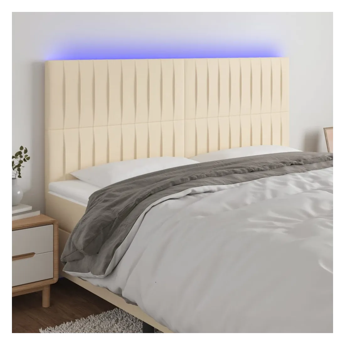 Cette tête de lit à LED classique, au design élégant, donne à votre cadre de lit une touche de modernité étonnante et convient parfaitement à toute chambre à coucher. Tissu durable : le tissu présente un aspect simple et épuré, et il est respirant et durable. LED colorée : apportez de l'éclairage dans l'obscurité avec des lumières LED colorées ! Hauteur réglable : la tête de lit est réglable en hauteur selon vos préférences. Excellent soutien : la tête de lit vous offre un excellent soutien du dos lorsque vous êtes assis dans votre lit pour lire ou regarder la télévision. Bande à LED découpable : cette bande à LED flexible peut être ajustée en longueur. Le symbole des ciseaux indique où la bande peut être coupée en toute sécurité sans l'endommager. Remarque : Seule la partie avec un sy