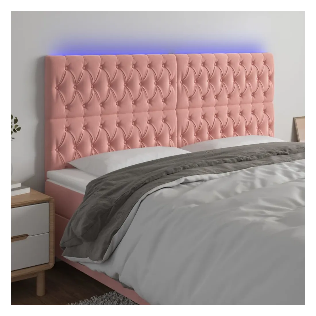 Cette tête de lit à LED classique, au design élégant, donne à votre cadre de lit une touche de modernité étonnante et convient parfaitement à toute chambre à coucher. Velours doux : le velours est un tissu doux et luxueux qui se reconnaît à son tas dense de fibres uniformément coupées qui ont une touche lisse. Le tissu en velours présente un toucher doux distinctif, ce qui le rend confortable au toucher.LED colorée : apportez de l'éclairage dans l'obscurité avec des lumières LED colorées !Hauteur réglable : la tête de lit est réglable en hauteur selon vos préférences.Excellent soutien : la tête de lit vous offre un excellent soutien du dos lorsque vous êtes assis dans votre lit pour lire ou regarder la télévision.Bande à LED découpable : cette bande à LED flexible peut être ajustée en longueur. Le symbole des ciseaux indique où la bande peut être coupée en toute sécurité sans l'endommager. Remarque :Seule la partie avec un symbole de ciseaux peut être coupée et seule la partie avec l'USB continuera à fonctionner comme avant.Chaque produit est livré avec un manuel de montage dans la boîte pour un montage facile.Ce produit est doté d'un connecteur USB, mais la source d'alimentation certifiée de USB 5V n'est pas incluse.