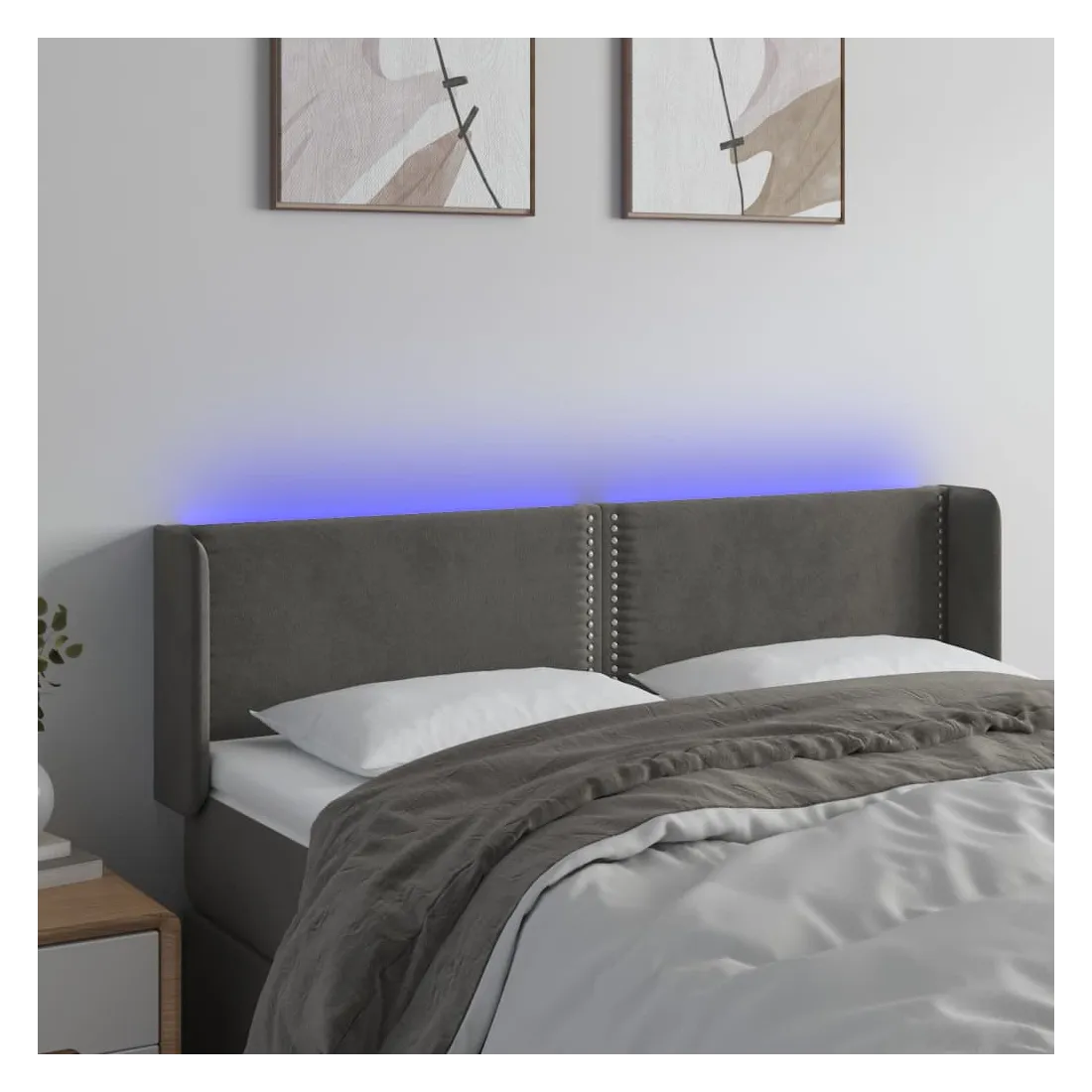 Cette tête de lit à LED classique, au design élégant, donne à votre cadre de lit une touche de modernité étonnante et convient parfaitement à toute chambre à coucher. Velours doux : le velours est un tissu doux et luxueux qui se reconnaît à son tas dense de fibres uniformément coupées qui ont une touche lisse. Le tissu en velours présente un toucher doux distinctif, ce qui le rend confortable au toucher.LED colorée : apportez de l'éclairage dans l'obscurité avec des lumières LED colorées !Hauteur réglable : la tête de lit est réglable en hauteur selon vos préférences.Excellent soutien : la tête de lit vous offre un excellent soutien du dos lorsque vous êtes assis dans votre lit pour lire ou regarder la télévision.Bande à LED découpable : cette bande à LED flexible peut être ajustée en longueur. Le symbole des ciseaux indique où la bande peut être coupée en toute sécurité sans l'endommager. Remarque :Seule la partie avec un symbole de ciseaux peut être coupée et seule la partie avec l'USB continuera à fonctionner comme avant.Chaque produit est livré avec un manuel de montage dans la boîte pour un montage facile.Ce produit est doté d'un connecteur USB, mais la source d'alimentation certifiée de USB 5V n'est pas incluse.