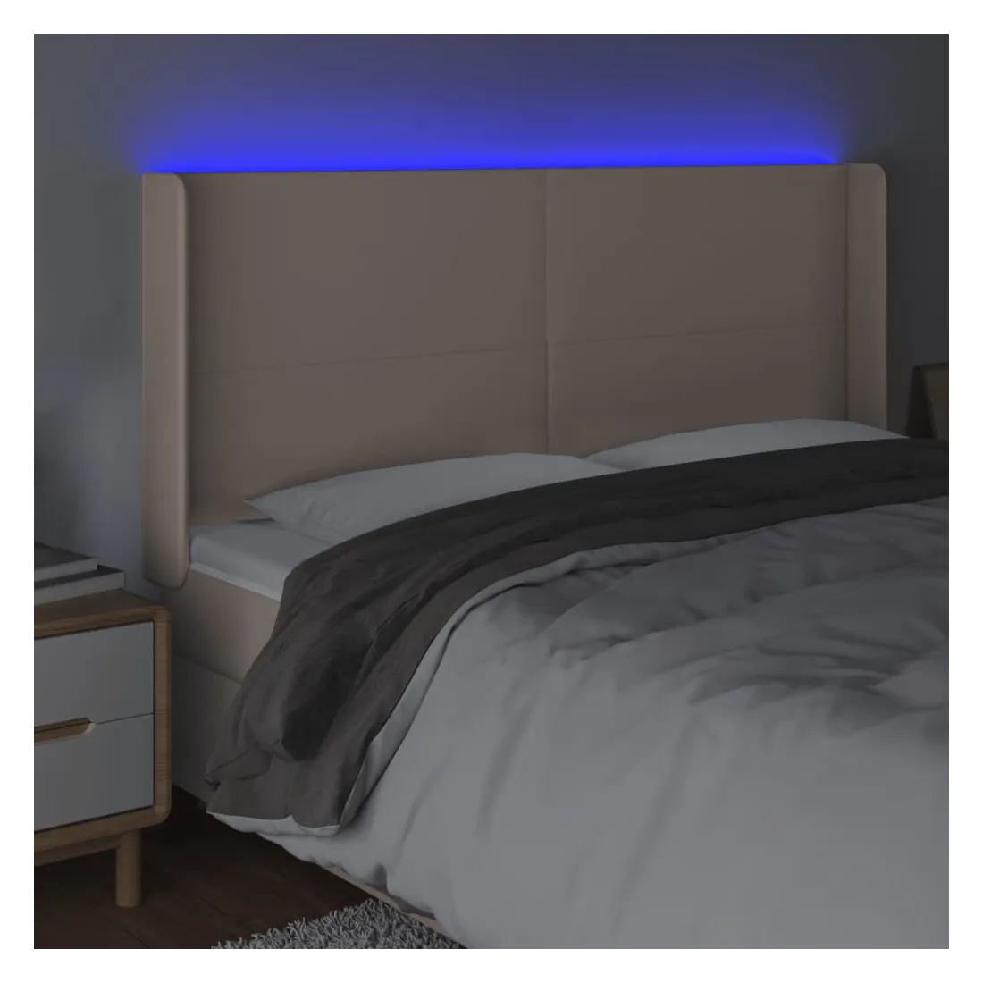 Cette tête de lit à LED classique, au design élégant, donne à votre cadre de lit une touche de modernité étonnante et convient parfaitement à toute chambre à coucher. Similicuir durable : le similicuir de qualité supérieure est un matériau très durable. Il est résistant aux taches, ce qui le rend facile à nettoyer avec un chiffon humide. La surface lisse donne également un aspect luxueux et la beauté du cuir véritable.LED colorée : apportez de l'éclairage dans l'obscurité avec des lumières LED colorées !Hauteur réglable : la tête de lit est réglable en hauteur selon vos préférences.Excellent soutien : la tête de lit vous offre un excellent soutien du dos lorsque vous êtes assis dans votre lit pour lire ou regarder la télévision.Bande à LED découpable : cette bande à LED flexible peut être ajustée en longueur. Le symbole des ciseaux indique où la bande peut être coupée en toute sécurité sans l'endommager. Remarque :Seule la partie avec un symbole de ciseaux peut être coupée et seule la partie avec l'USB continuera à fonctionner comme avant.Chaque produit est livré avec un manuel de montage dans la boîte pour un montage facile.Ce produit est doté d'un connecteur USB, mais la source d'alimentation certifiée de USB 5V n'est pas incluse.