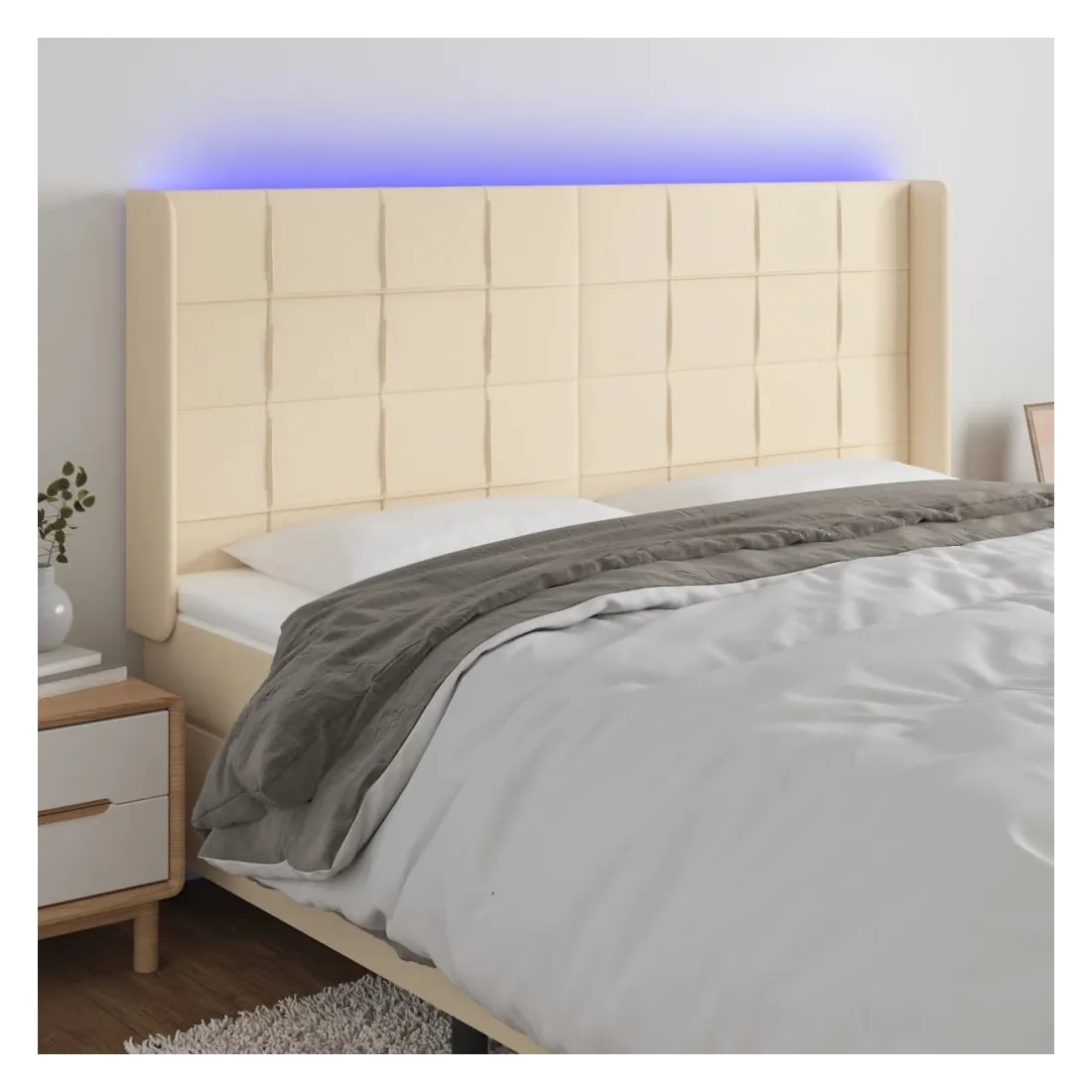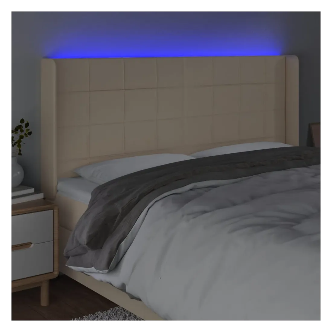 Cette tête de lit à LED classique, au design élégant, donne à votre cadre de lit une touche de modernité étonnante et convient parfaitement à toute chambre à coucher. Tissu durable : le tissu présente un aspect simple et épuré, et il est respirant et durable. LED colorée : apportez de l'éclairage dans l'obscurité avec des lumières LED colorées ! Hauteur réglable : la tête de lit est réglable en hauteur selon vos préférences. Excellent soutien : la tête de lit vous offre un excellent soutien du dos lorsque vous êtes assis dans votre lit pour lire ou regarder la télévision. Bande à LED découpable : cette bande à LED flexible peut être ajustée en longueur. Le symbole des ciseaux indique où la bande peut être coupée en toute sécurité sans l'endommager. Remarque : Seule la partie avec un sy