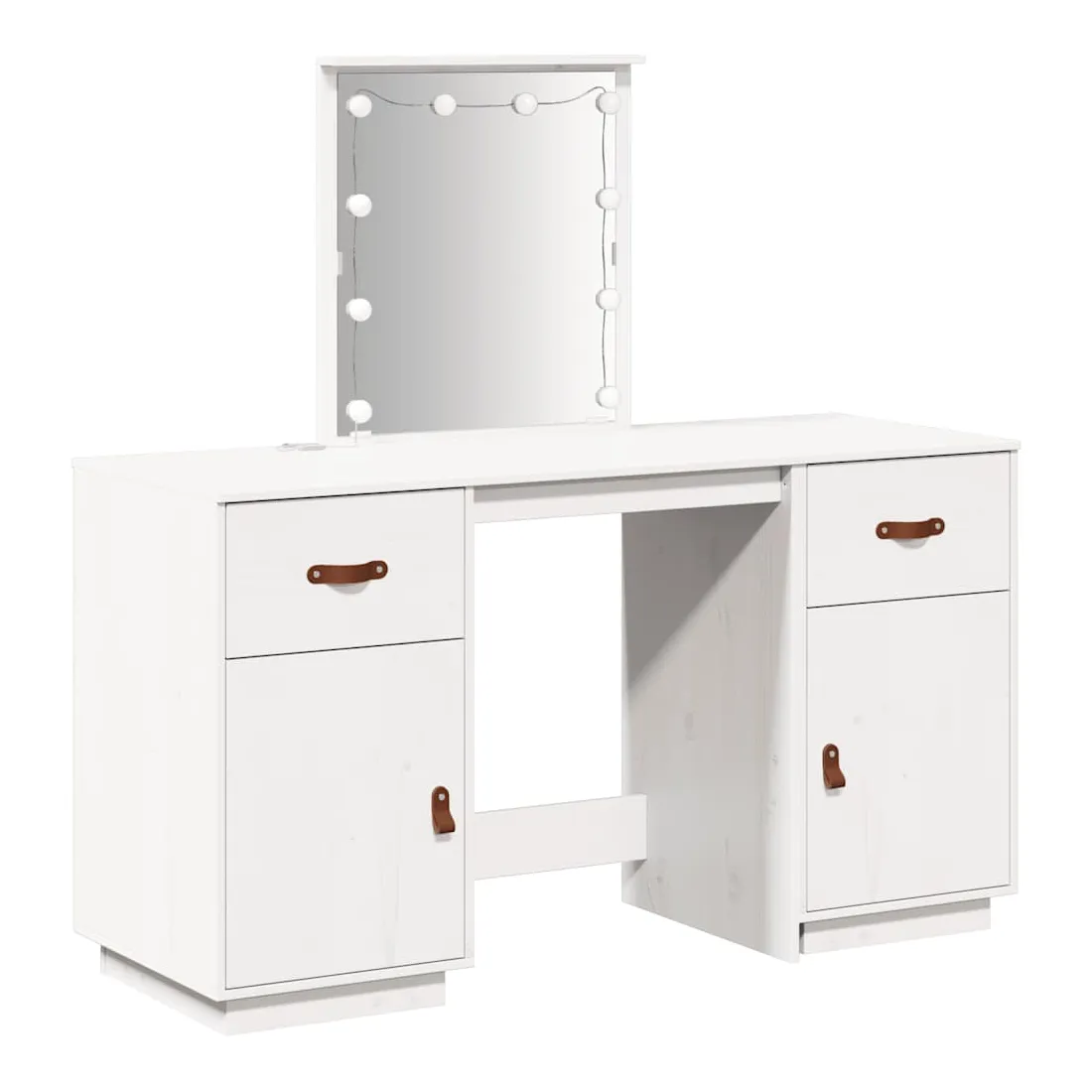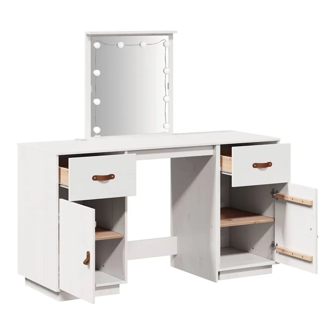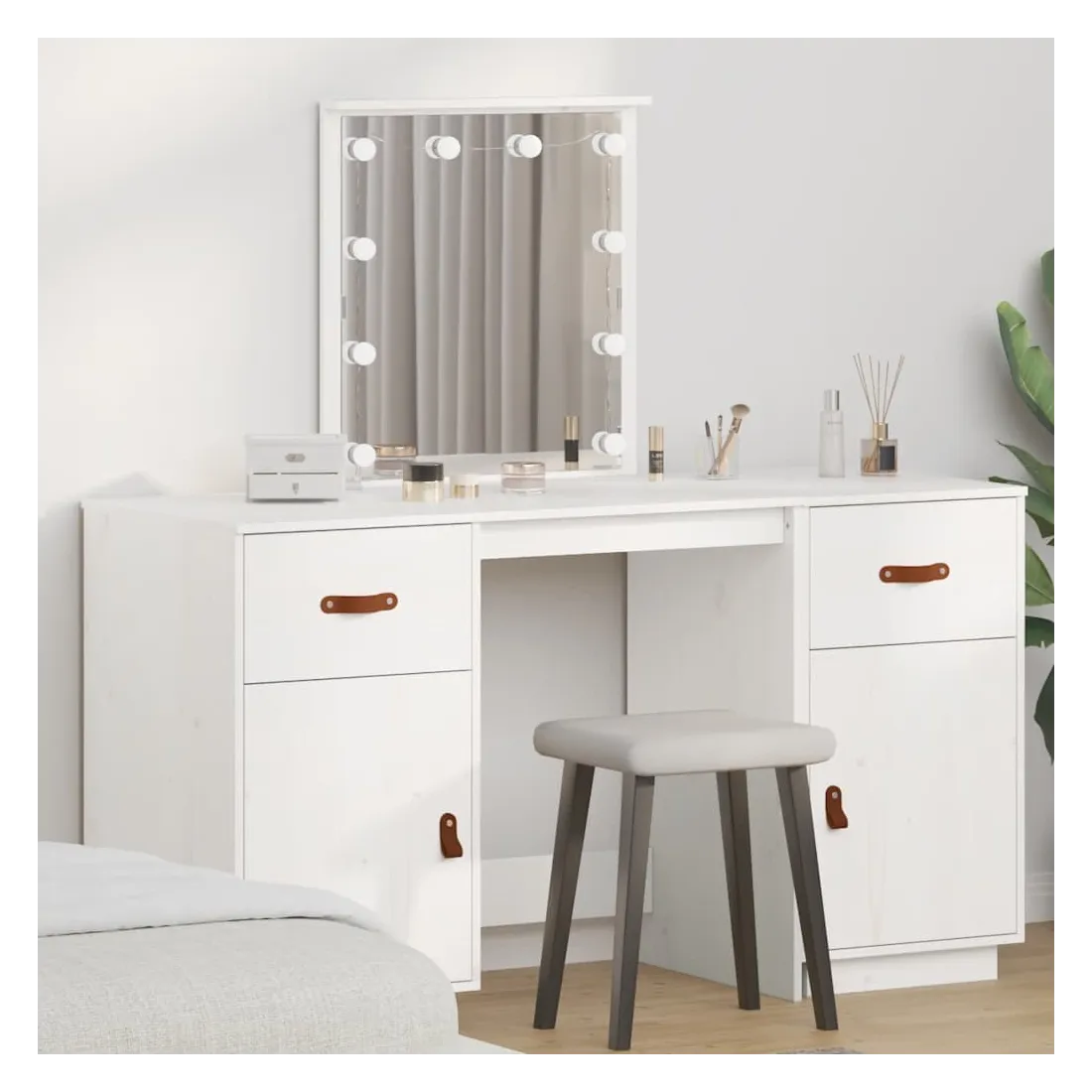 Cet ensemble de coiffeuse tendance en bois avec LED est un excellent supplément au décor de votre chambre à coucher. Bois de pin massif : le bois de pin massif est un matériau naturel magnifique. Le bois de pin a un grain droit et les nœuds donnent au matériau son aspect caractéristique et rustique.Grand espace de rangement : la table de maquillage offre suffisamment d'espace pour accéder facilement à vos produits de maquillage, bijoux et articles essentiels du quotidien.Miroir utilitaire : le magnifique miroir inclus offre une vue claire pour l'application du maquillage et ajoute une touche élégante à la coiffeuse.Lumière LED : la coiffeuse est équipée d'ampoules LED avec USB, qui permettent de passer facilement du blanc chaud au blanc froid. Les ampoules LED autour du miroir illuminent également votre beauté.Porte pratique : gardez vos essentiels à l'abri de la poussière en les cachant derrière la porte de cette coiffeuse. Attention :Afin d'éviter qu'il ne bascule, ce produit doit être utilisé avec le dispositif de fixation murale fourni. Remarque :Chaque produit est livré avec un manuel de montage dans la boîte pour un montage facile.