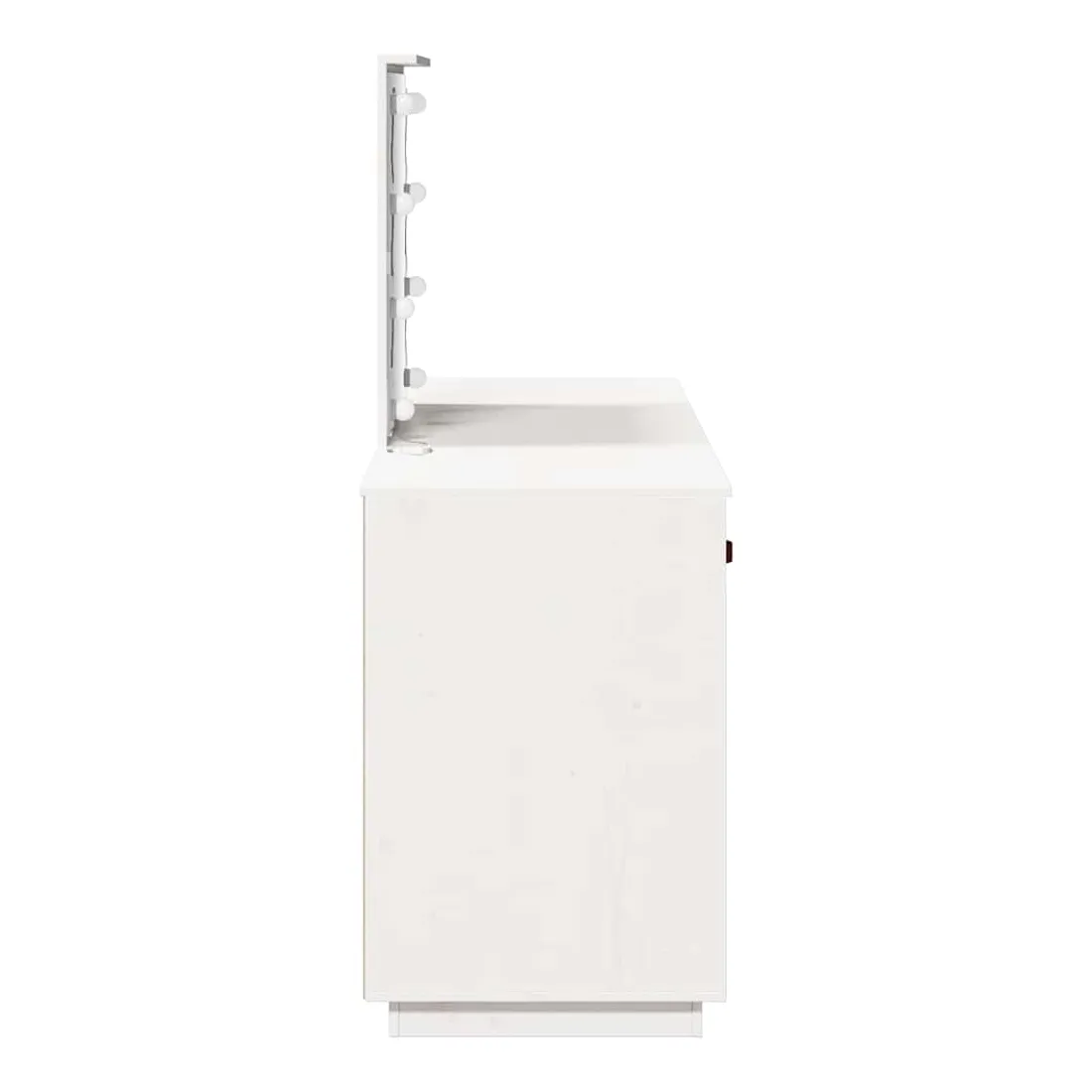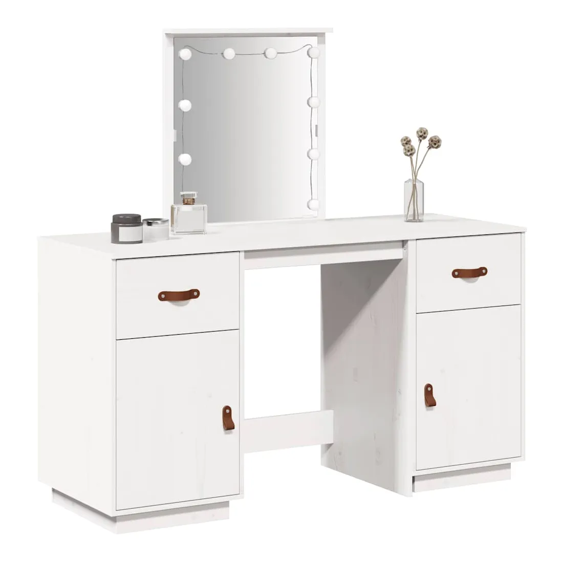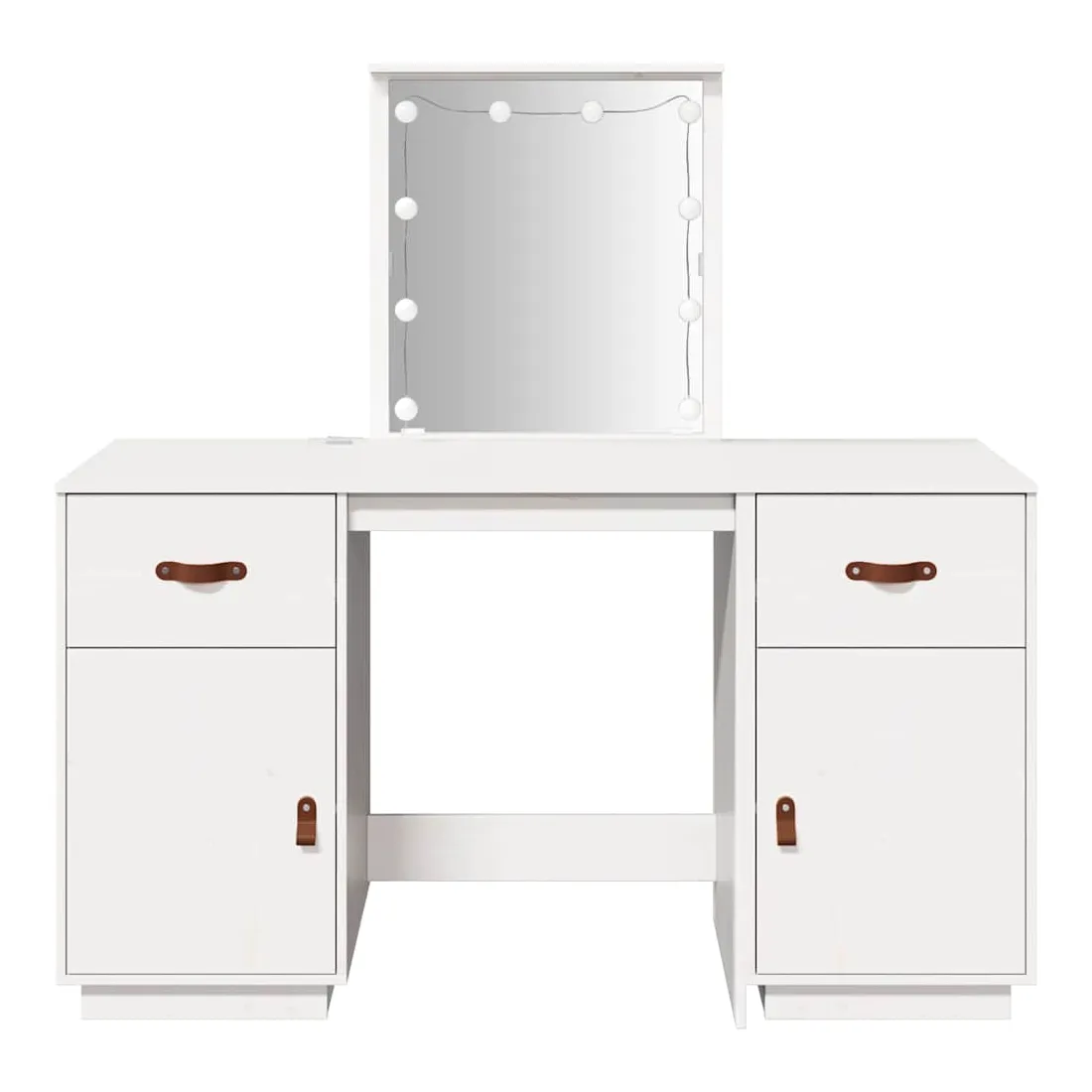 Cet ensemble de coiffeuse tendance en bois avec LED est un excellent supplément au décor de votre chambre à coucher. Bois de pin massif : le bois de pin massif est un matériau naturel magnifique. Le bois de pin a un grain droit et les nœuds donnent au matériau son aspect caractéristique et rustique.Grand espace de rangement : la table de maquillage offre suffisamment d'espace pour accéder facilement à vos produits de maquillage, bijoux et articles essentiels du quotidien.Miroir utilitaire : le magnifique miroir inclus offre une vue claire pour l'application du maquillage et ajoute une touche élégante à la coiffeuse.Lumière LED : la coiffeuse est équipée d'ampoules LED avec USB, qui permettent de passer facilement du blanc chaud au blanc froid. Les ampoules LED autour du miroir illuminent également votre beauté.Porte pratique : gardez vos essentiels à l'abri de la poussière en les cachant derrière la porte de cette coiffeuse. Attention :Afin d'éviter qu'il ne bascule, ce produit doit être utilisé avec le dispositif de fixation murale fourni. Remarque :Chaque produit est livré avec un manuel de montage dans la boîte pour un montage facile.